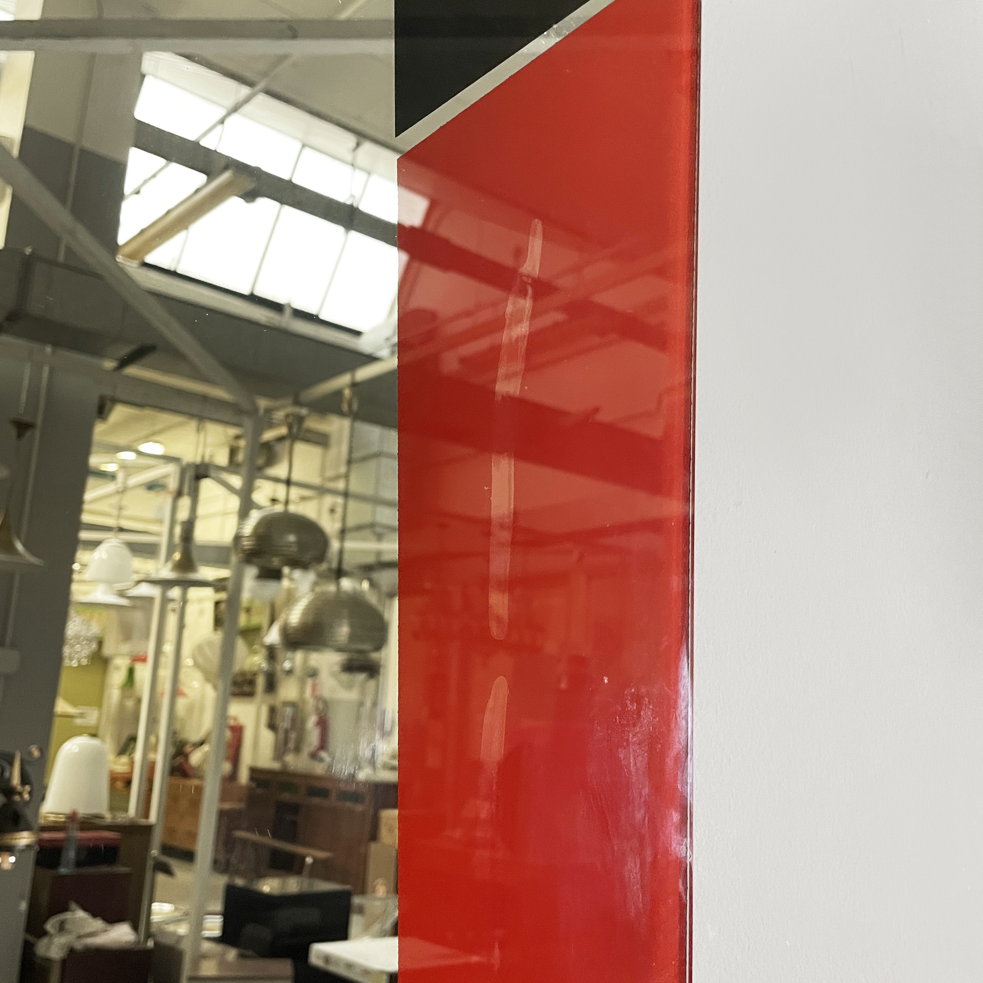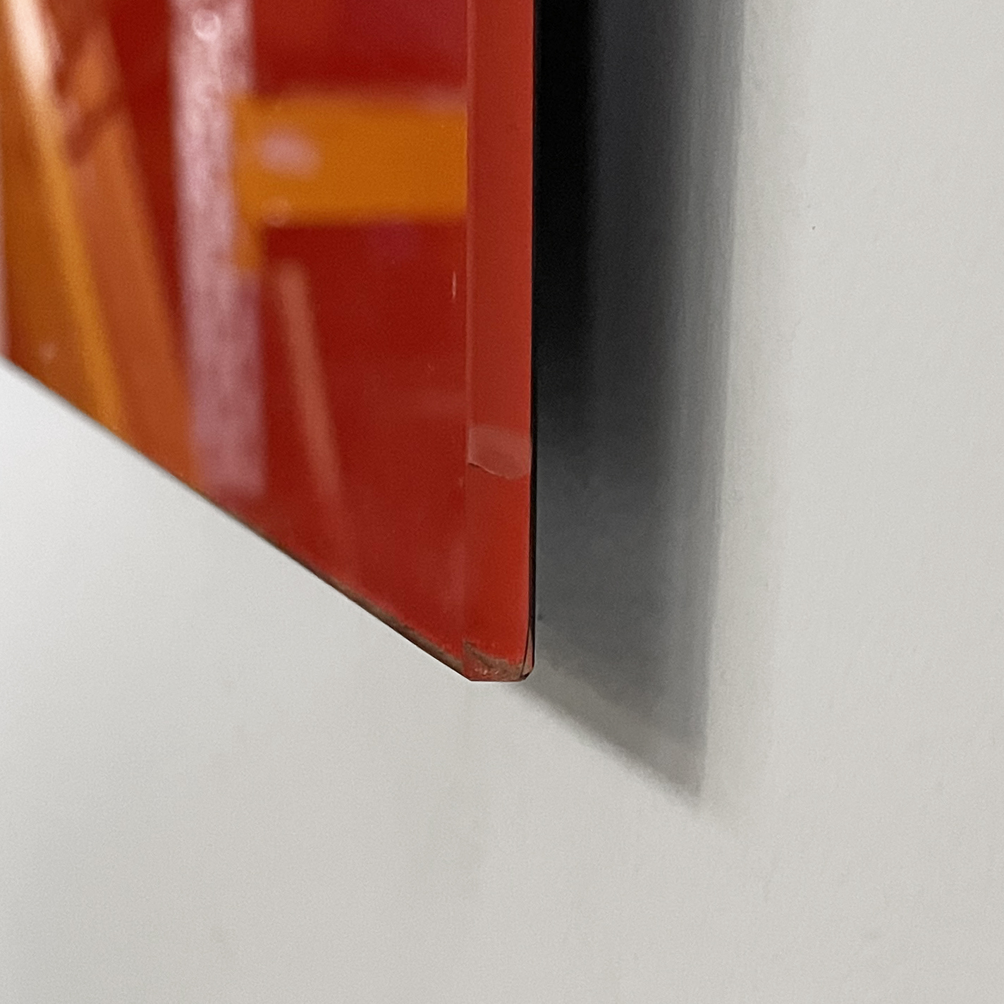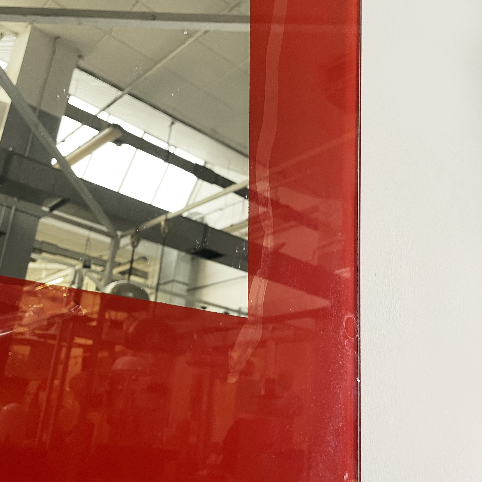 Specchio da parete rettangolare con disegno grafico in rosso e nero sulla cornice. In un angolo sono presenti delle strisce decorative in rosso e grigio chiaro.