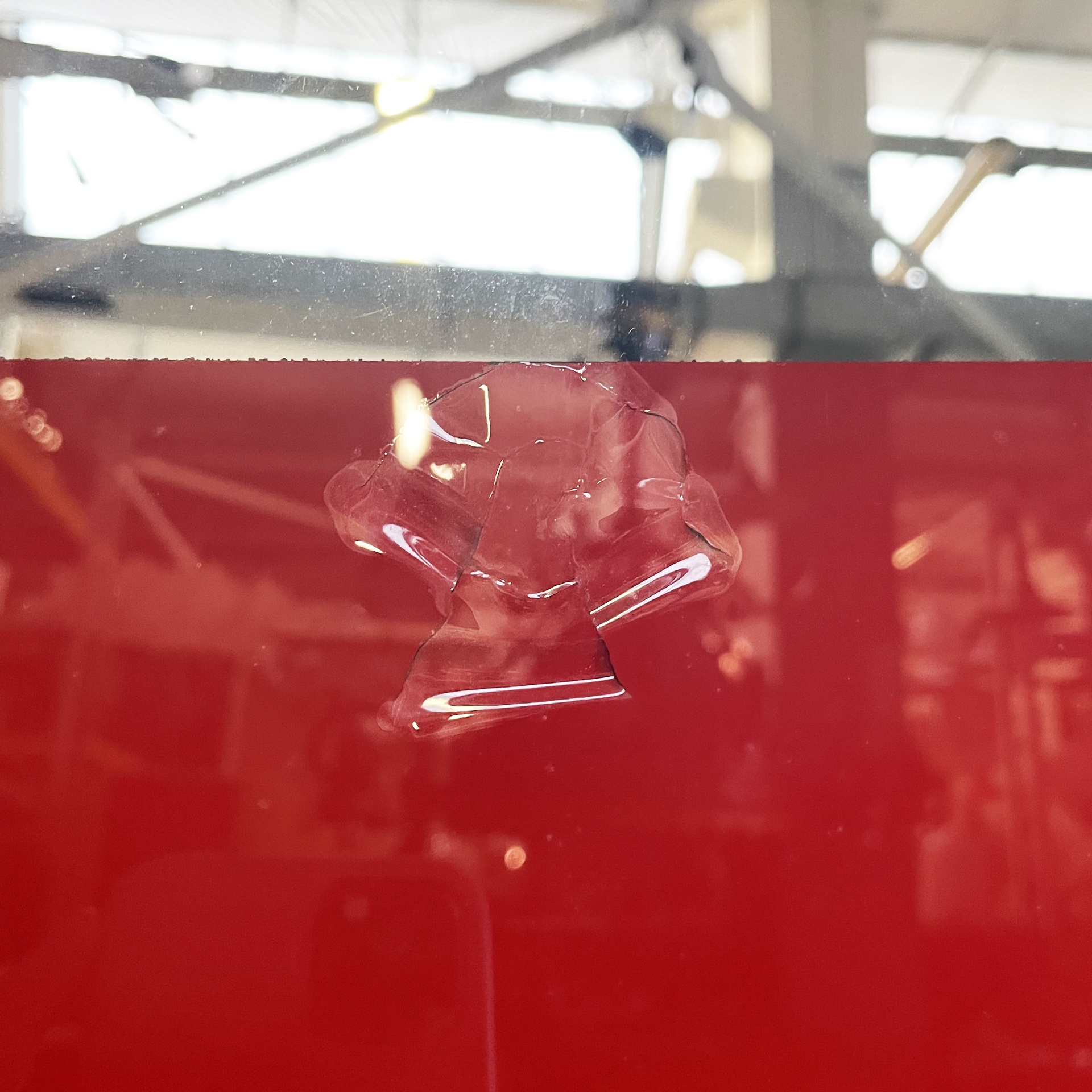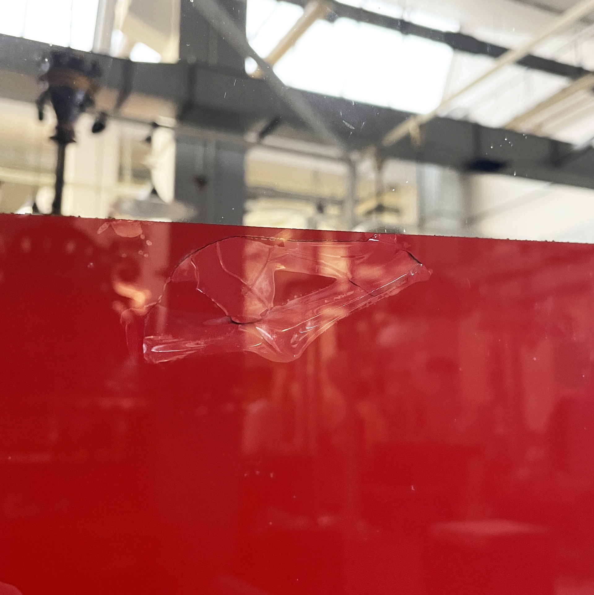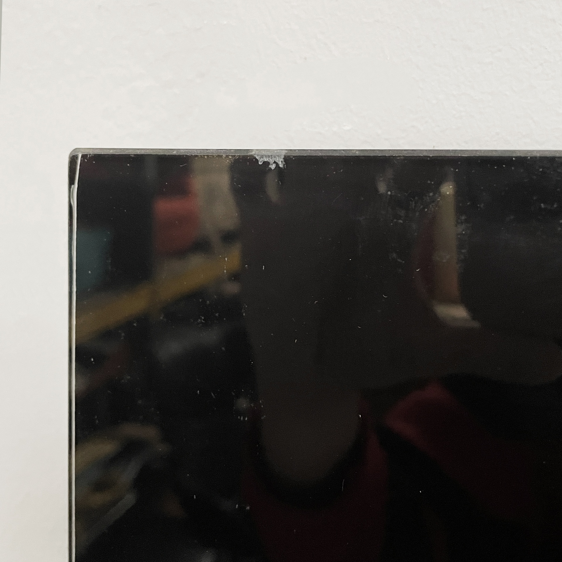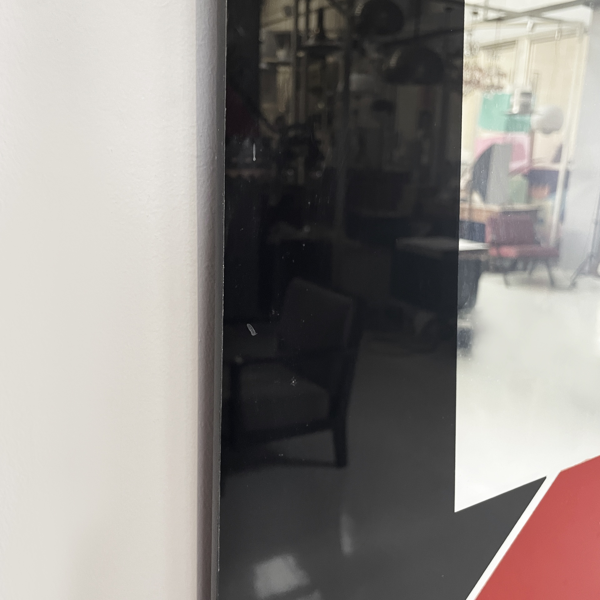 Specchio da parete rettangolare con disegno grafico in rosso e nero sulla cornice. In un angolo sono presenti delle strisce decorative in rosso e grigio chiaro.