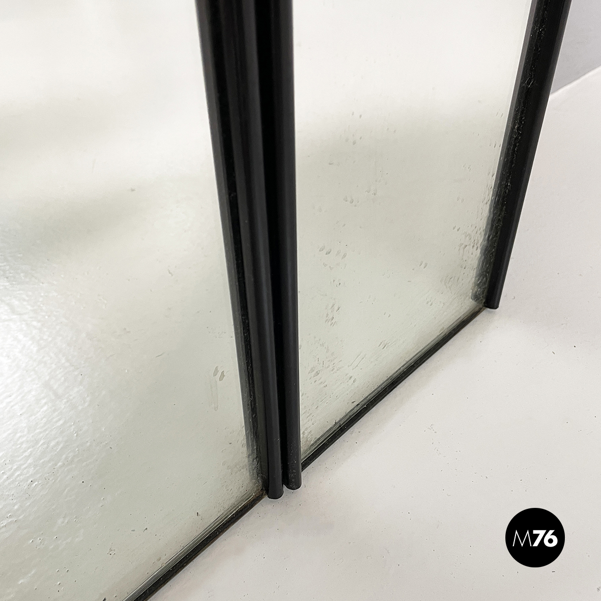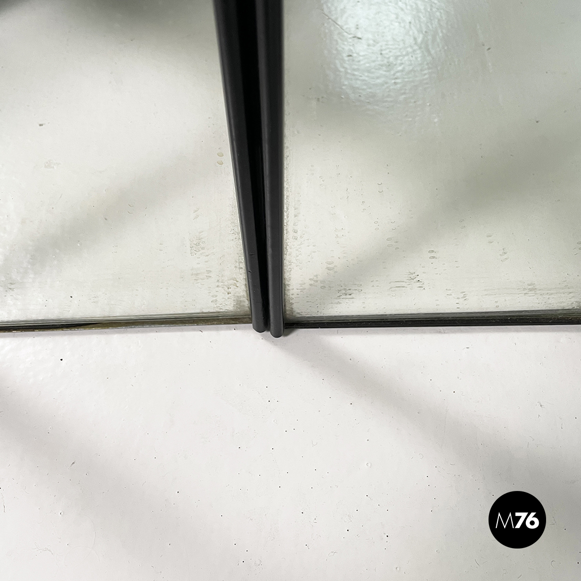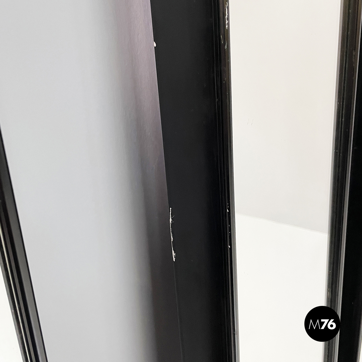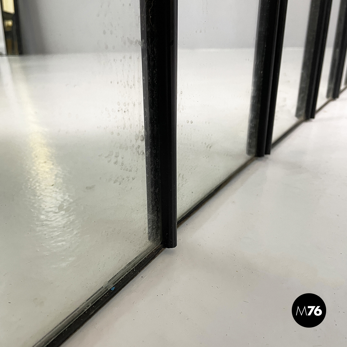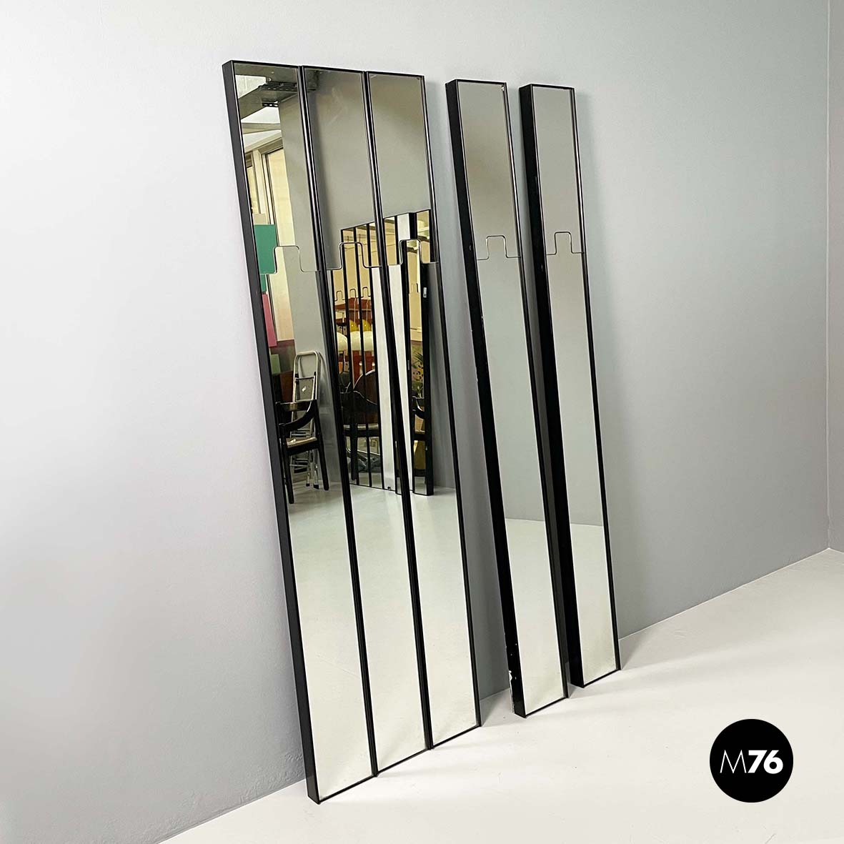 Specchio da parete modello Gronda composto da cinque moduli rettangolari. La struttura della cornice è in plastica nera. La particolarità di questo specchio è che presenta un gancio a scomparsa, utilizzabile come appendiabiti. I singoli moduli possono essere usati uno a fianco dell’altro o separatamente.
