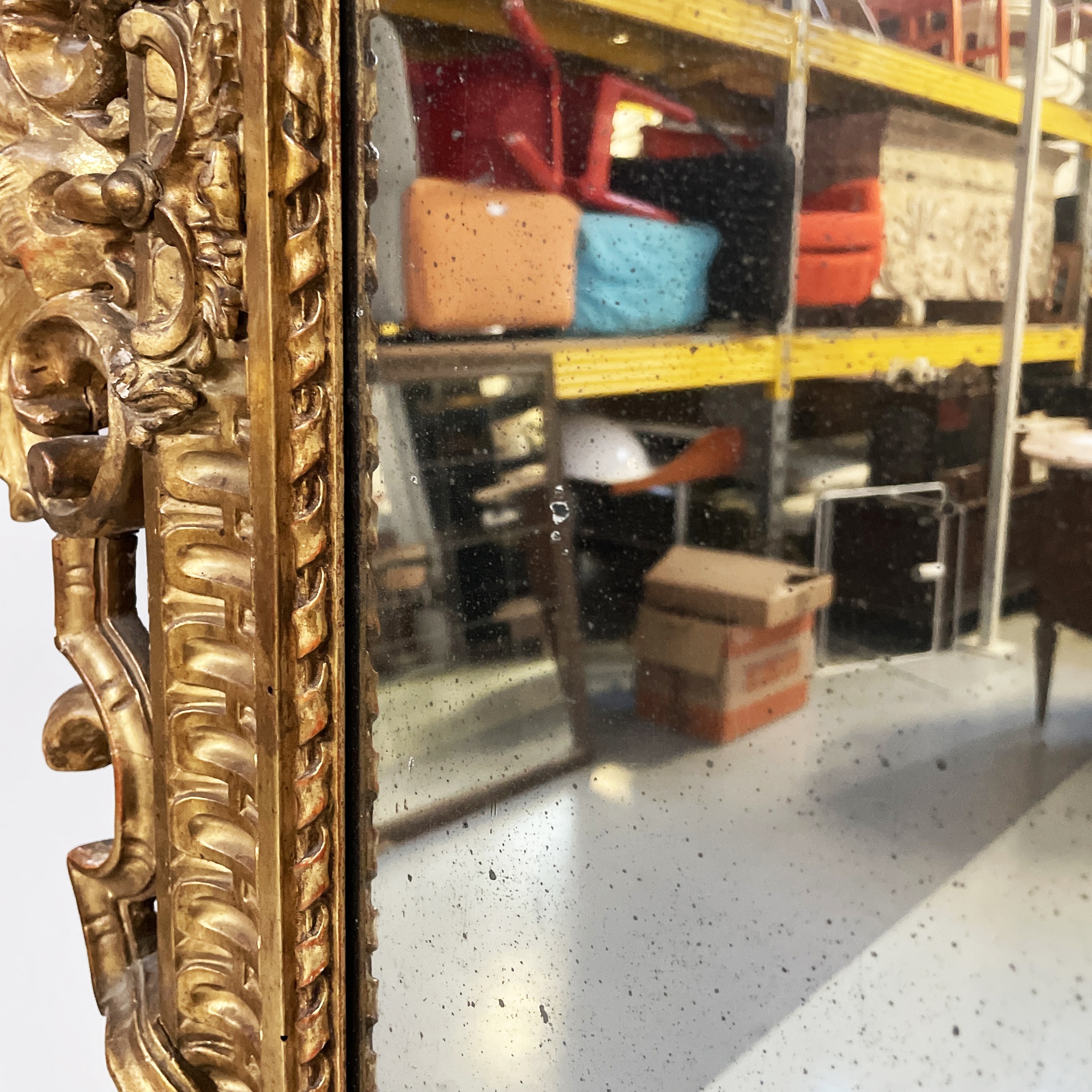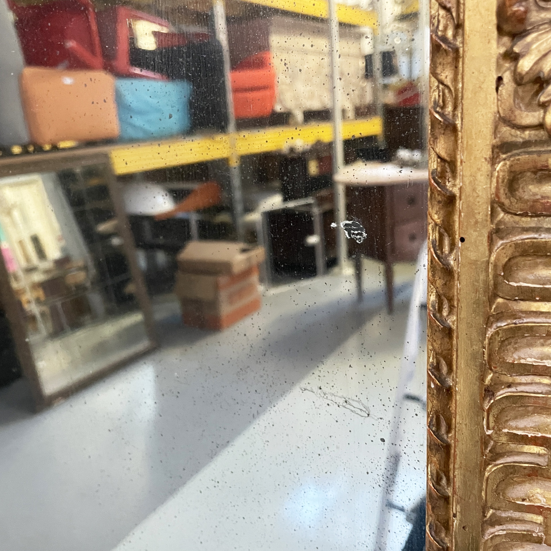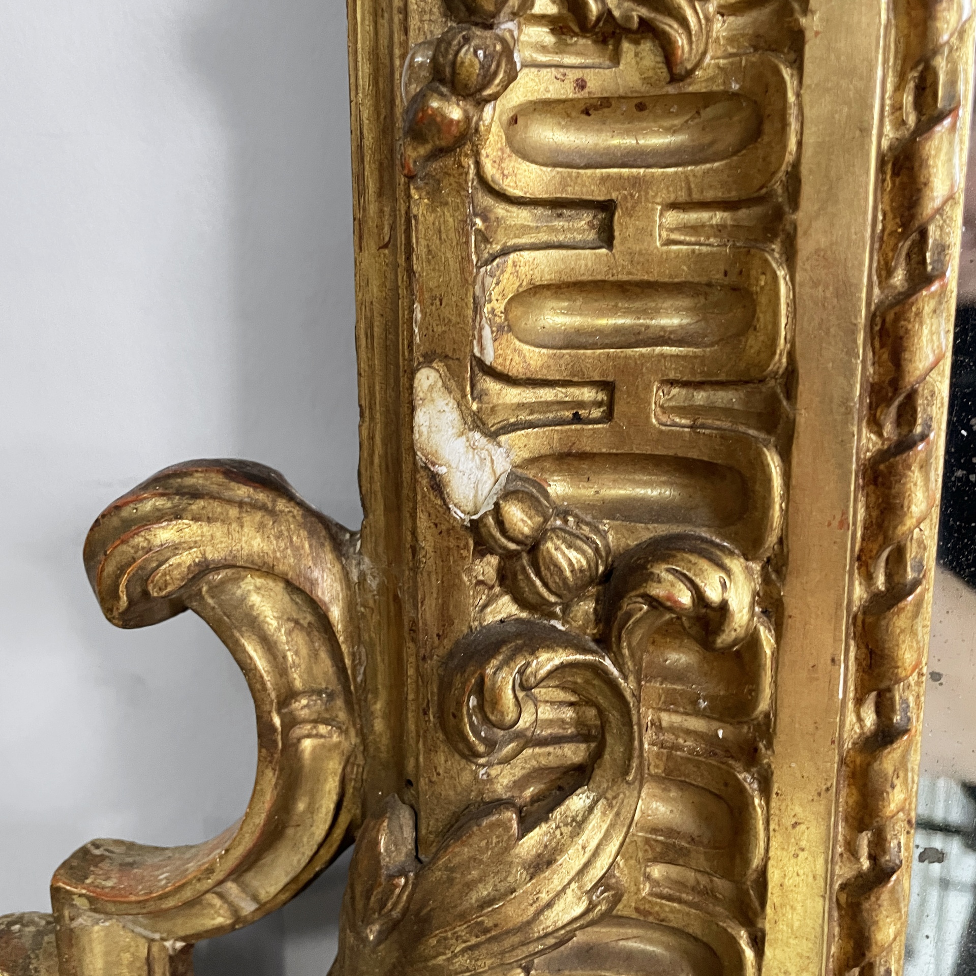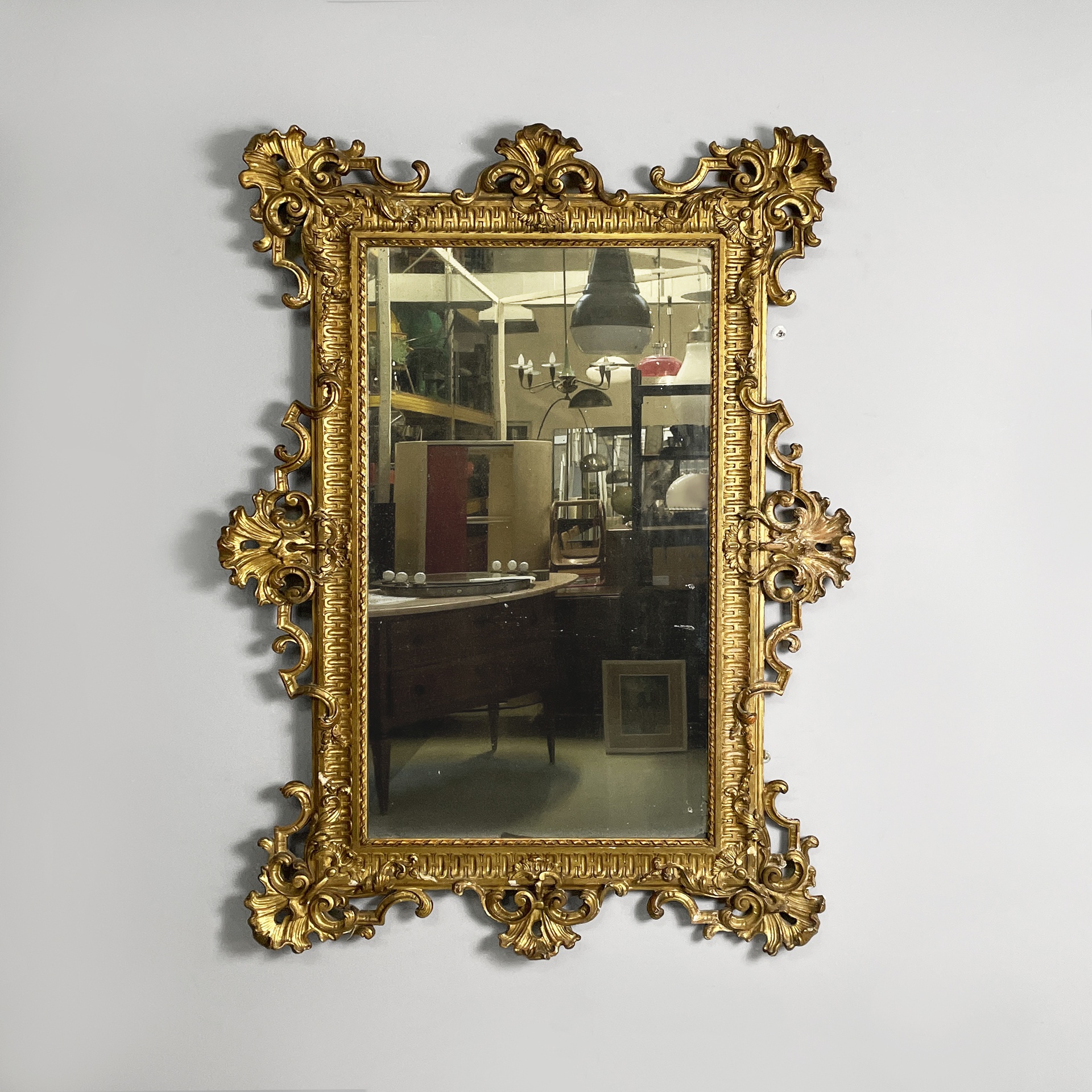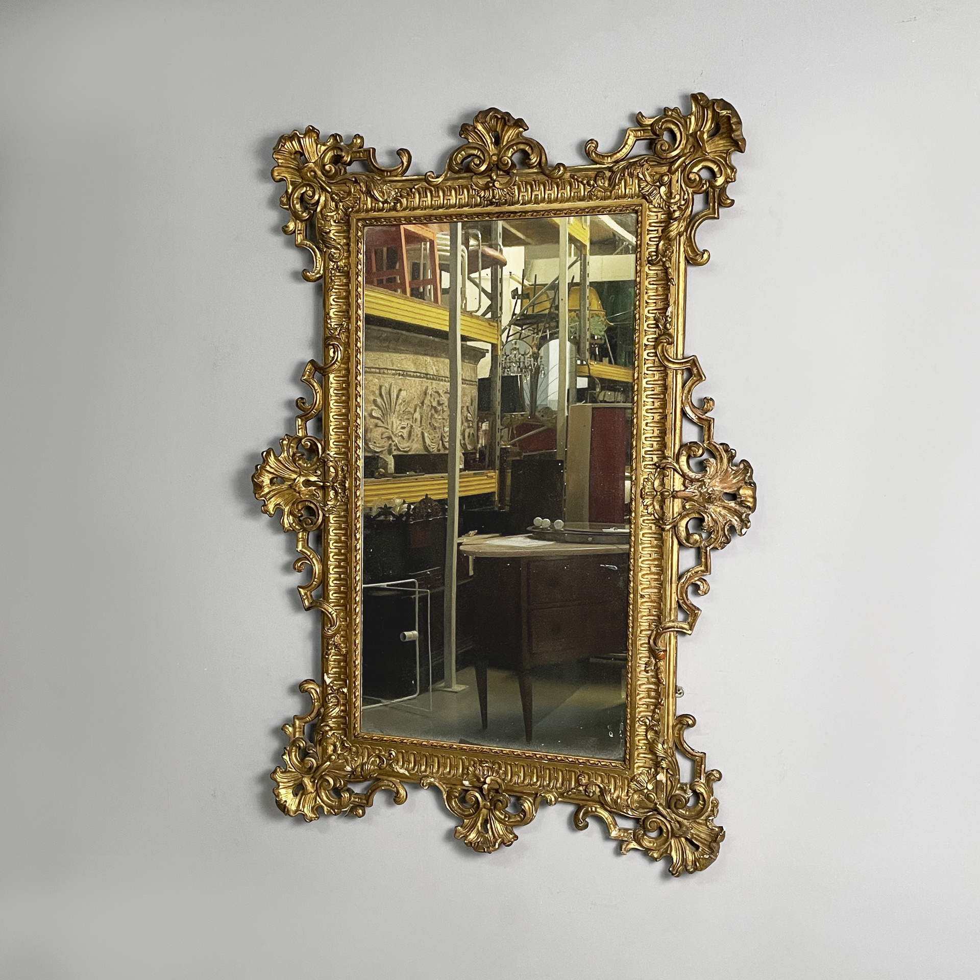 Specchio da parete rettangolare con cornice finemente lavorata con riccioli decorativi in legno con finitura dorata. In stil Umbertino (fine 1800 ca.).