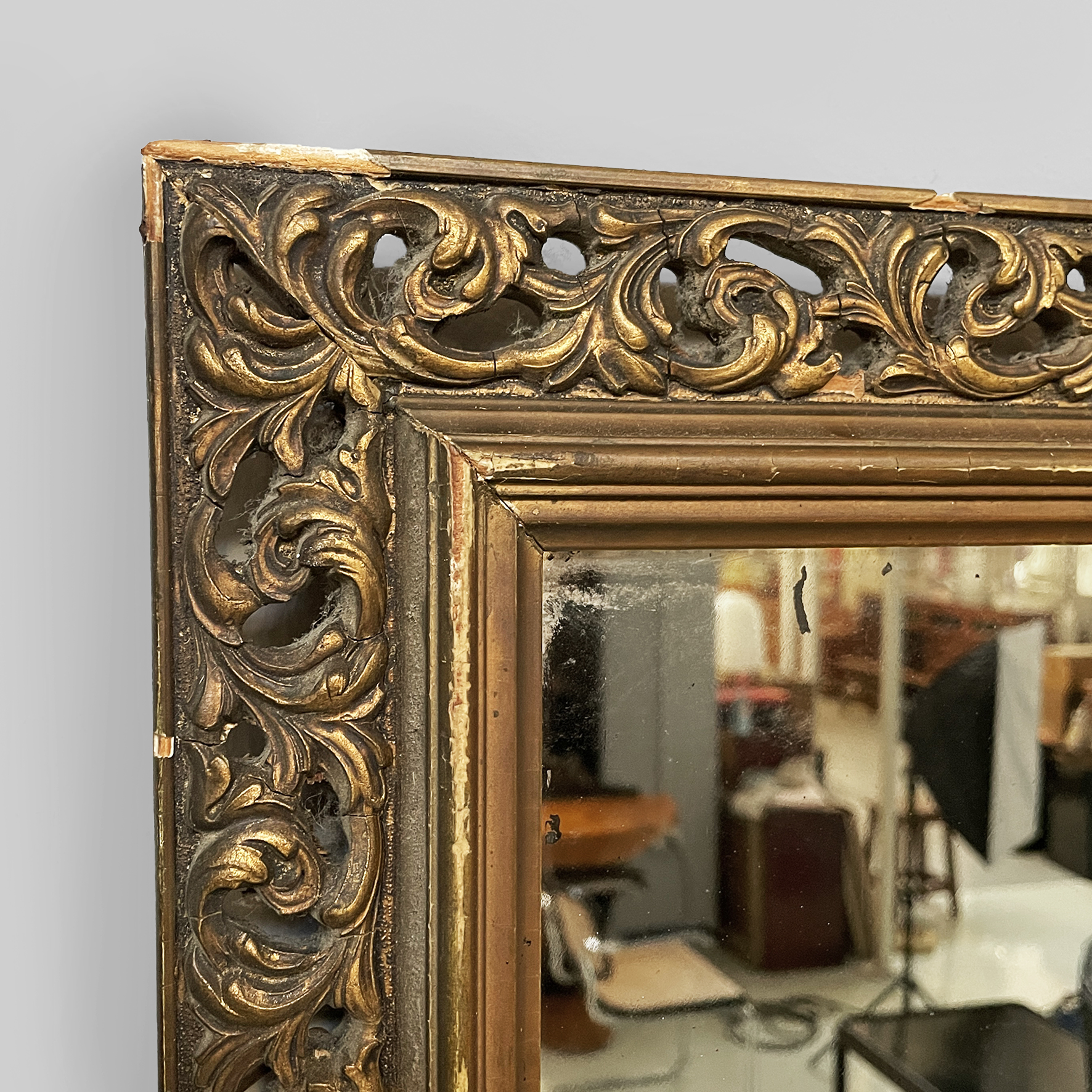 Specchio da parete rettangolare con cornice finemente lavorata con riccioli decorativi in legno con finitura dorata.