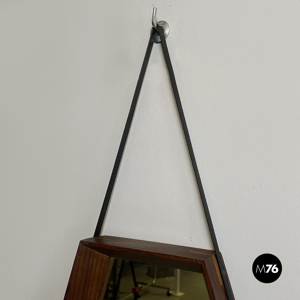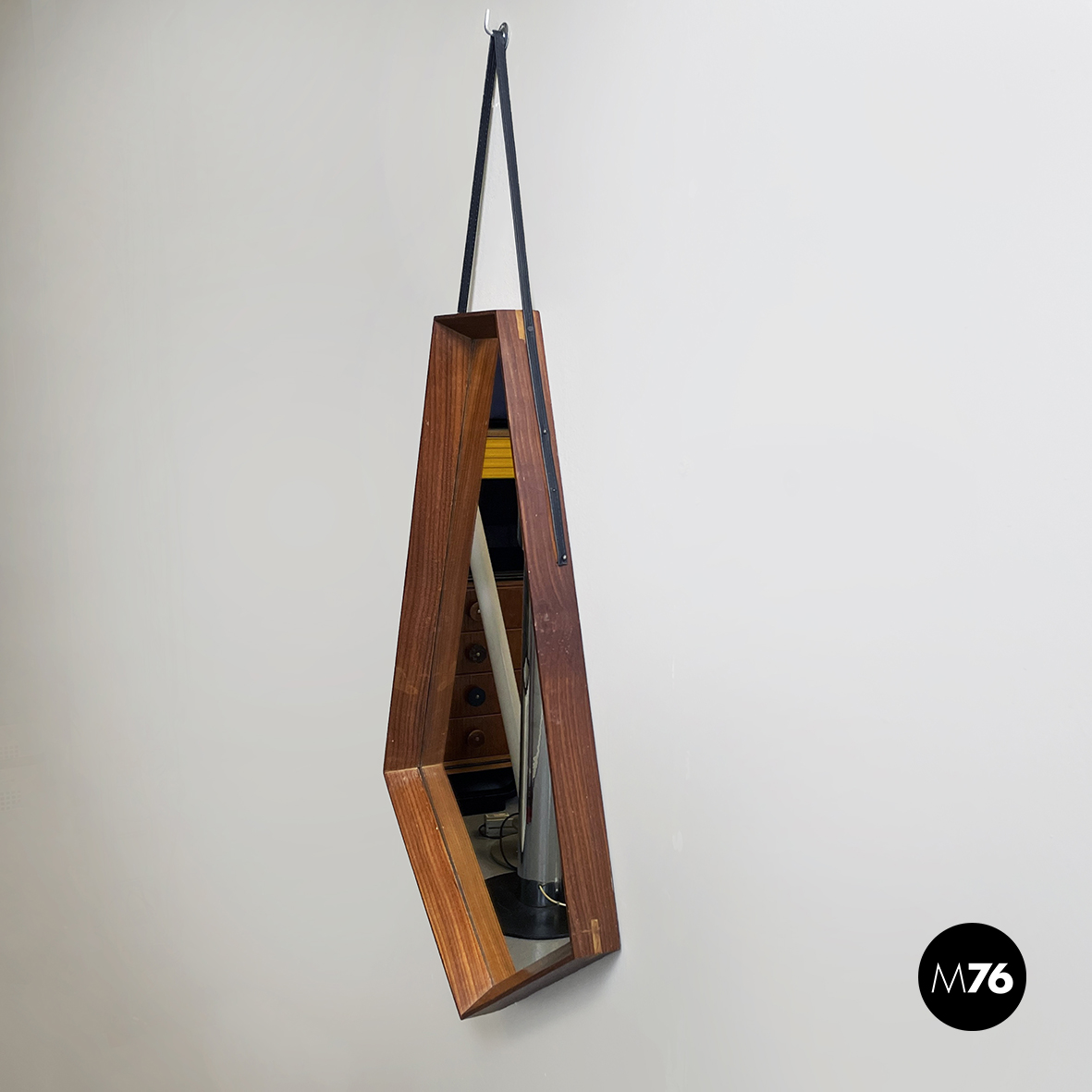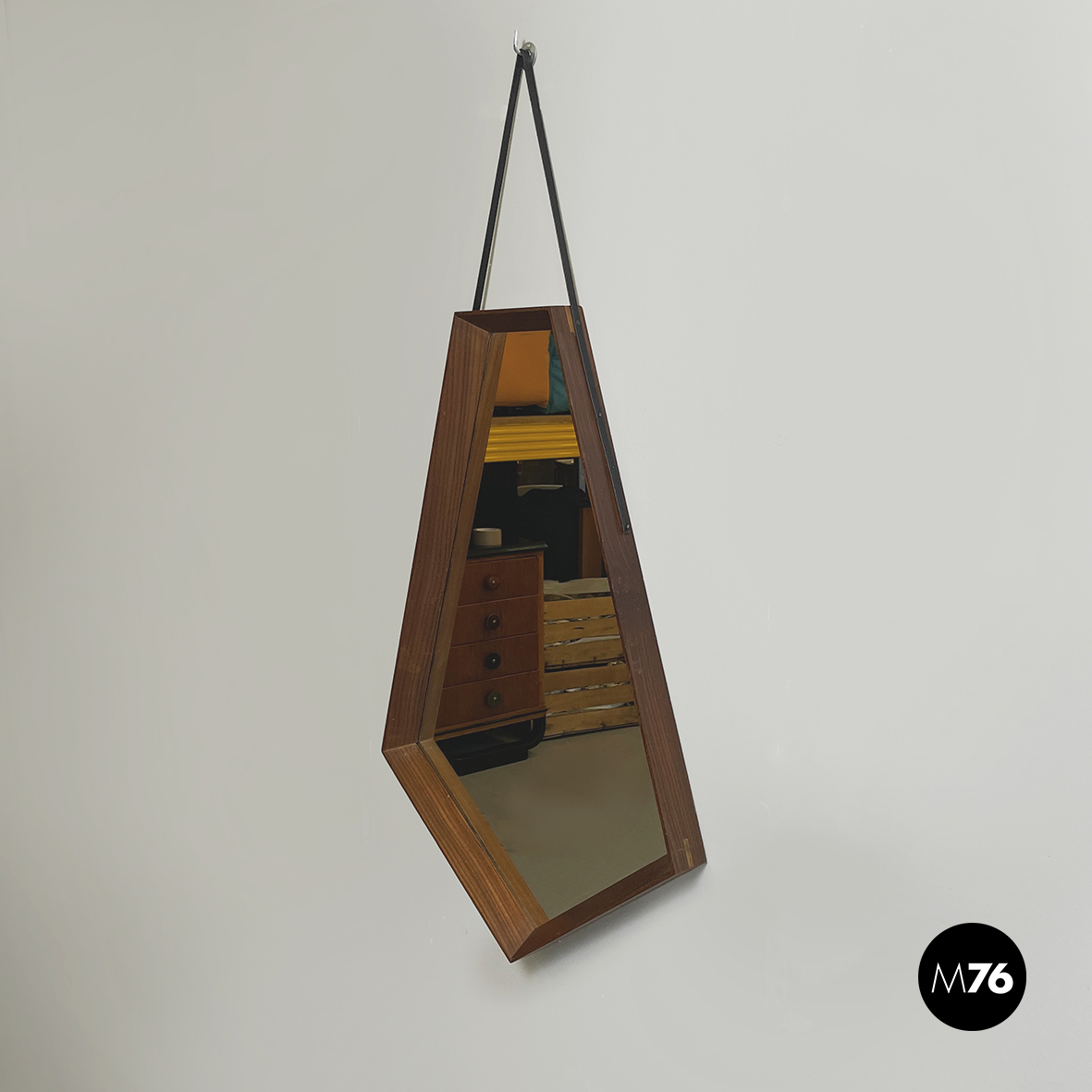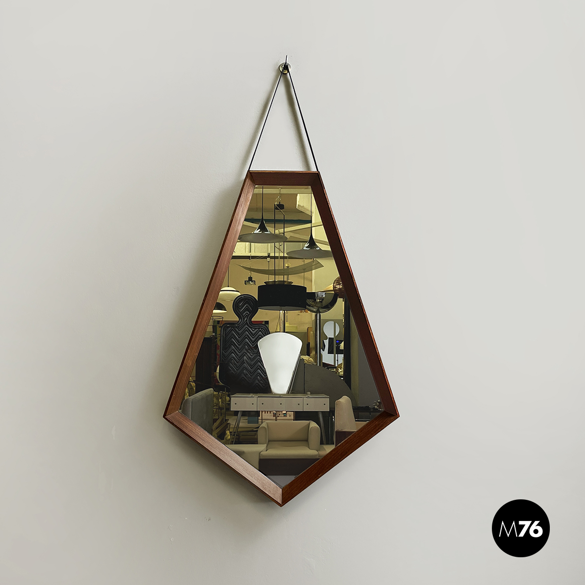 Specchio da parete con cornice spessa in legno. La forma dello specchio è simmetrica e geometrica, infatti ricorda un romboide. Nella parte superiore presenta un cordino in pelle nera.