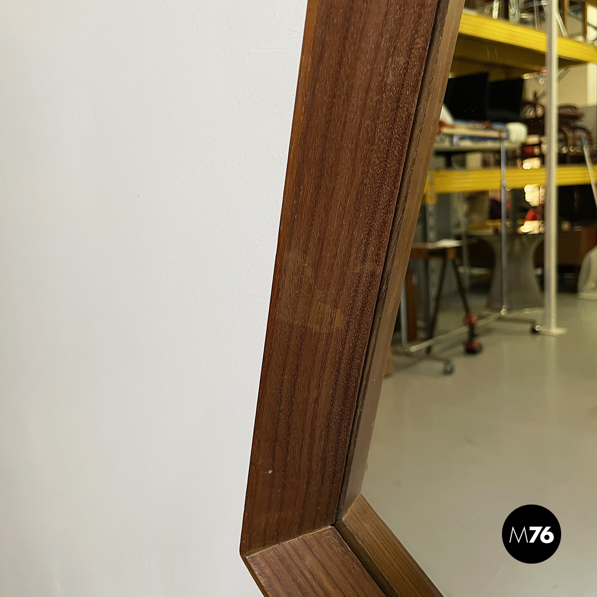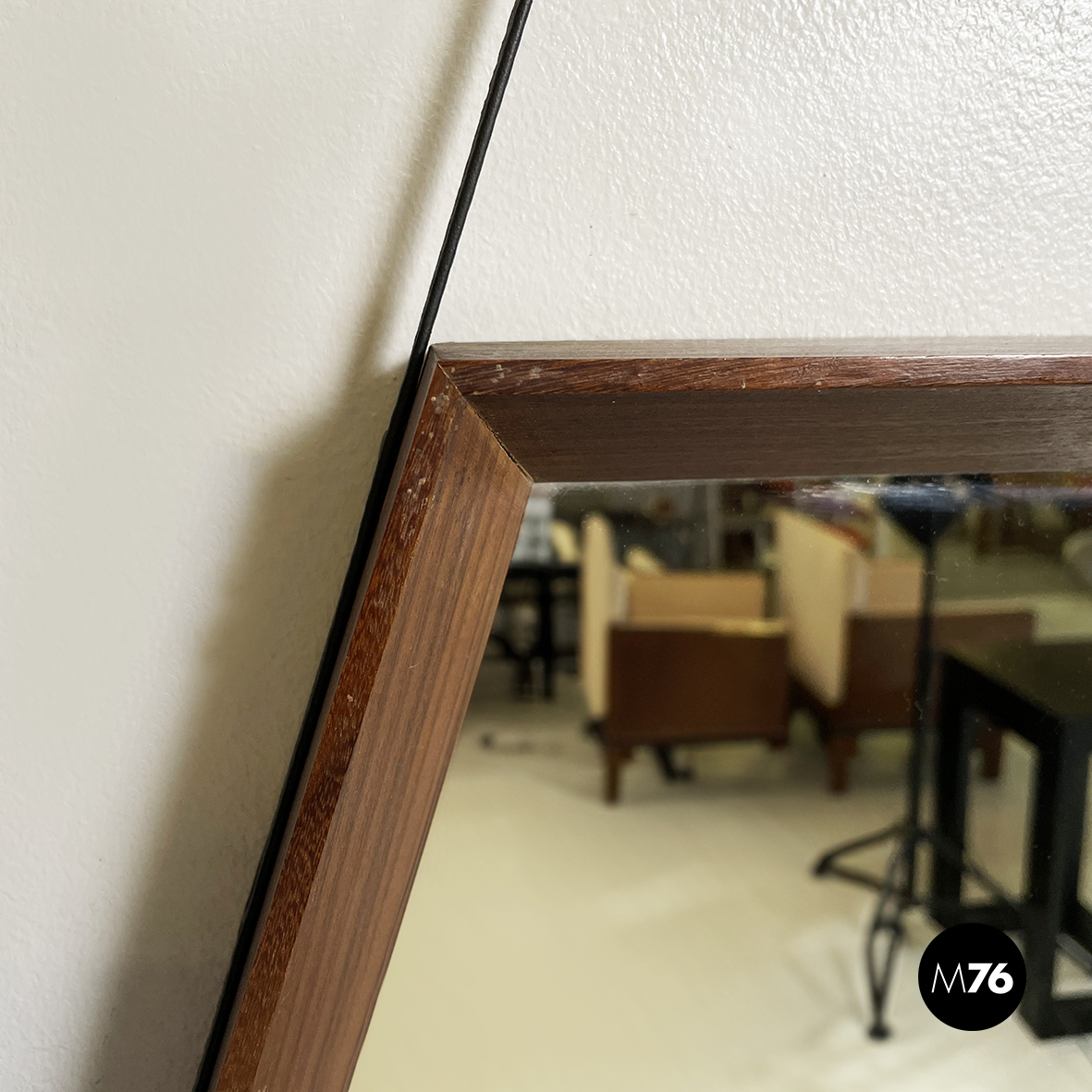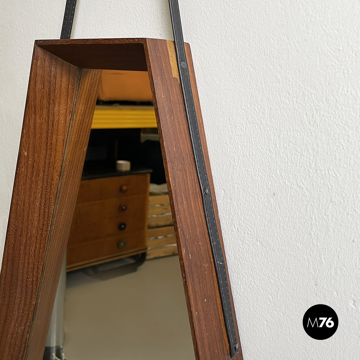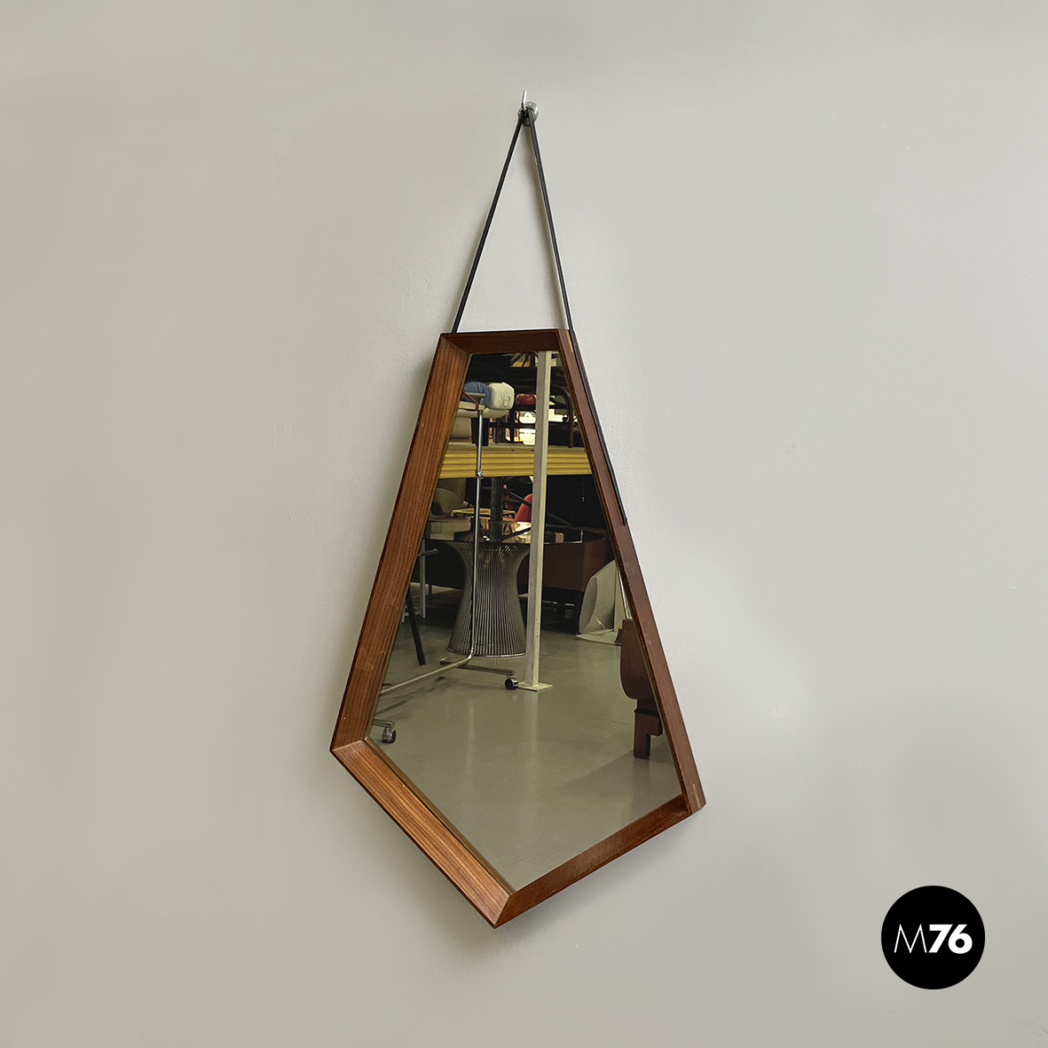 Specchio da parete con cornice spessa in legno. La forma dello specchio è simmetrica e geometrica, infatti ricorda un romboide. Nella parte superiore presenta un cordino in pelle nera.