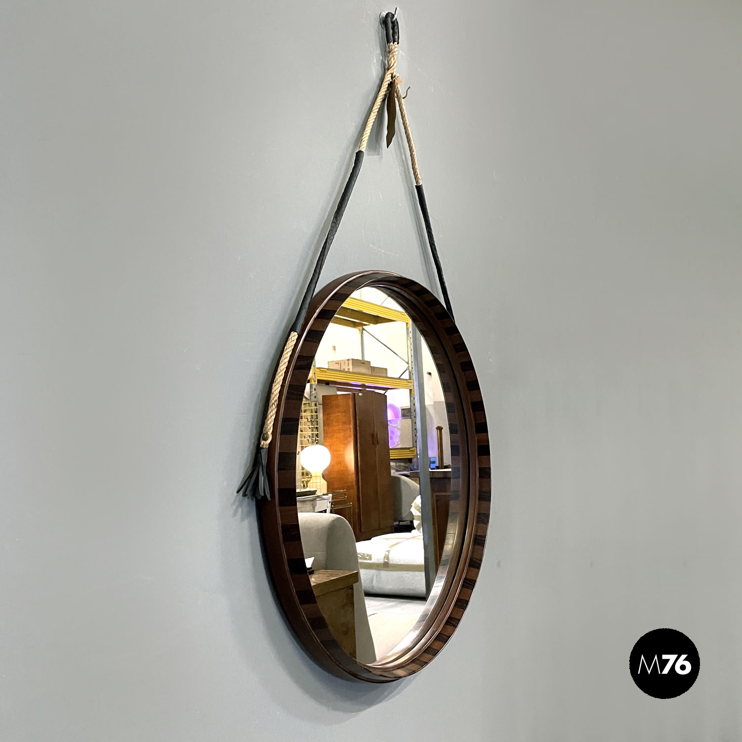 Specchio da parete tondo in legno. La cornice di grosso spessore è composta dall’alternarsi di due legni di colorazioni diverse a creare una decorazione geometrica regolare. Per appendere lo specchio alla parete è presente una corda, fissata con due borchie in ottone, con un’occhiello nella parte superiore. La parte della corda che forma l’occhiello e le due parte finali sono rivestite in pelle nera e terminano con due nappe decorative sempre in pelle nera.
