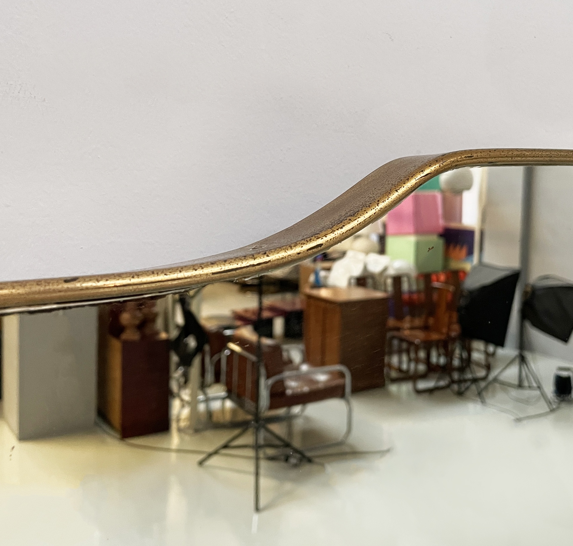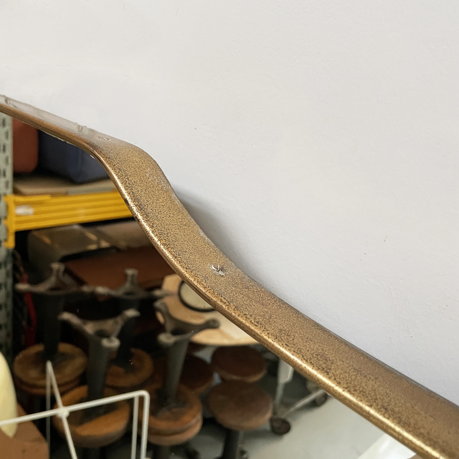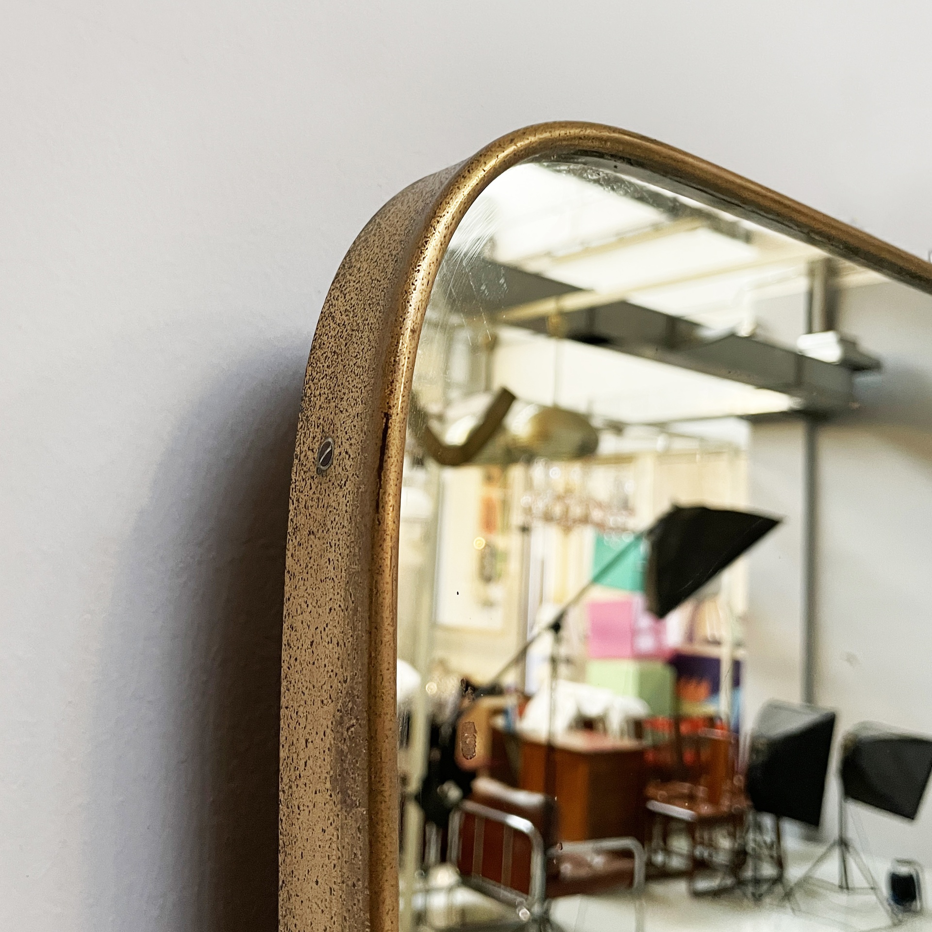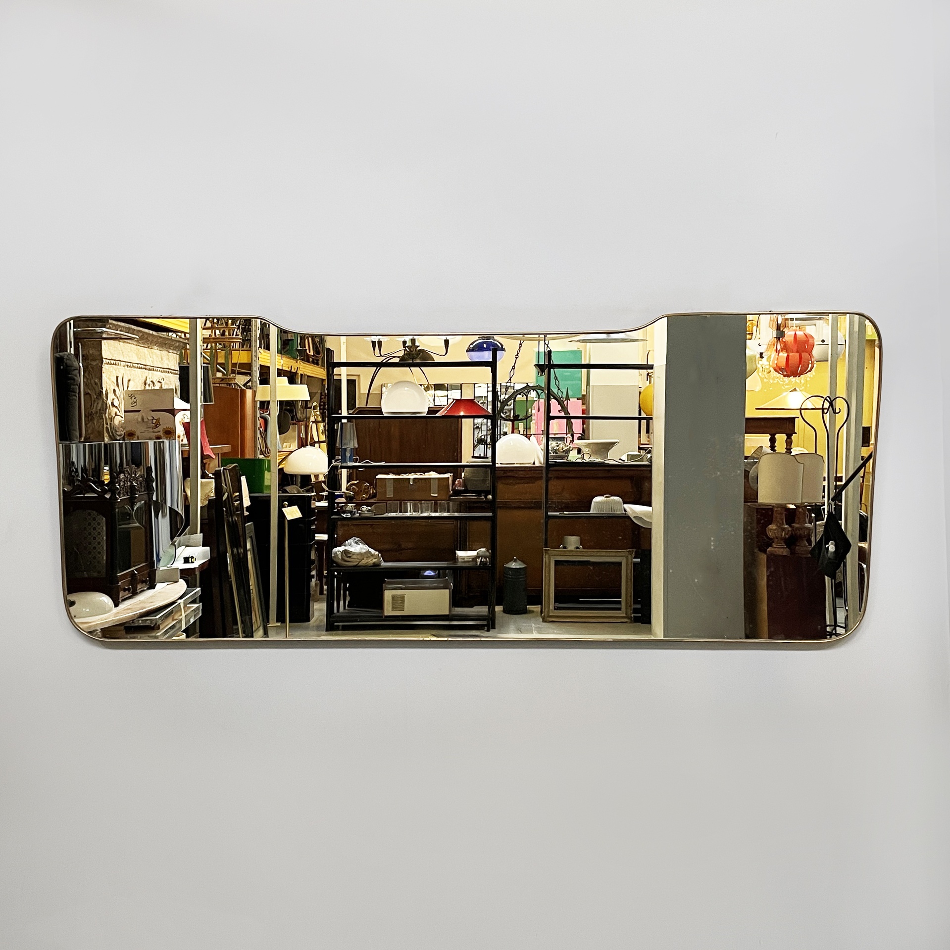 Specchio da parete sagomato ad angoli arrotondati con cornice in ottone. Lo specchio di grosse dimensioni presenta due ganci per l’attacco a parete.