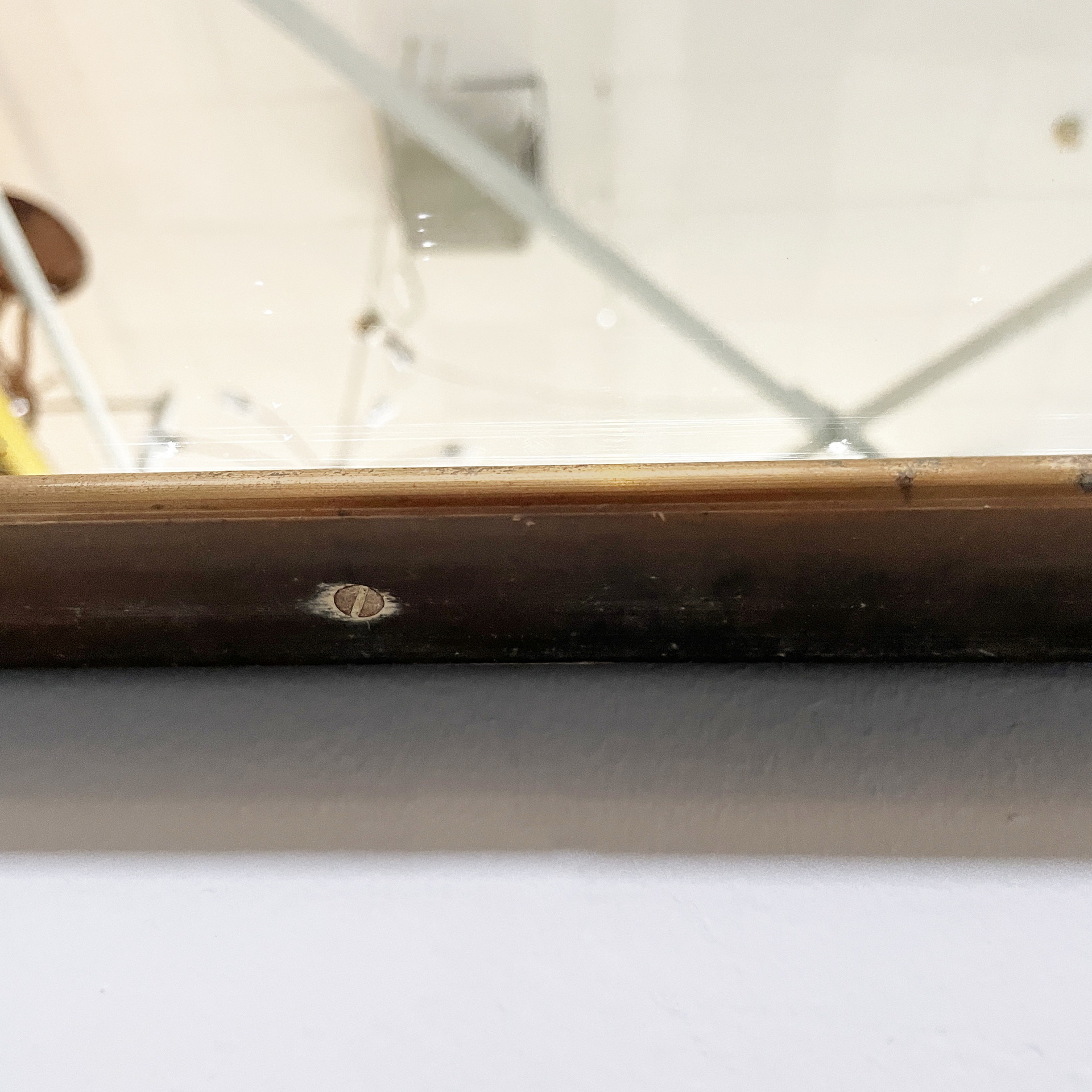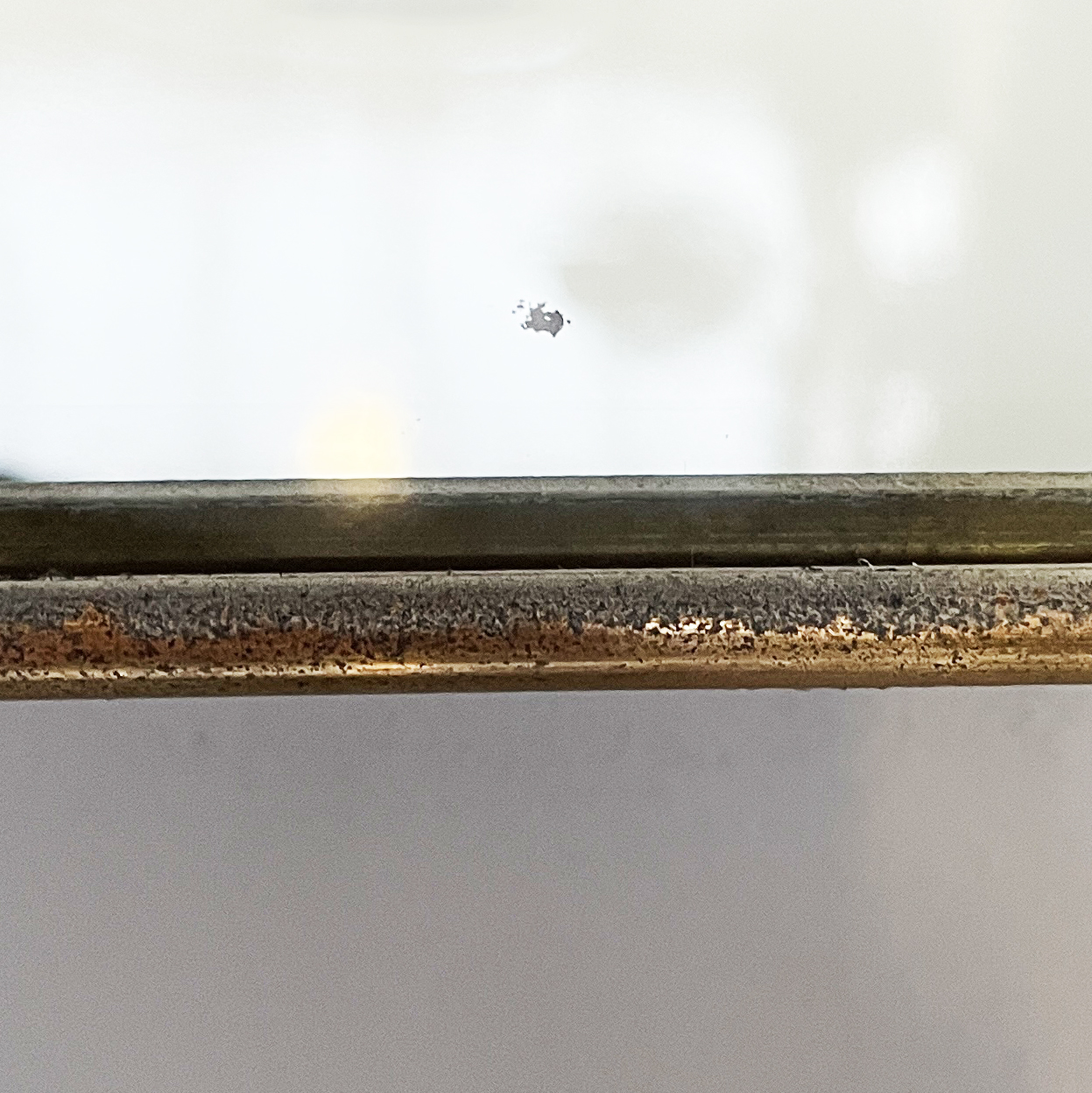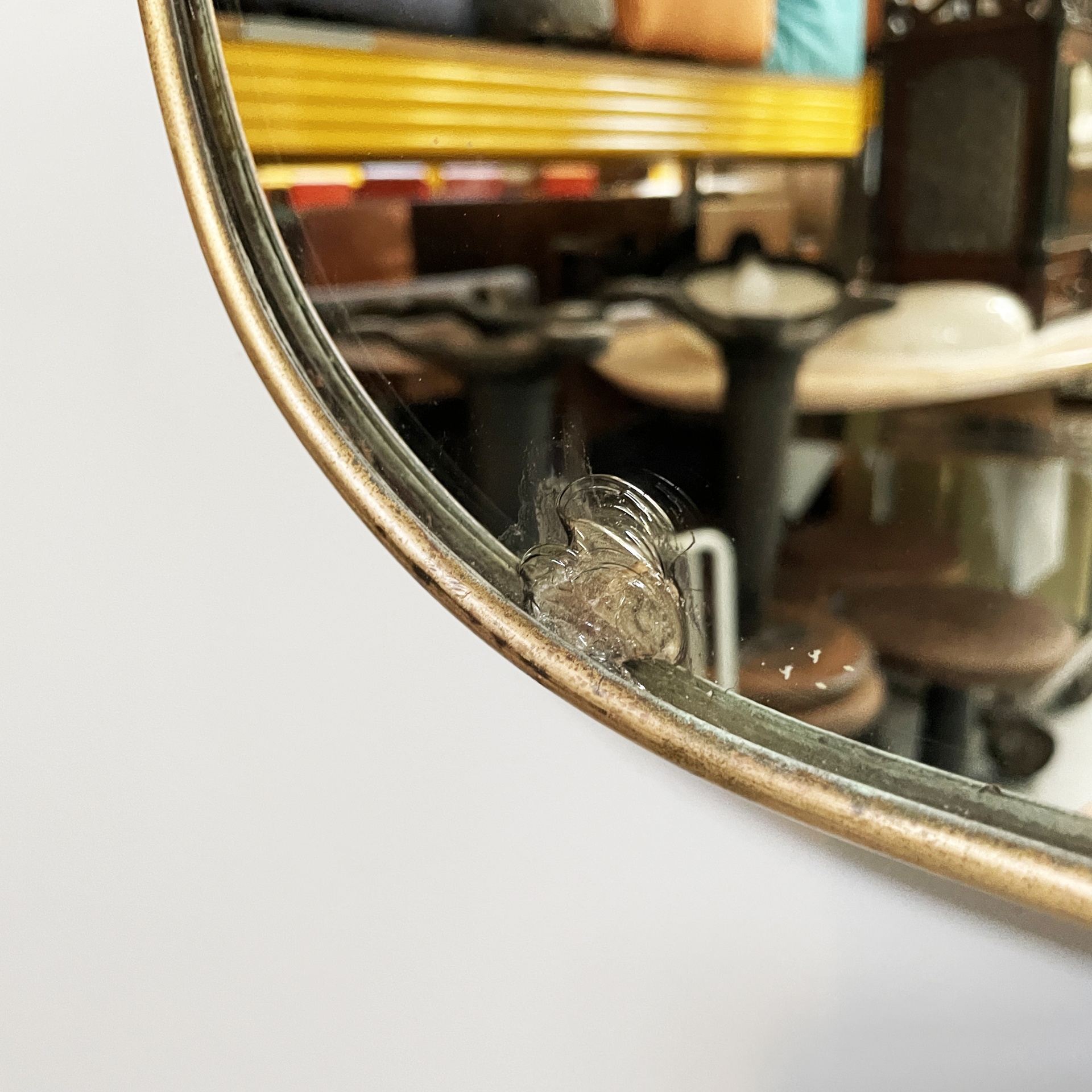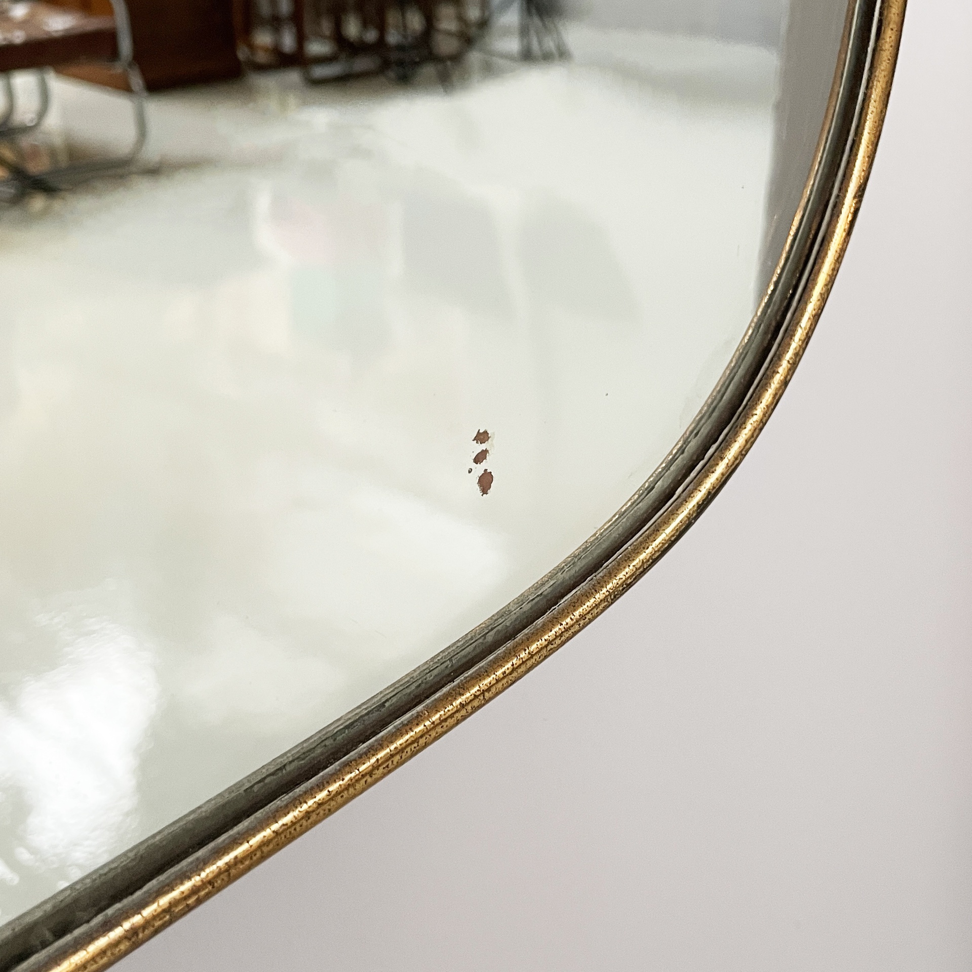 Condizioni discrete. Presenta due mancanze e piccoli segni sparsi allo specchio. Ottone in patina con segni del tempo.