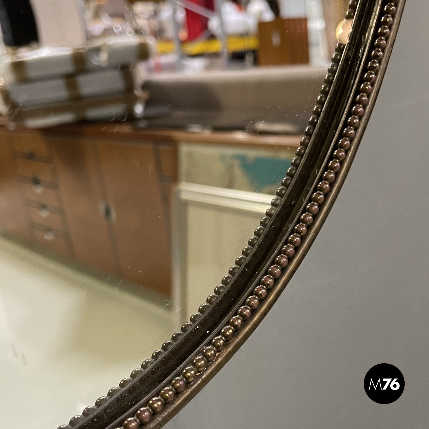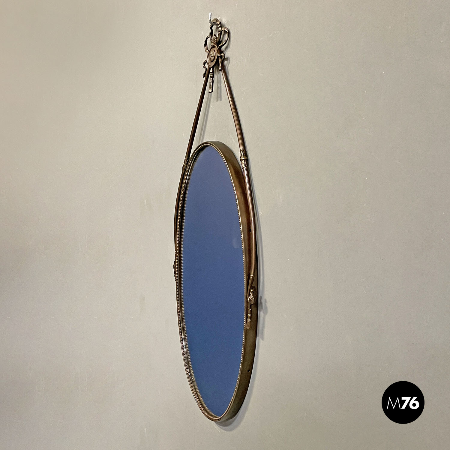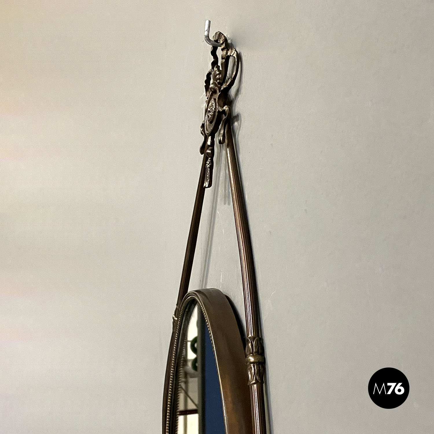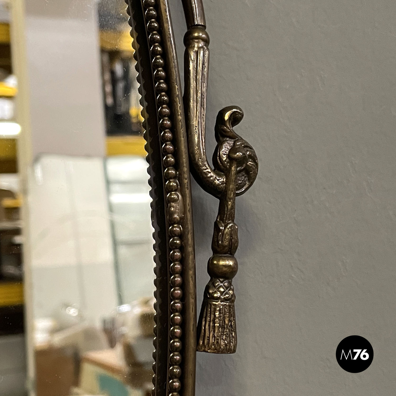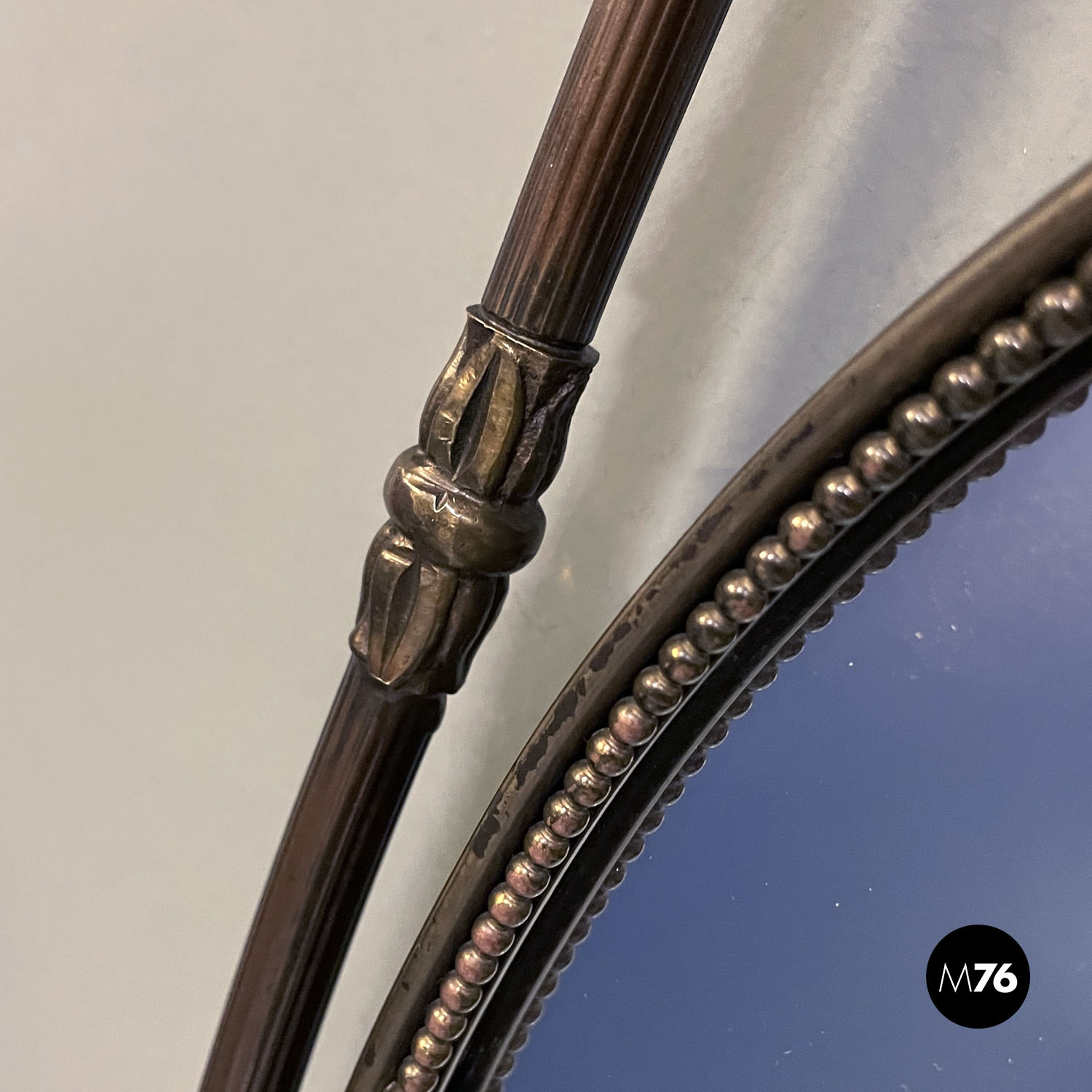 Specchio da parete ovale in ottone. La struttura portante è composta da due bracci a sezione tonda decorati uniti nella parte superiore da una decorazione a forma di fiocco finemente lavorato. La cornice dello specchio ha una decorazione su tutto il perimetro composto da piccole sfere in ottone.