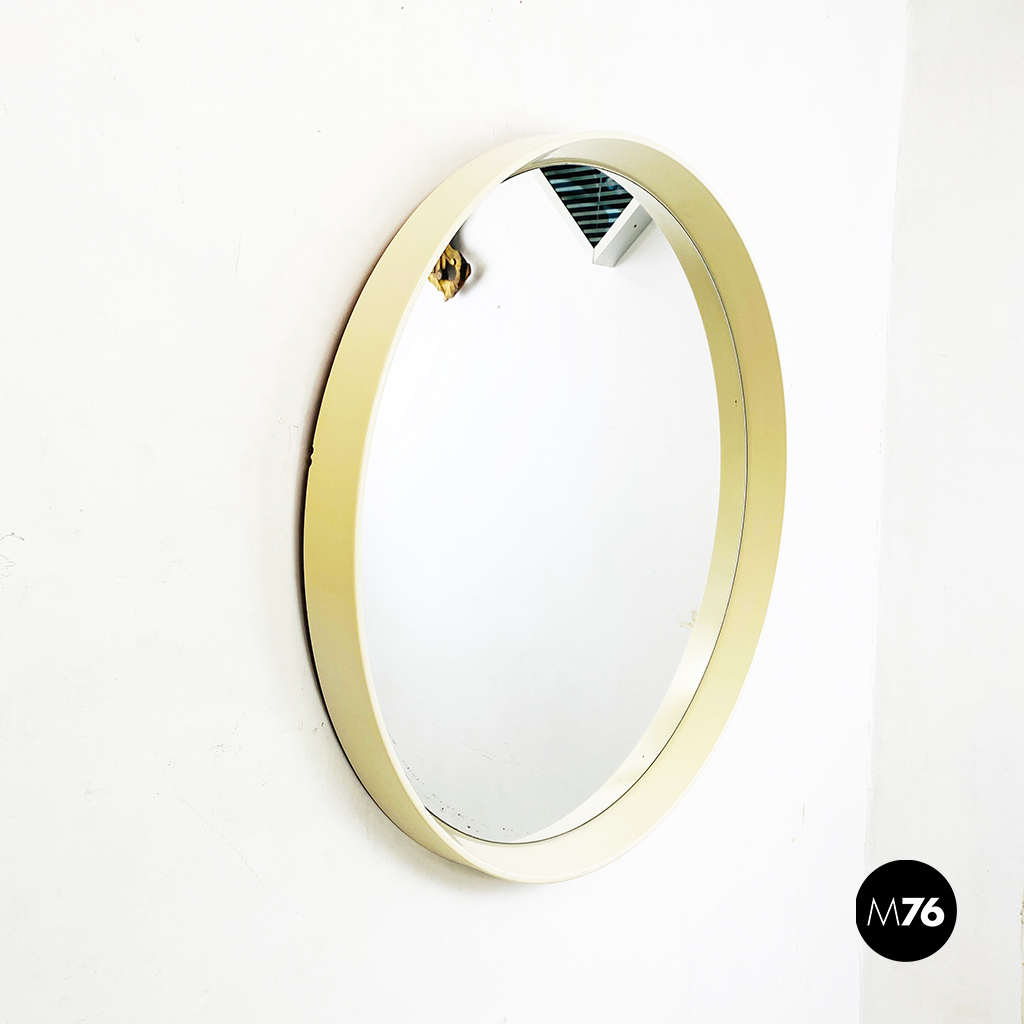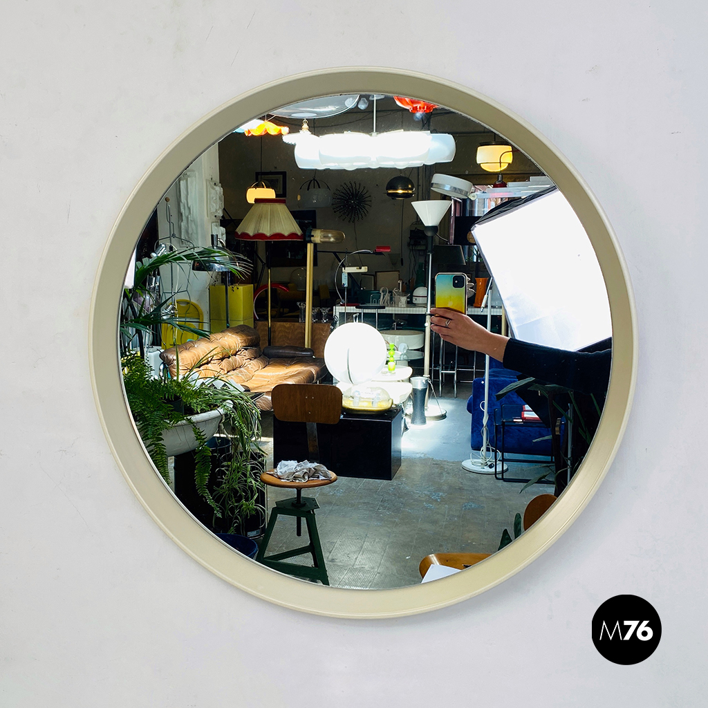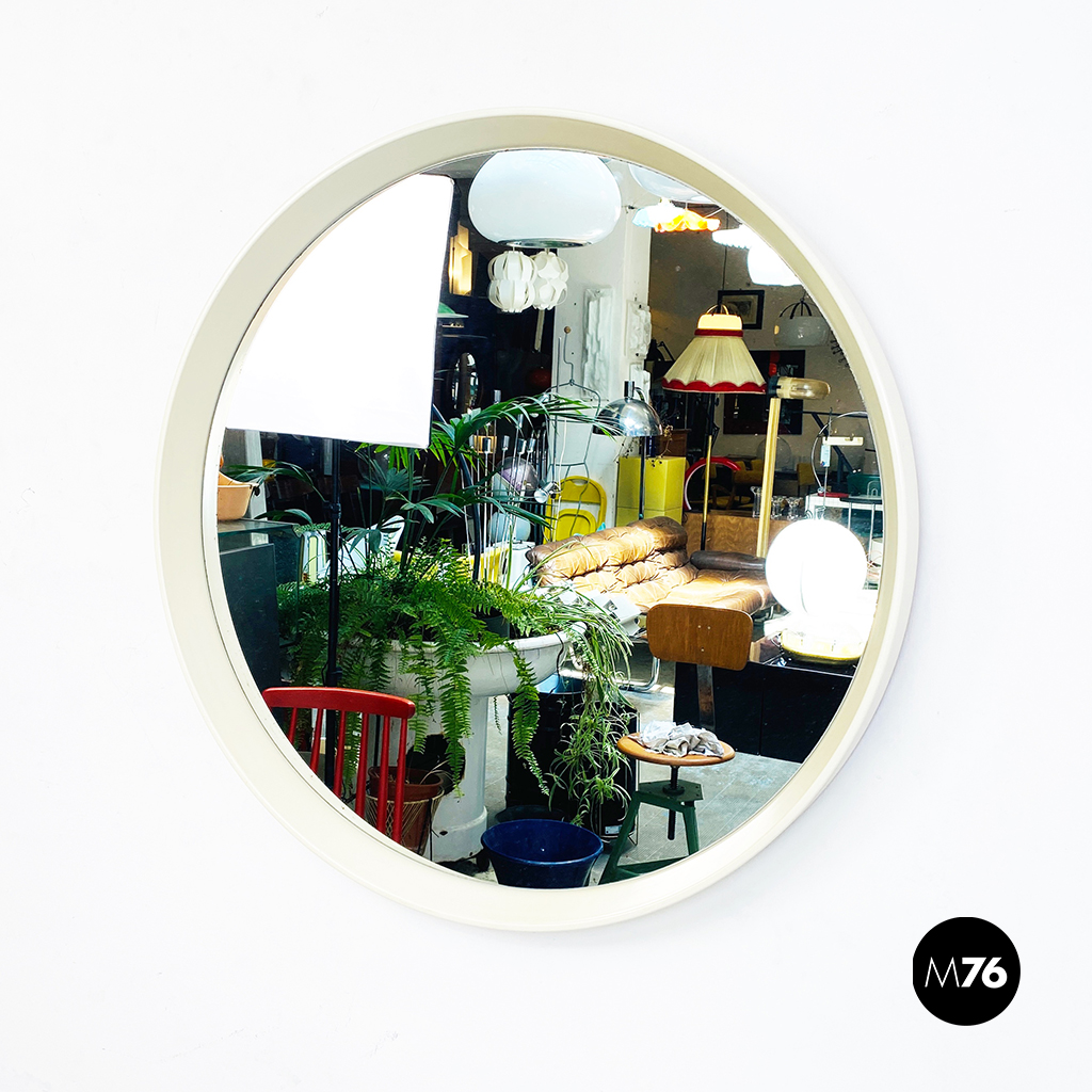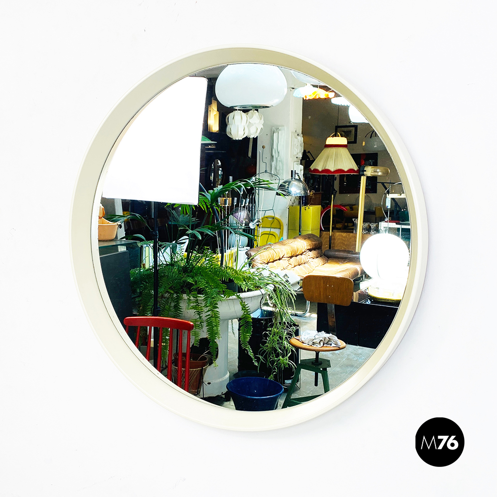 Specchio tondo da parete con cornice in plastica bianca.