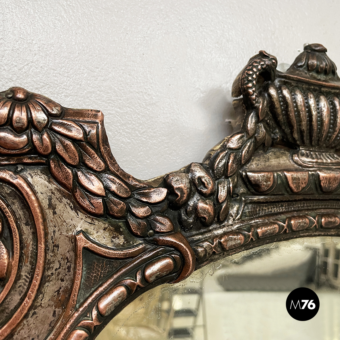 Specchio da parete ovale con cornice finemente lavorata in rame argentato. I soggetti sul profilo sono riccioli e motivi a foglie. La struttura è in legno.
