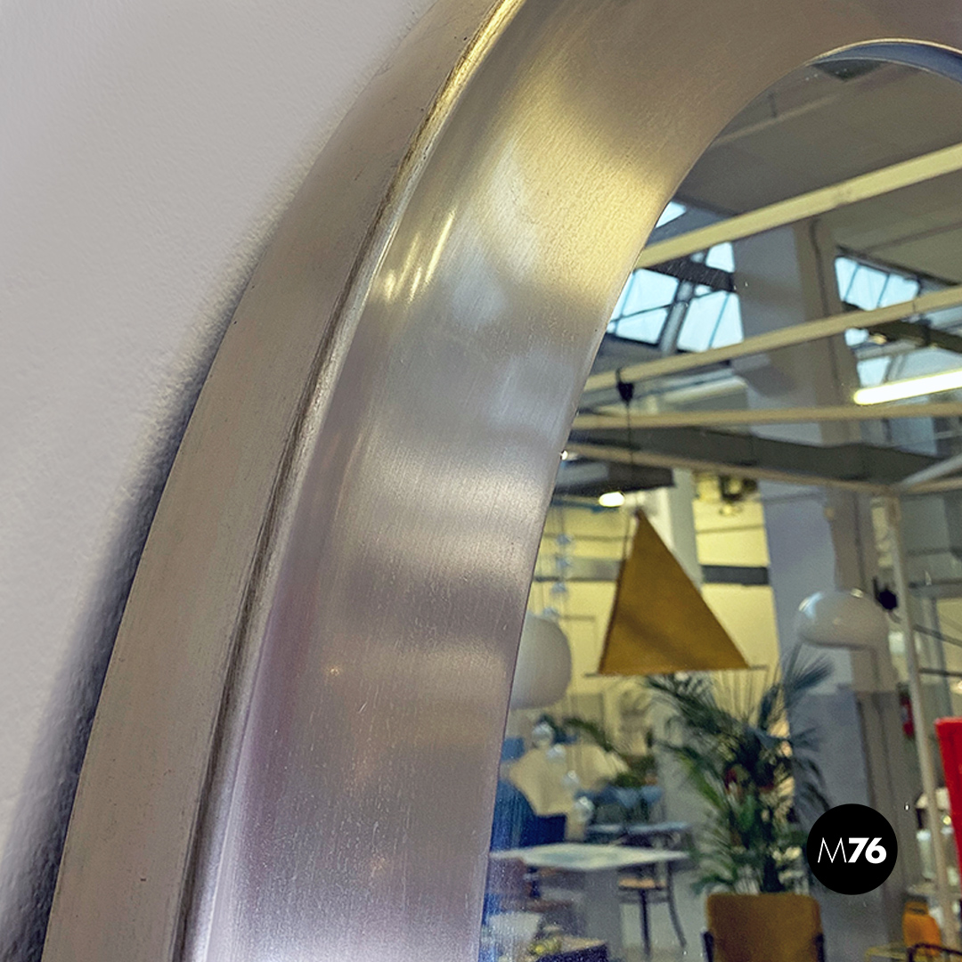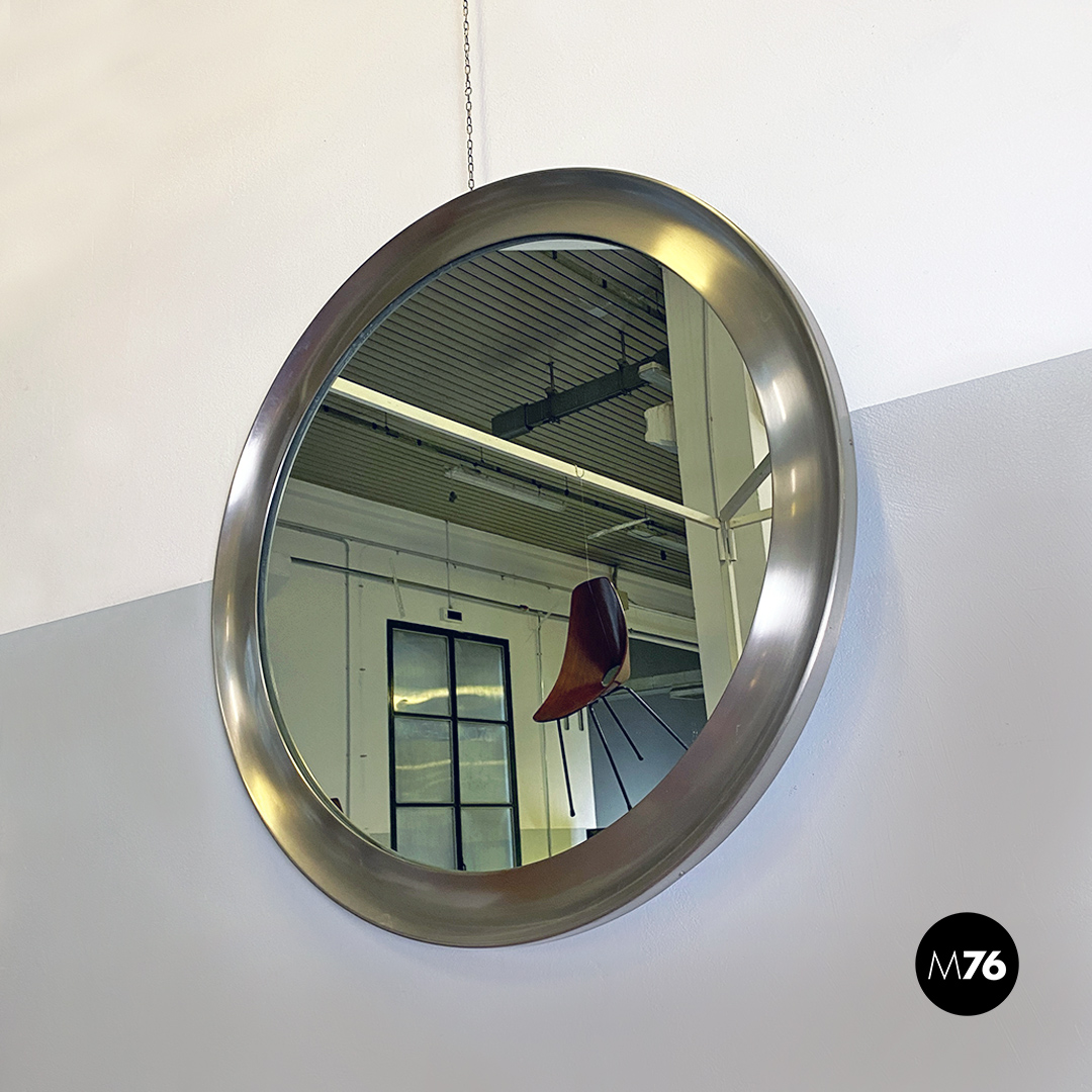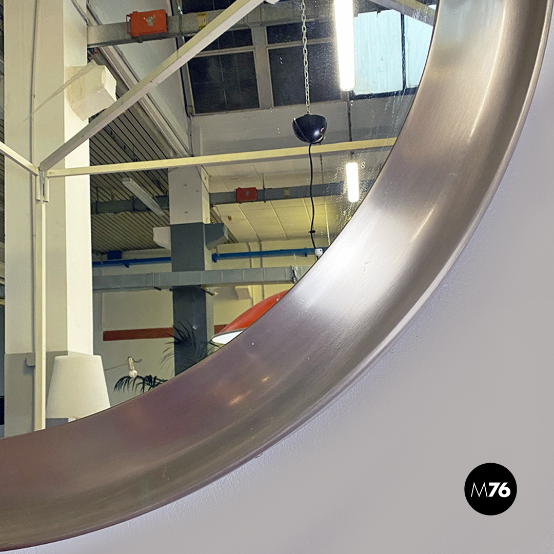 Specchio da parete modello Narciso, di forma tonda e di grandi dimensioni, con cornice convessa in alluminio nichelato e superficie piatta sul perimetro.