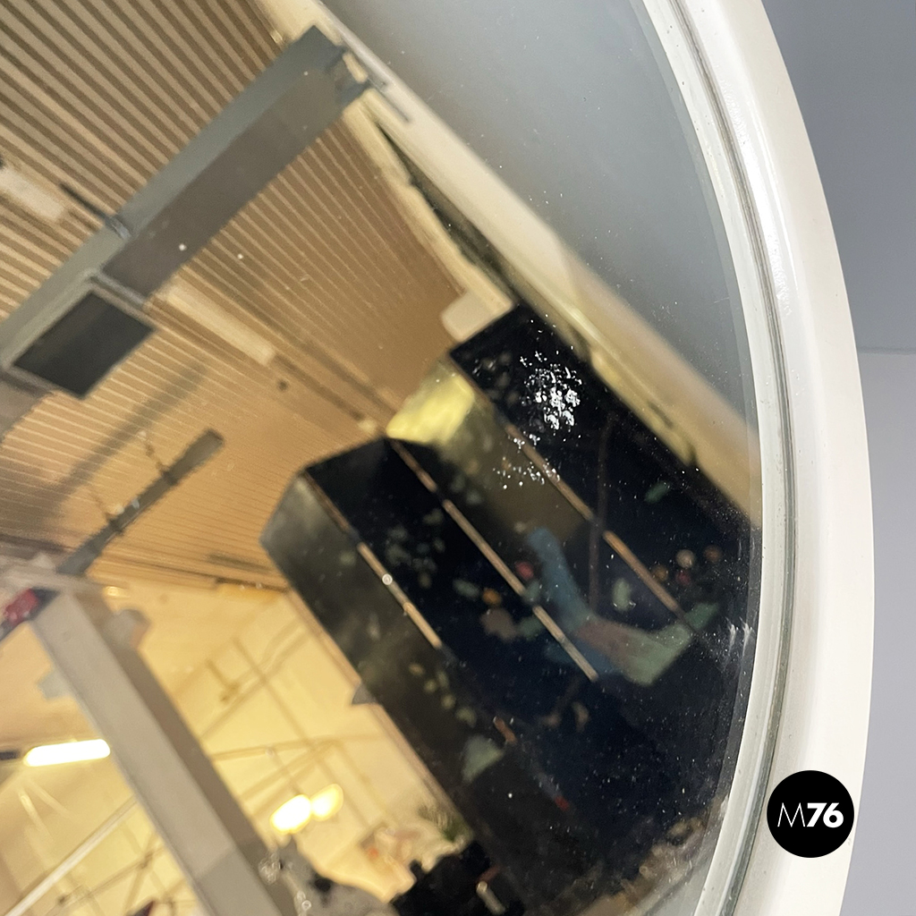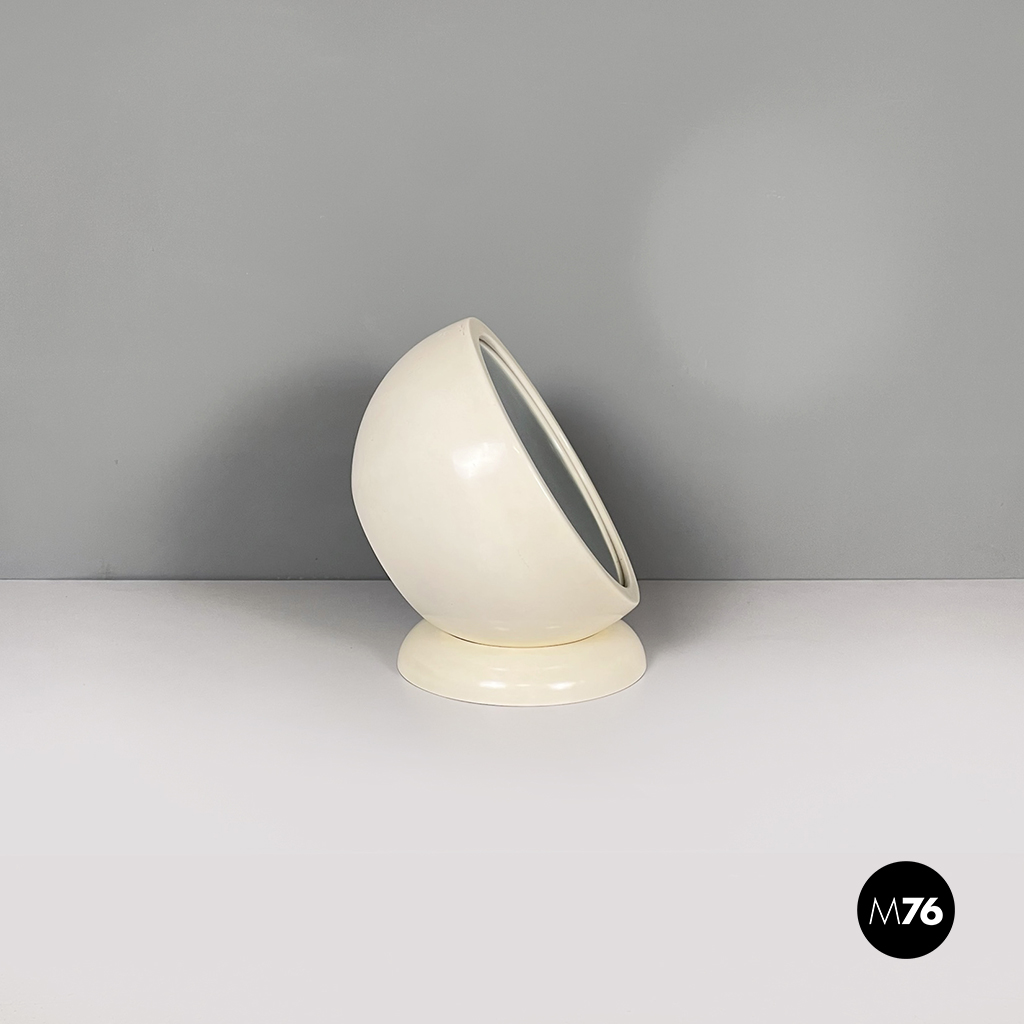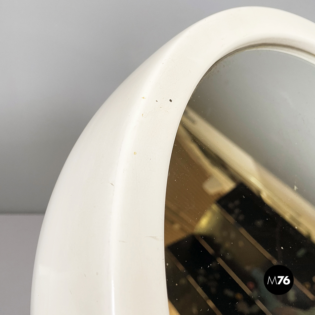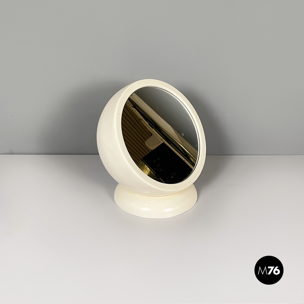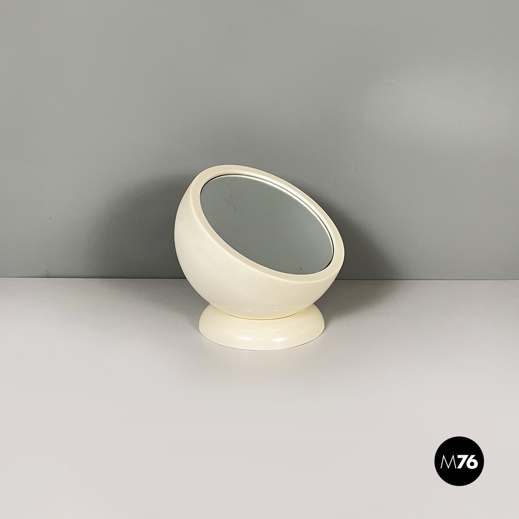 Specchio da tavolo di forma tondeggiante con base tonda in plastica ABS bianco crema. Lo specchio è appoggiato alla base, quindi è posizionabile a piacere.