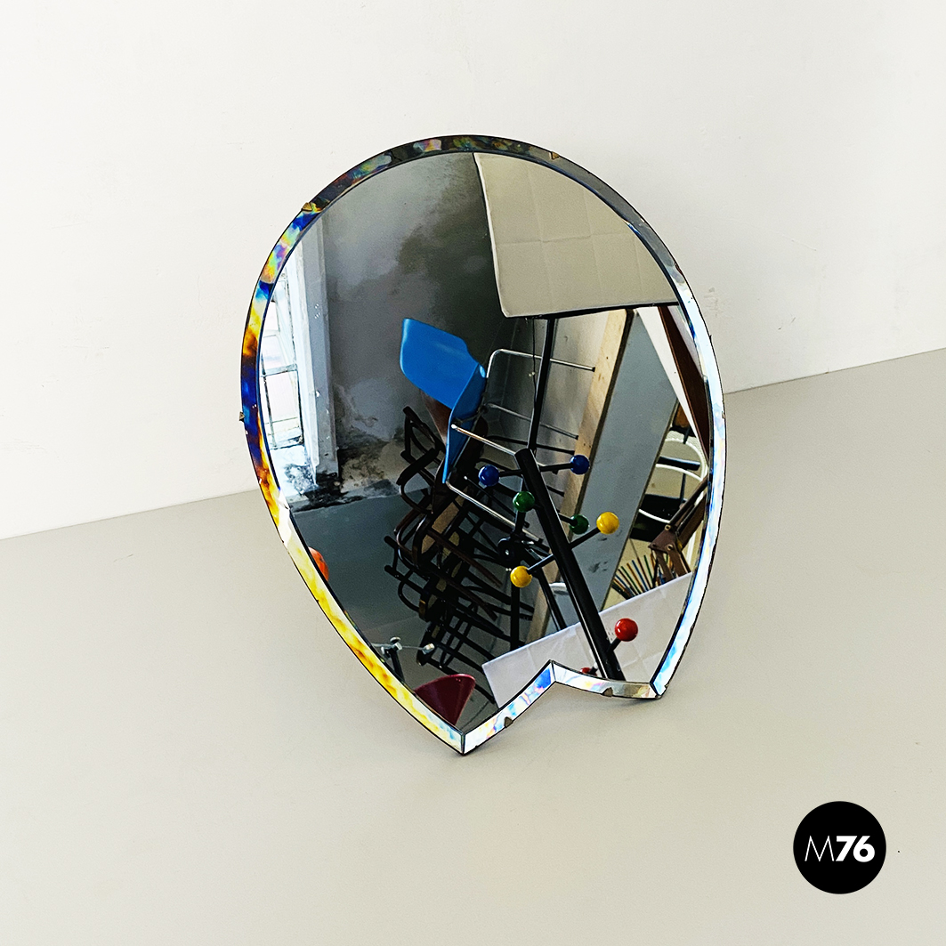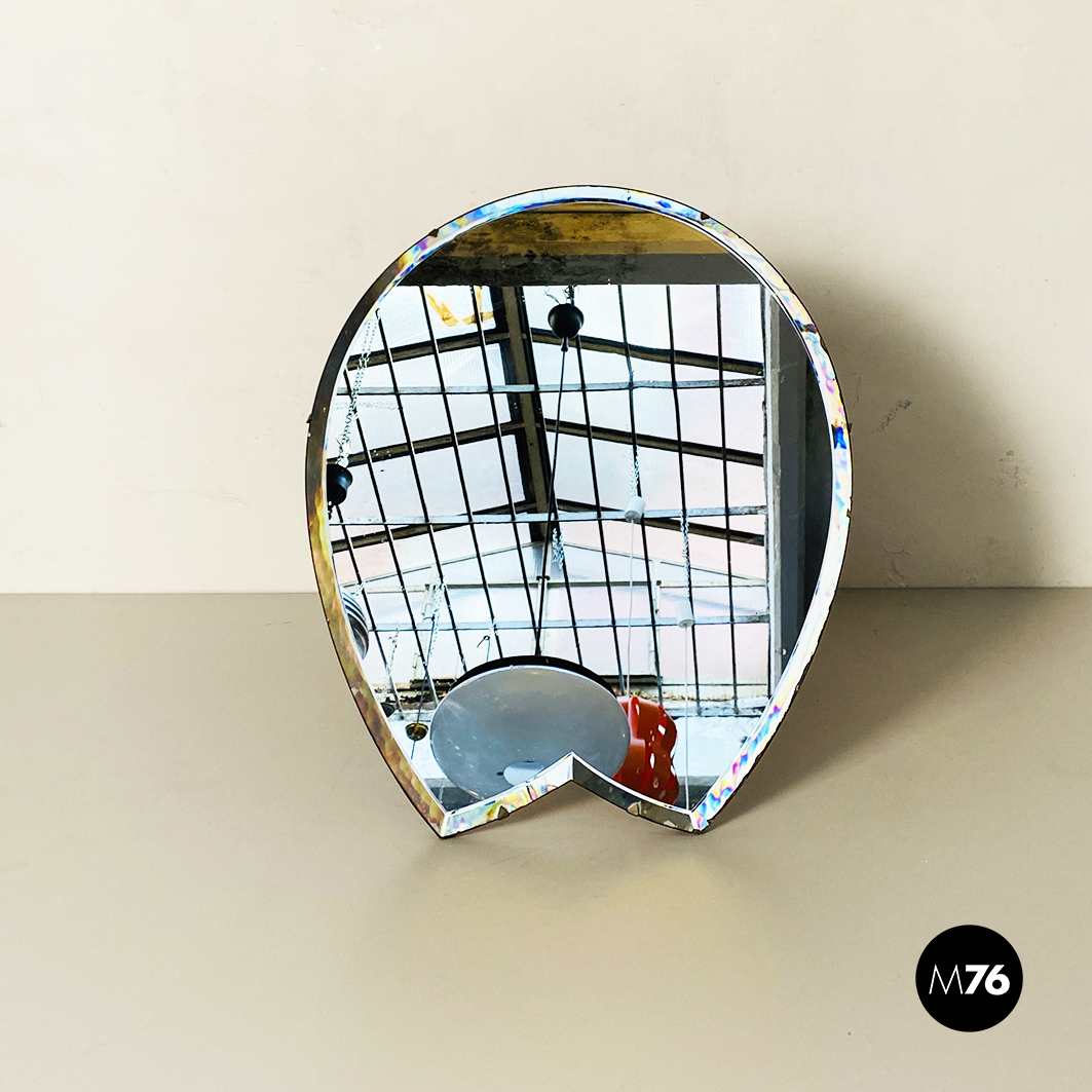 Specchio da tavolo di forma irregolare con struttura in legno e supporto in ferro.