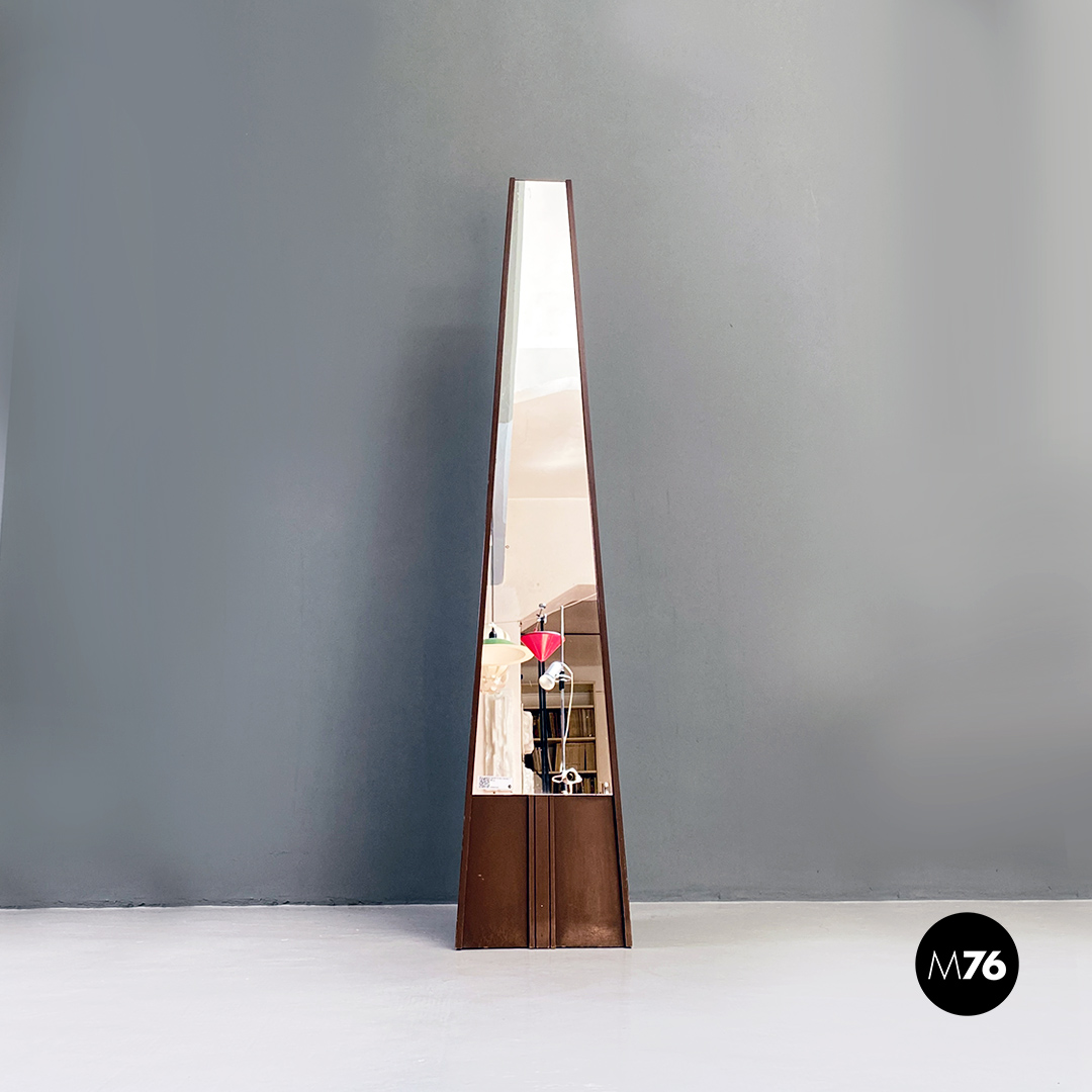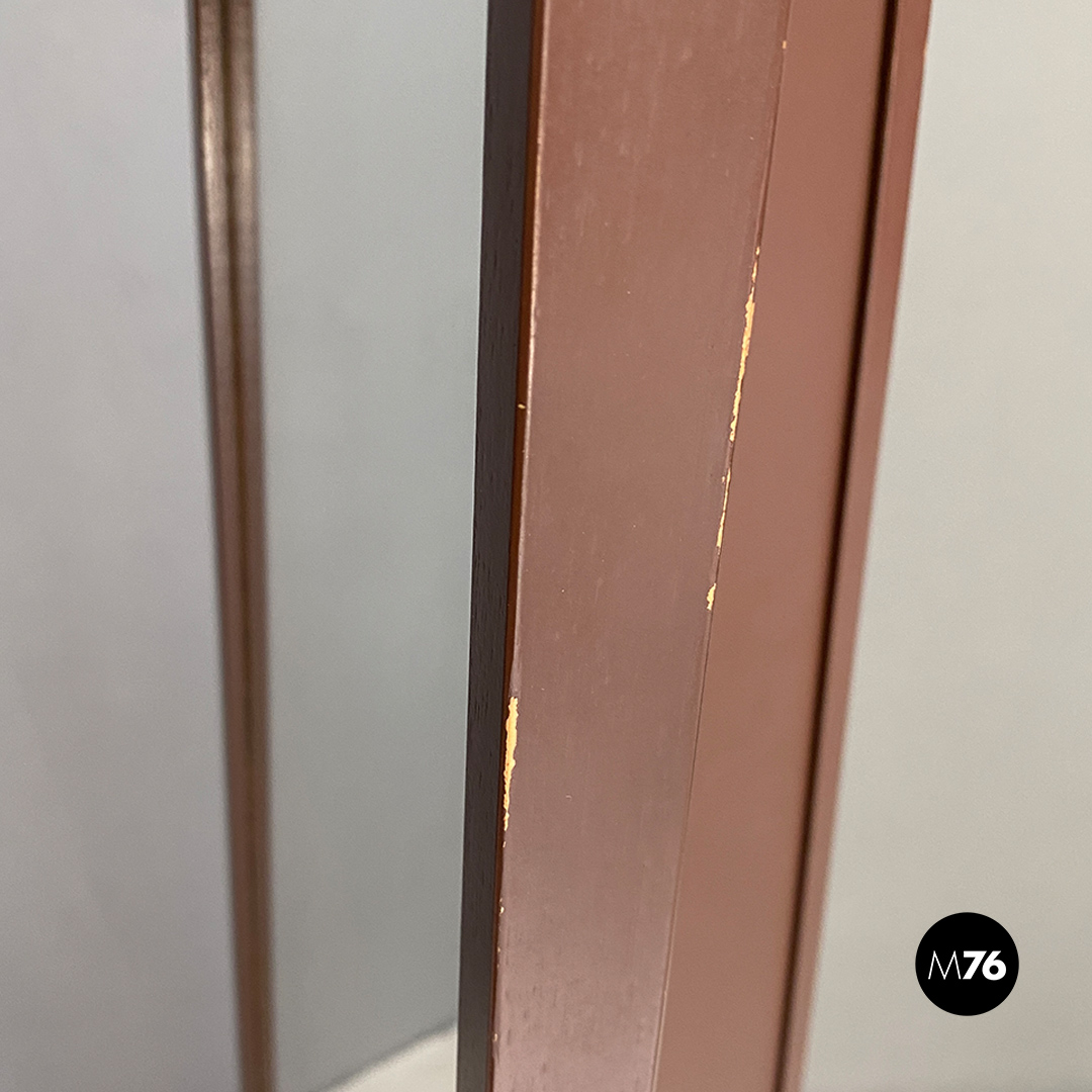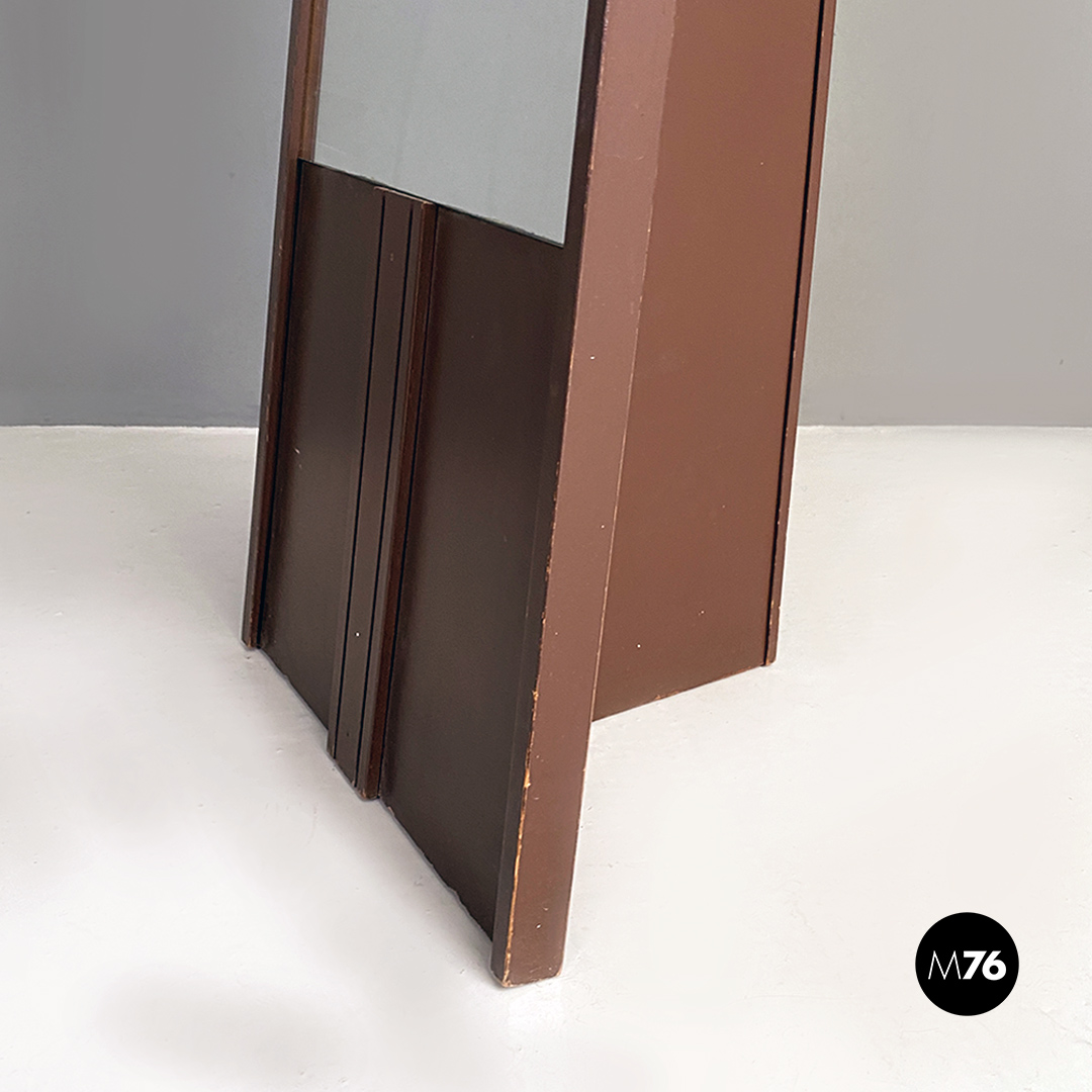 Specchio da terra con struttura in legno verniciata in colore marrone opaco, con aletta posteriore a battente e gancetto di blocco che lo rende autoportante e stabile.