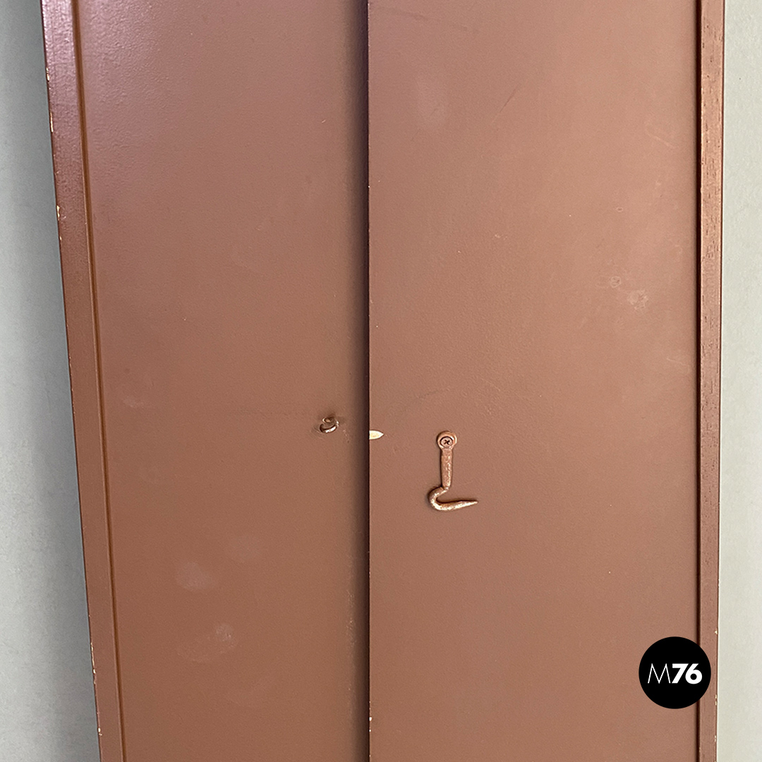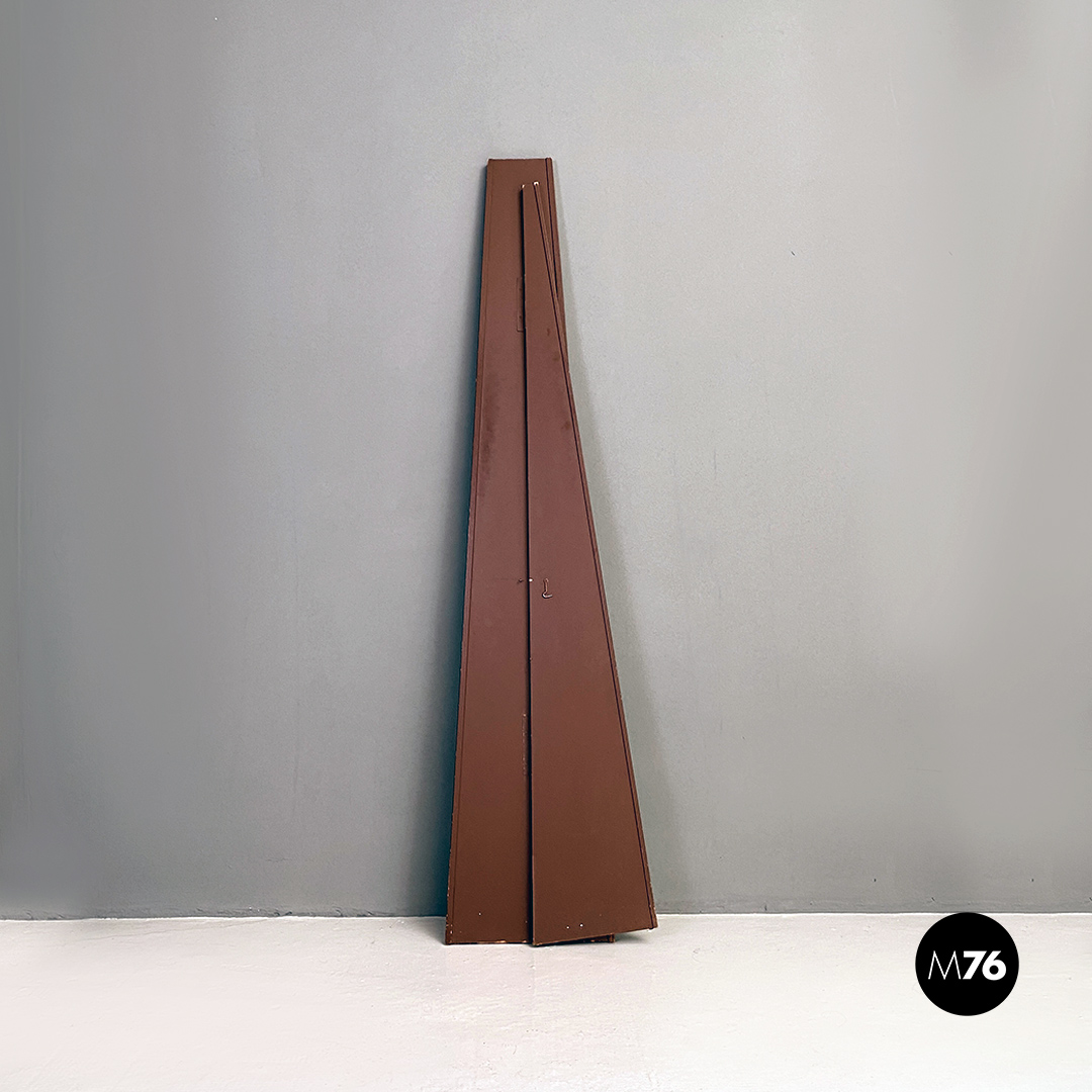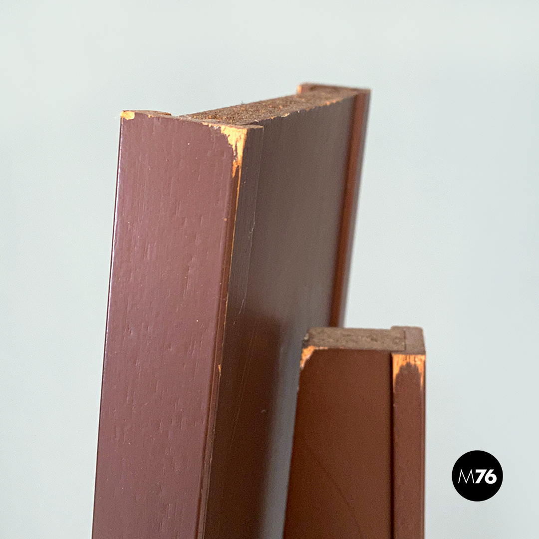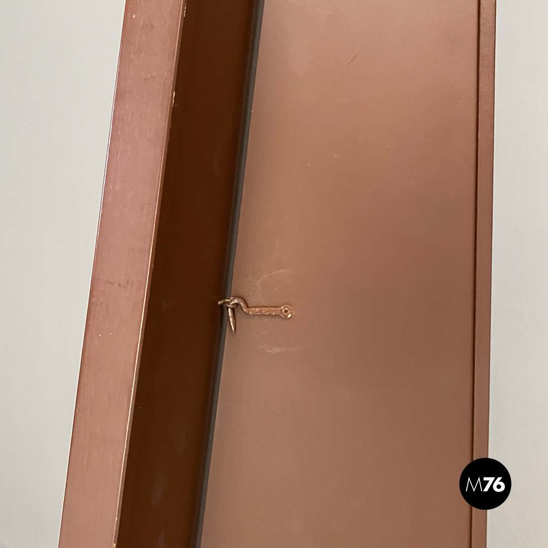 Specchio da terra con struttura in legno verniciata in colore marrone opaco, con aletta posteriore a battente e gancetto di blocco che lo rende autoportante e stabile.