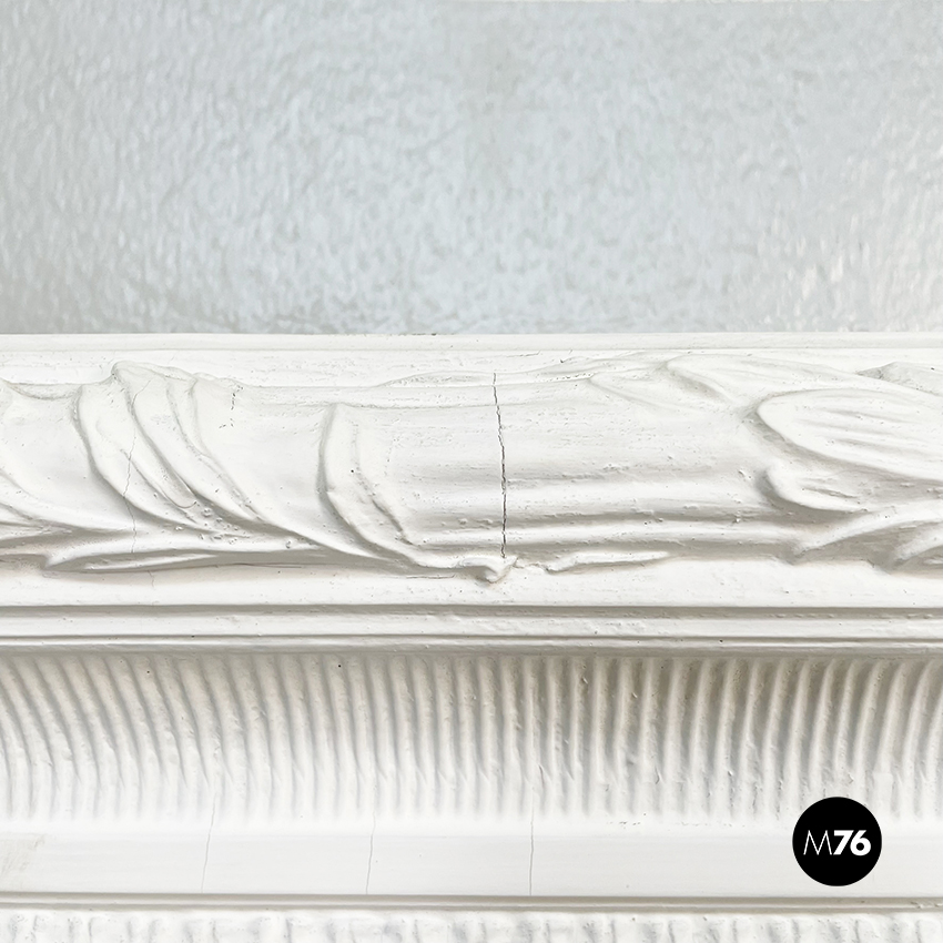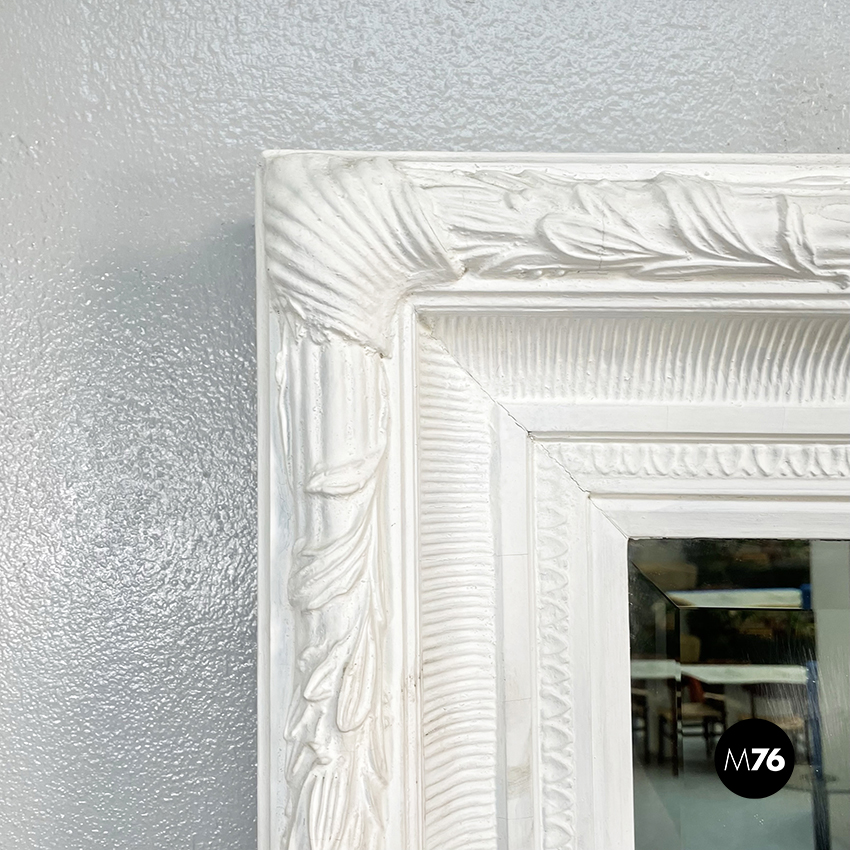 Specchio rettangolare di grandi dimensioni con cornice lavorata in legno verniciato bianco. Sulla parte esterna della cornice è presente un motivo con foglie. Lo specchio è possibile usarlo a parete o a terra.