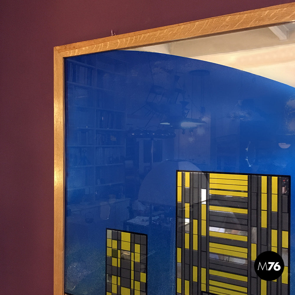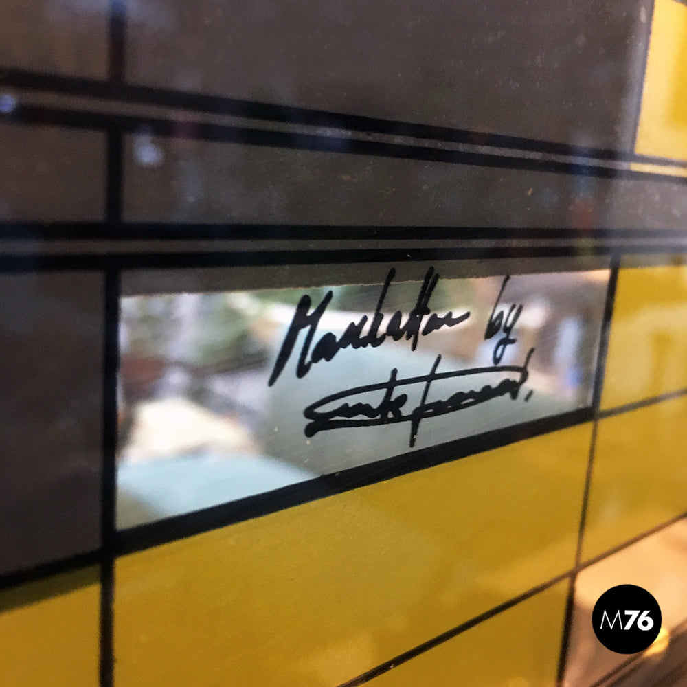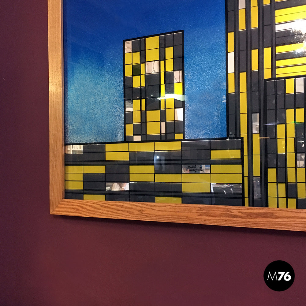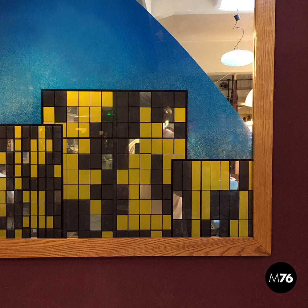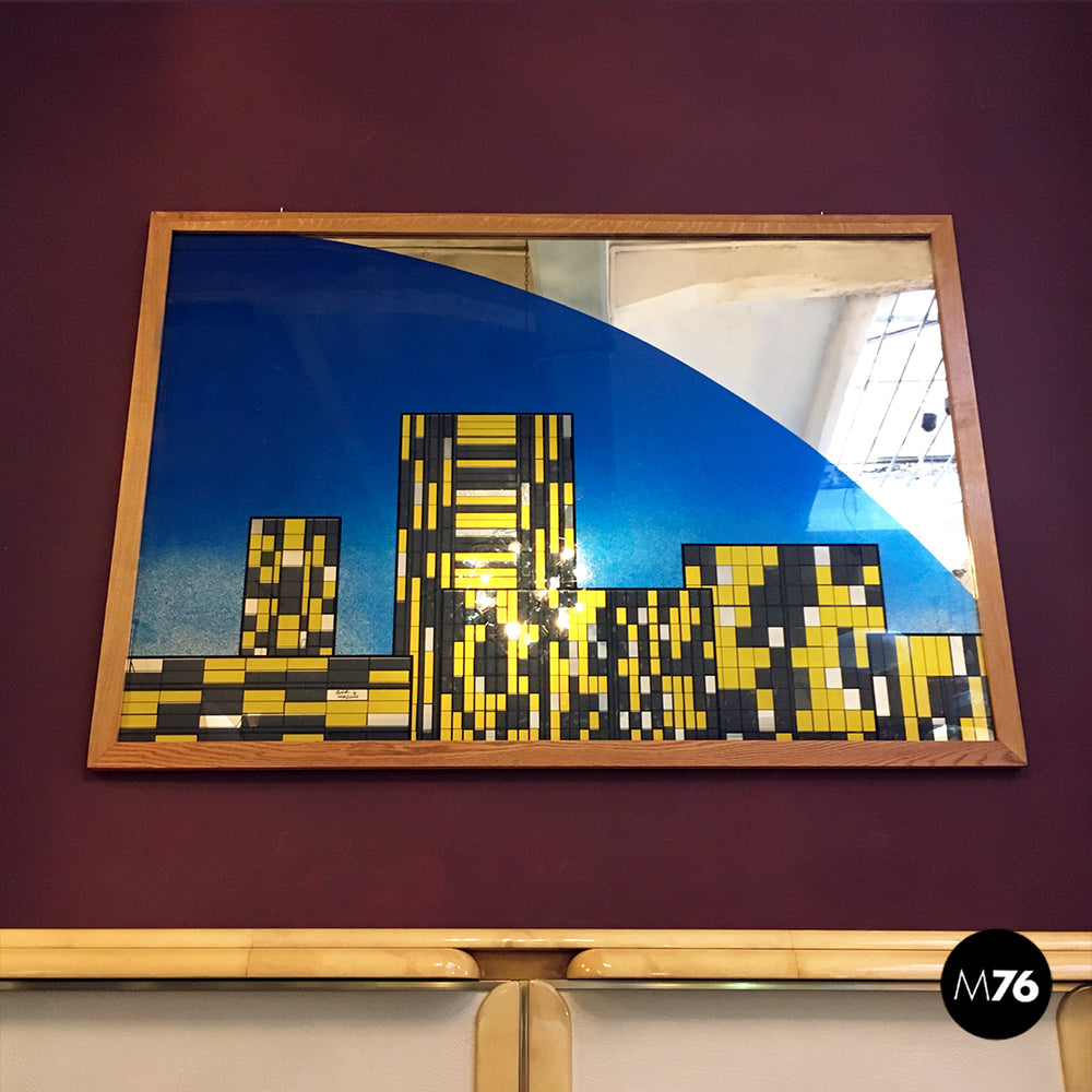 Specchio da parete decorativo con cornice in legno e vetro colorato, raffigurante Manhattan, come evidenziato dalla firma. Vetro colorato in blu, nero e giallo.