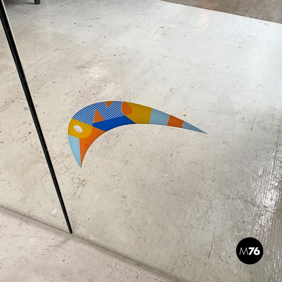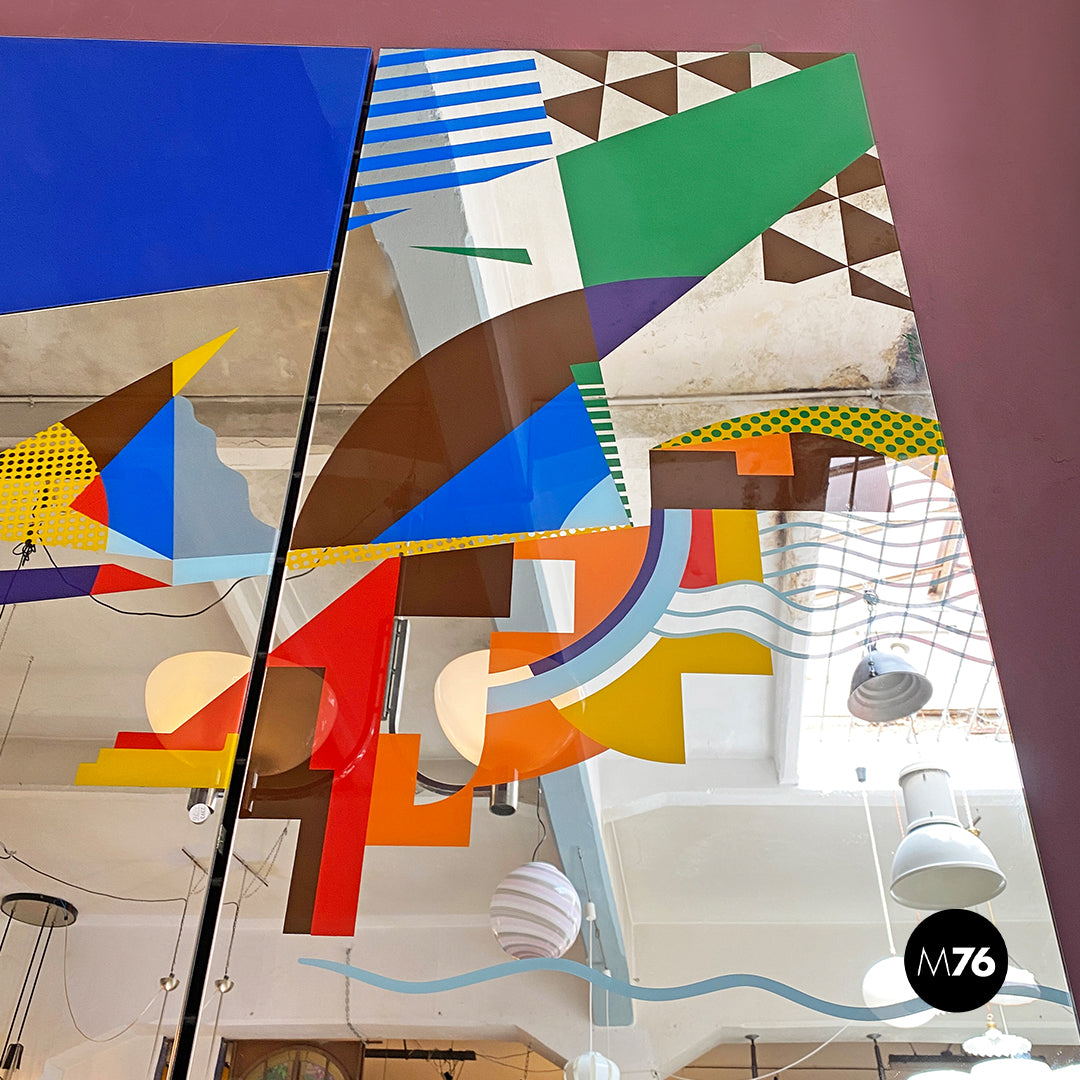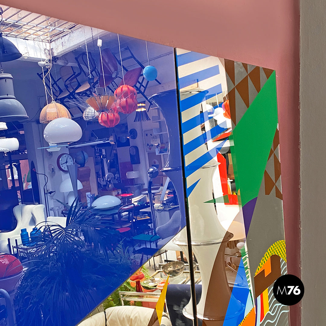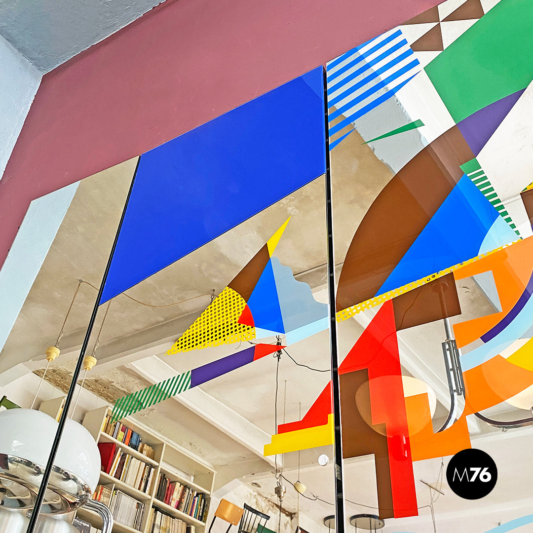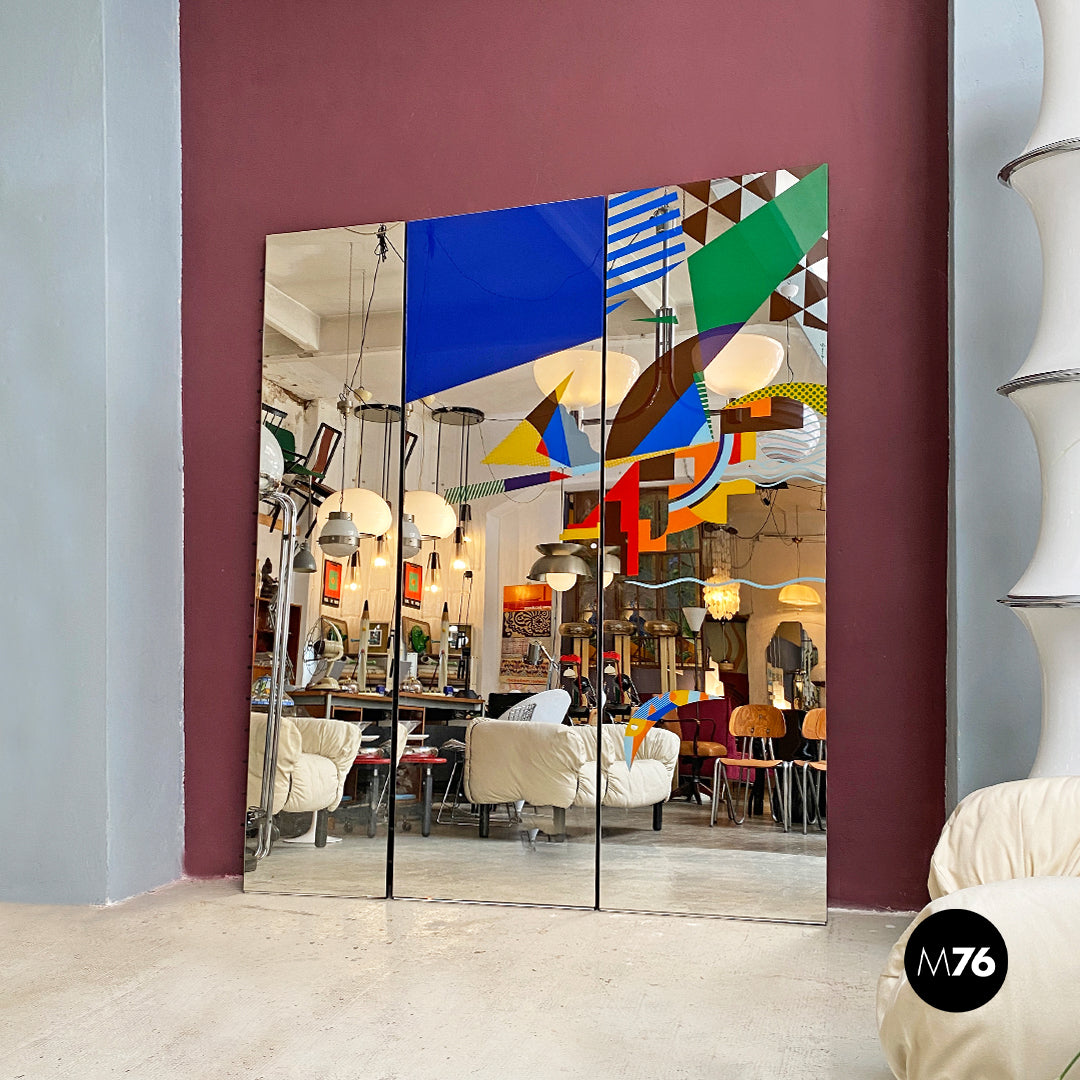 Specchio decorativo a tre pezzi, di grandi dimensioni, composto da tre ante incastrate tra loro con disegno astratto multicolore.
