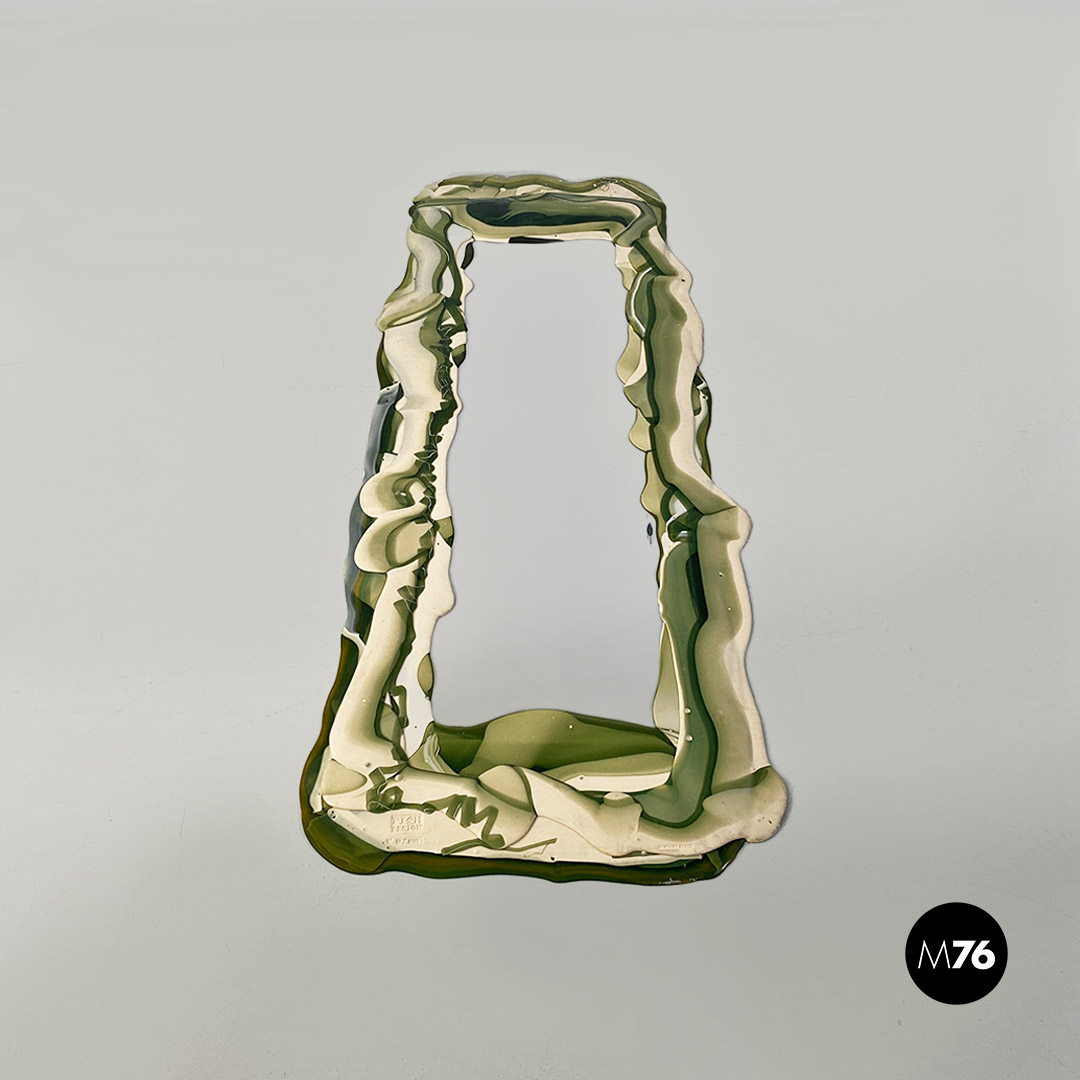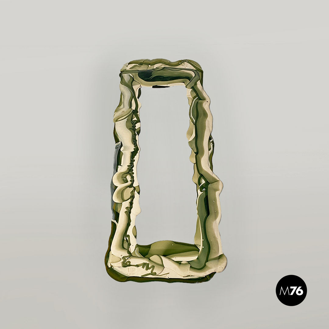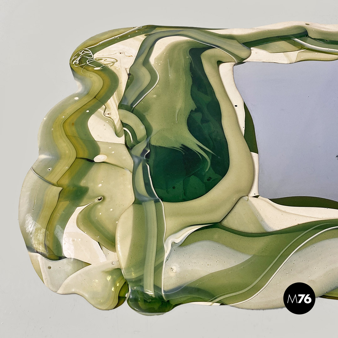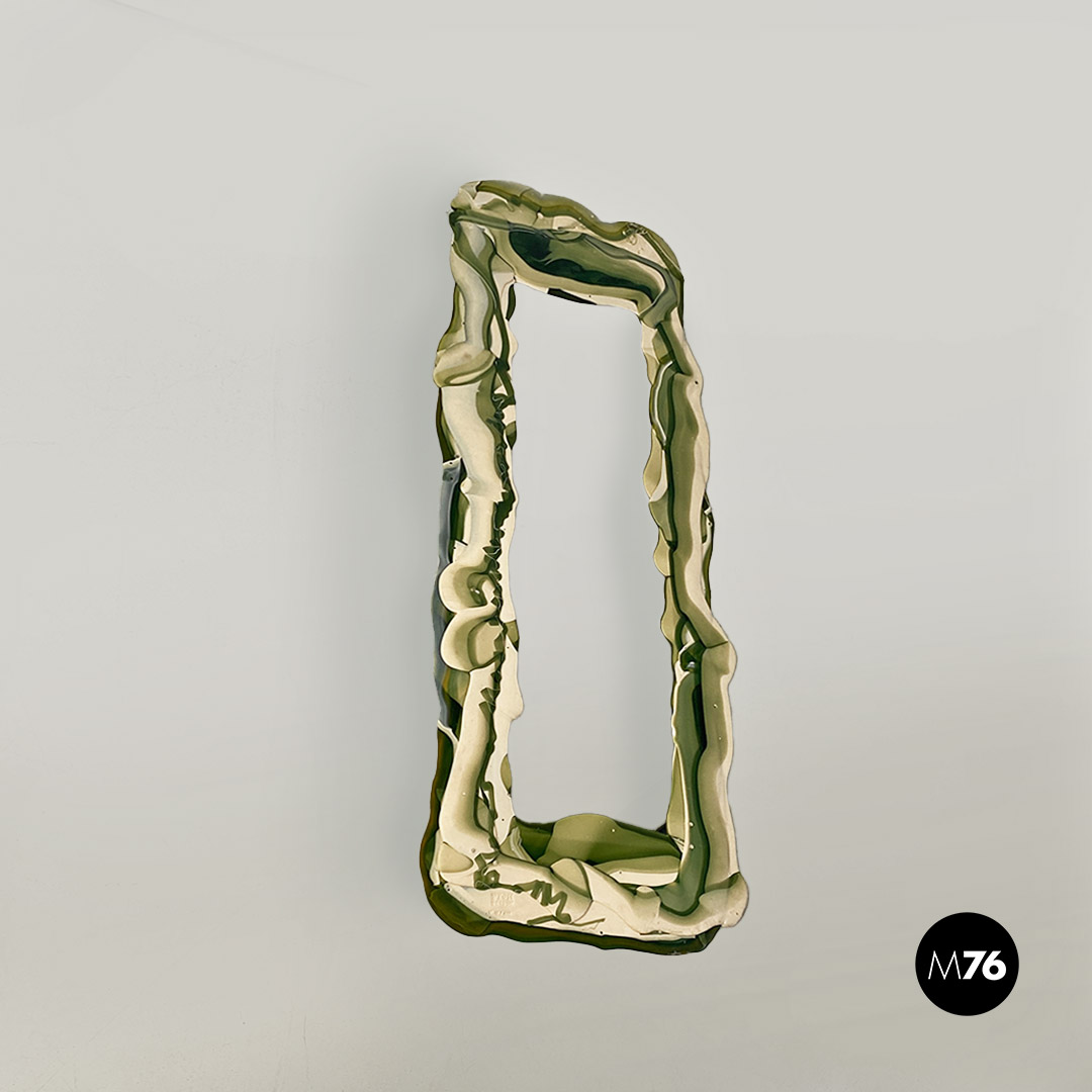 Specchio a figura intera con cornice in resina di forma irregolare, dalla sagoma curvilinea, sui toni del verde e del bianco panna, con parte centrale specchiata.