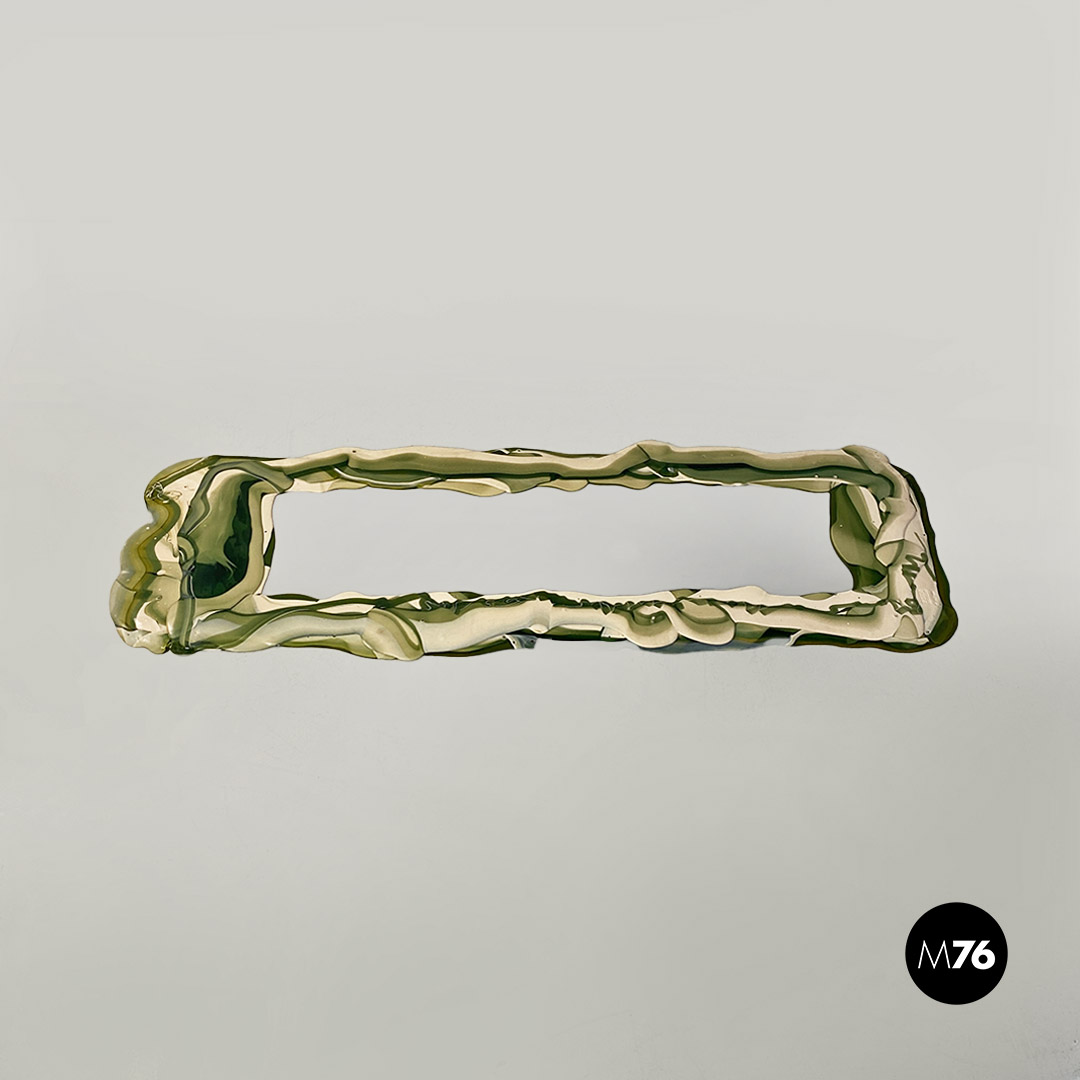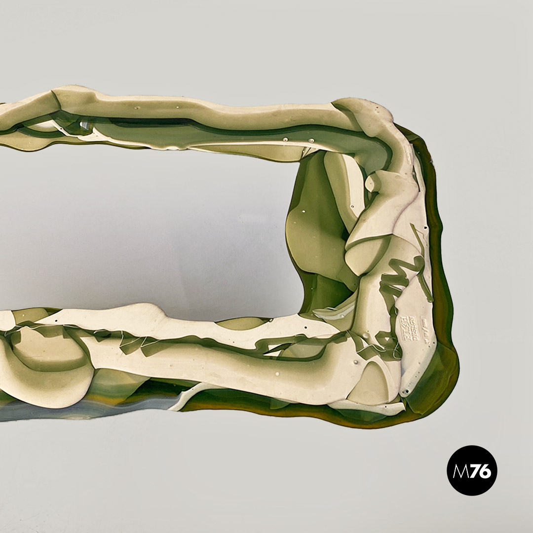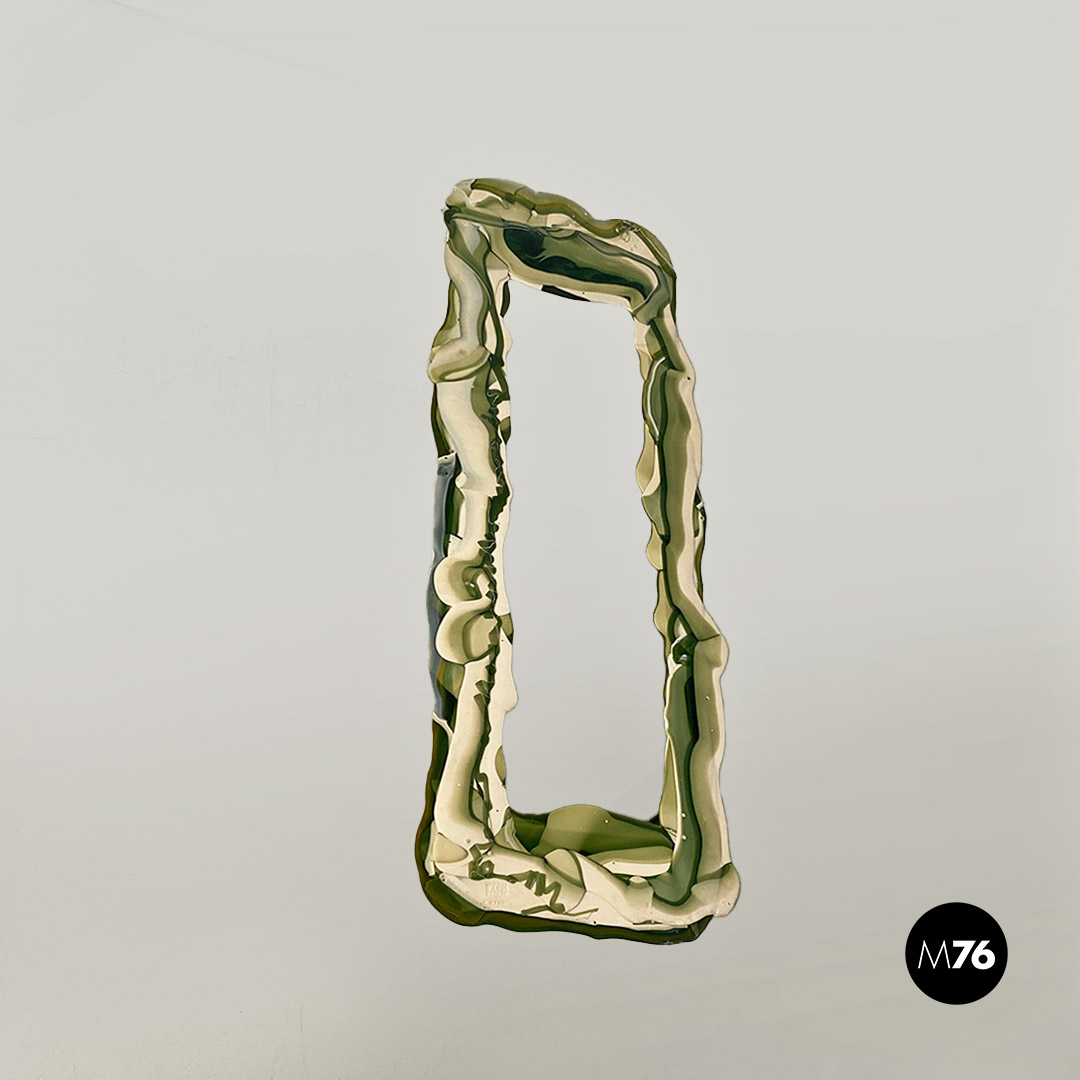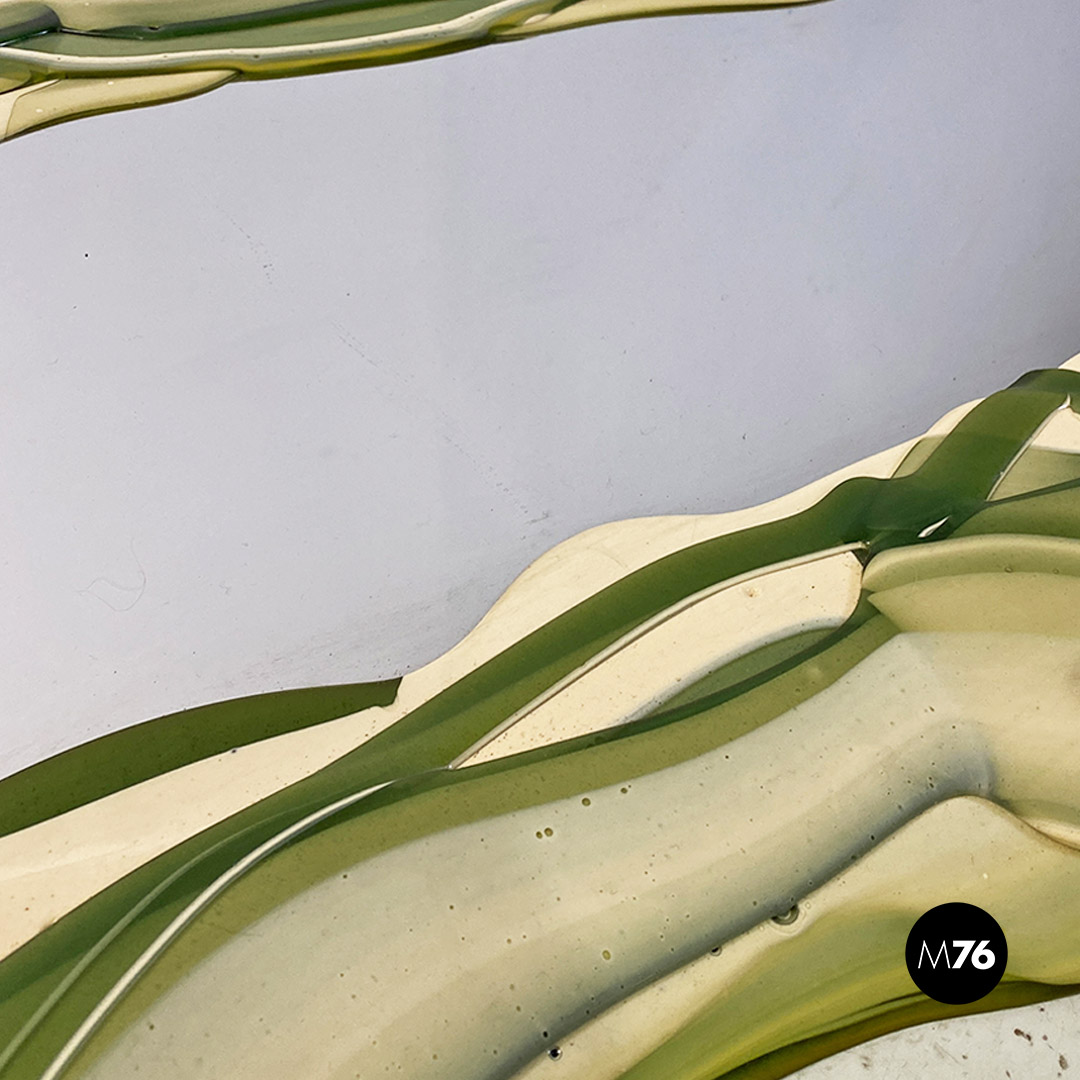 Specchio a figura intera con cornice in resina di forma irregolare, dalla sagoma curvilinea, sui toni del verde e del bianco panna, con parte centrale specchiata.