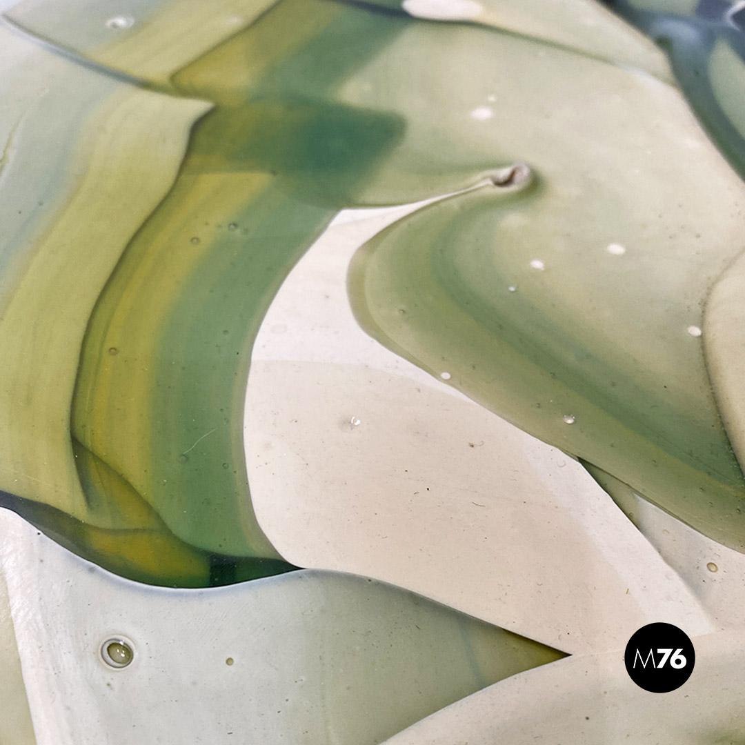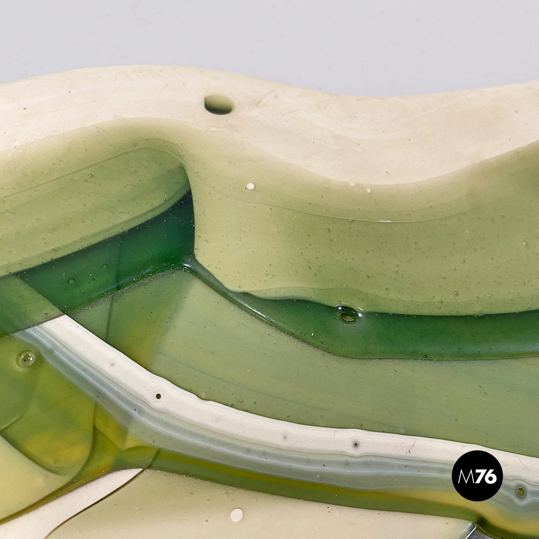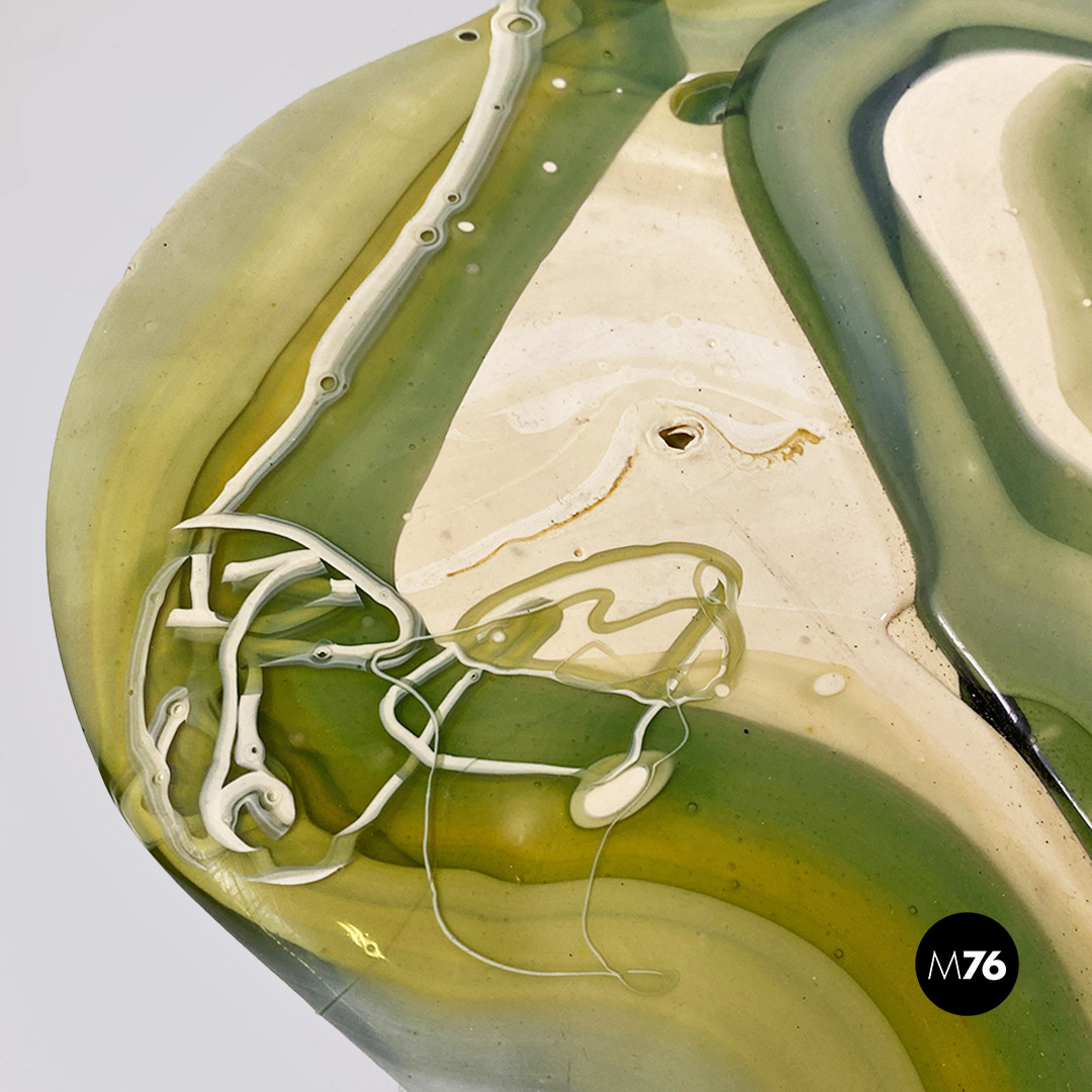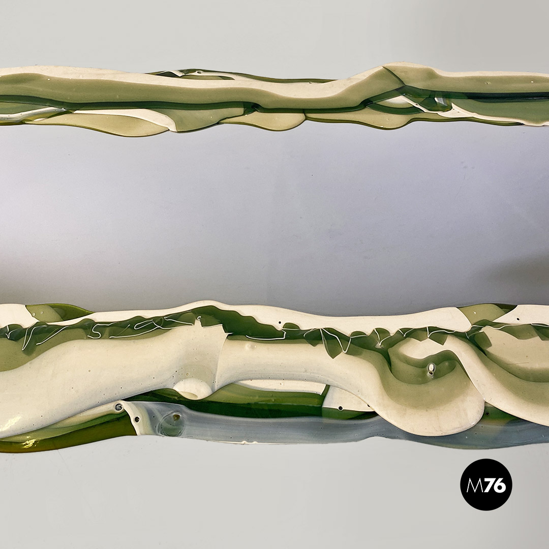 Specchio a figura intera con cornice in resina di forma irregolare, dalla sagoma curvilinea, sui toni del verde e del bianco panna, con parte centrale specchiata.