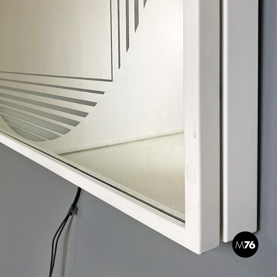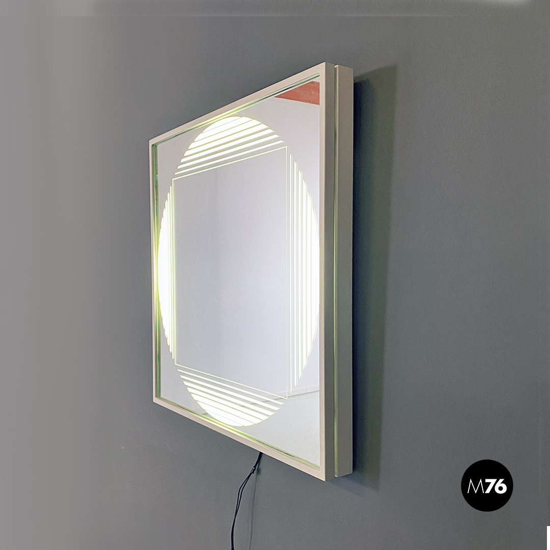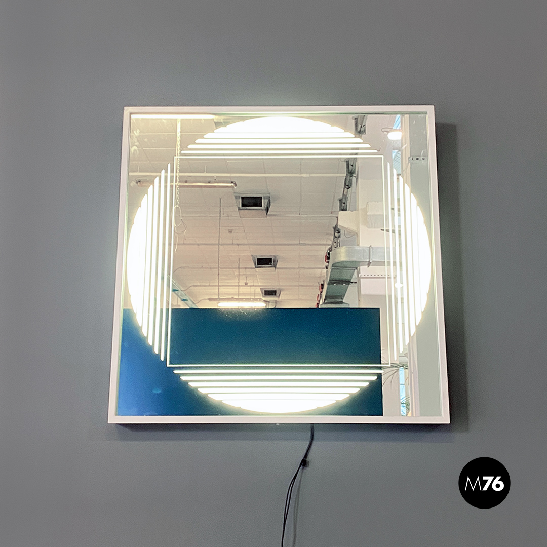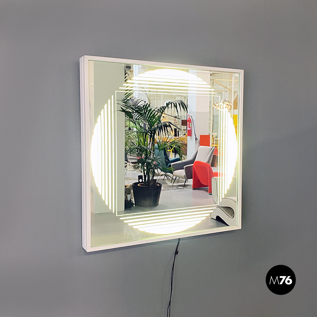 Specchio retroilluminato a neon, di forma quadrata con cornice contenitore in metallo bianco e specchio con decorazione concentrica circolare e semitrasparente sul vetro, messa in risalto tramite l’accensione dei neon interni alla struttura.