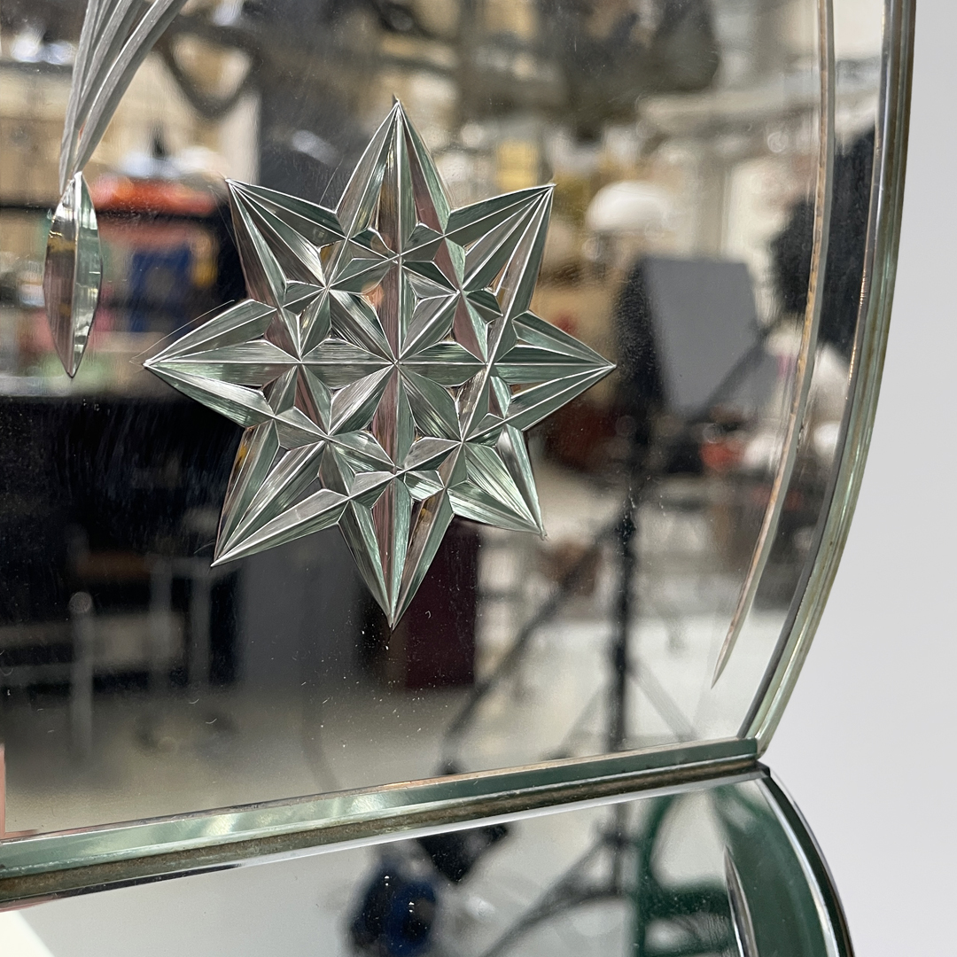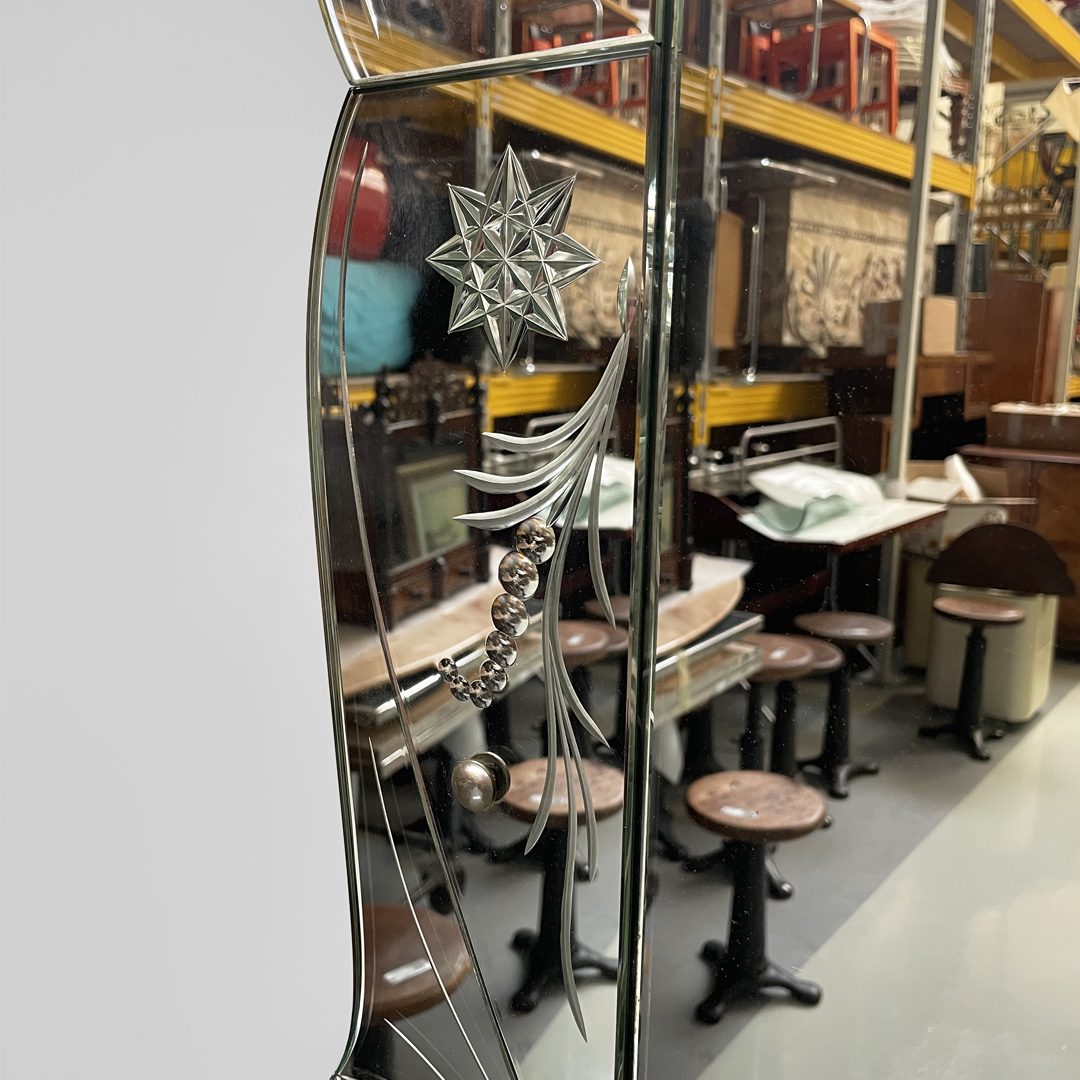Specchio da parete rettangolare con acidature a forma di stelle e foglie. Struttura in legno con cornice in vetro specchiato.