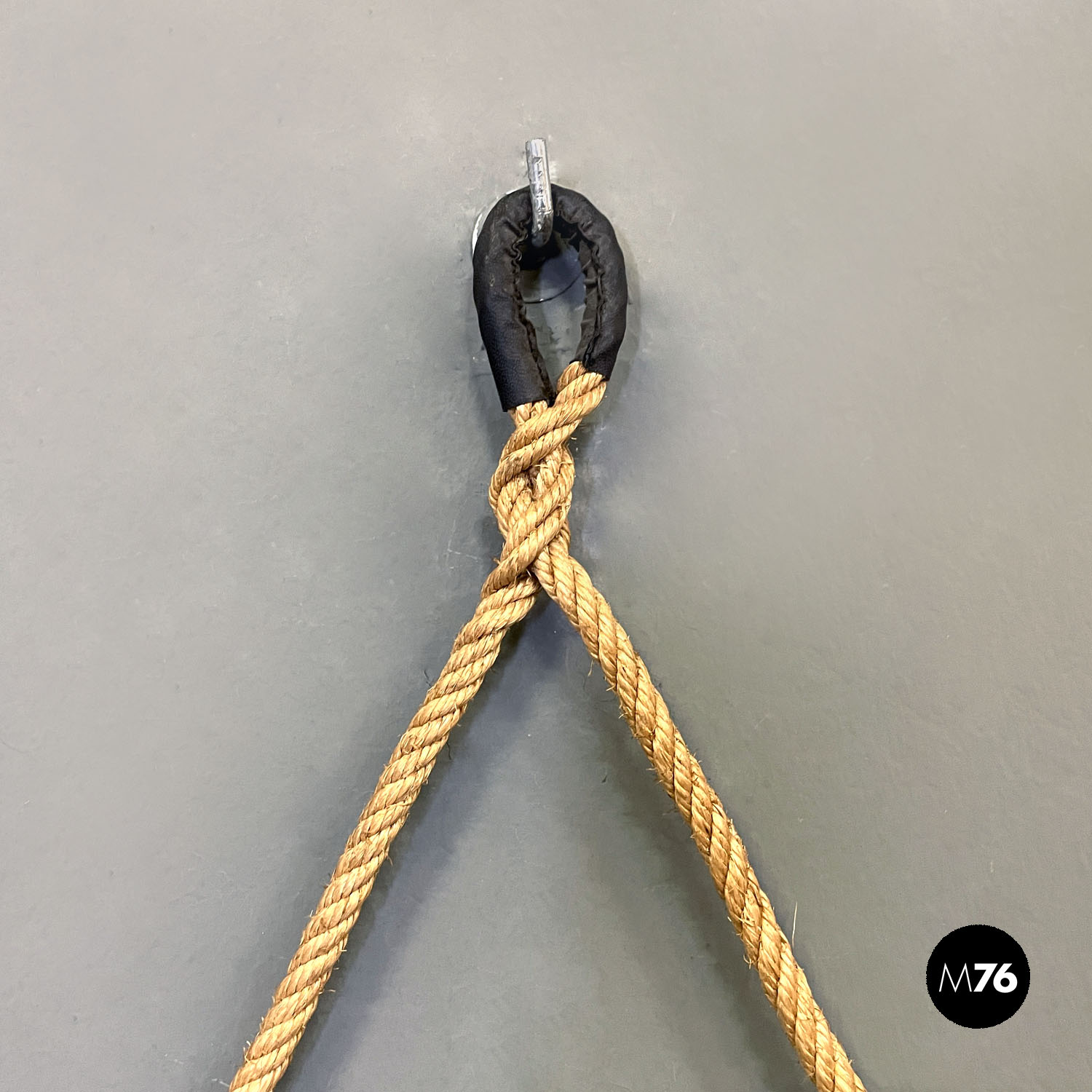 Per appendere lo specchio alla parete è presente una corda, fissata con due borchie in ottone, con un’occhiello parte superiore. La parte della corda che forma l’occhiello e le due parte finali sono rivestite in pelle nera, e terminano con due nappe decorative sempre in pelle nera.