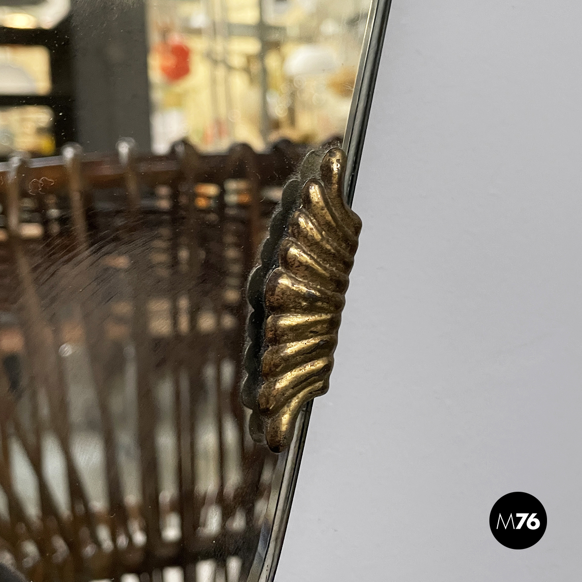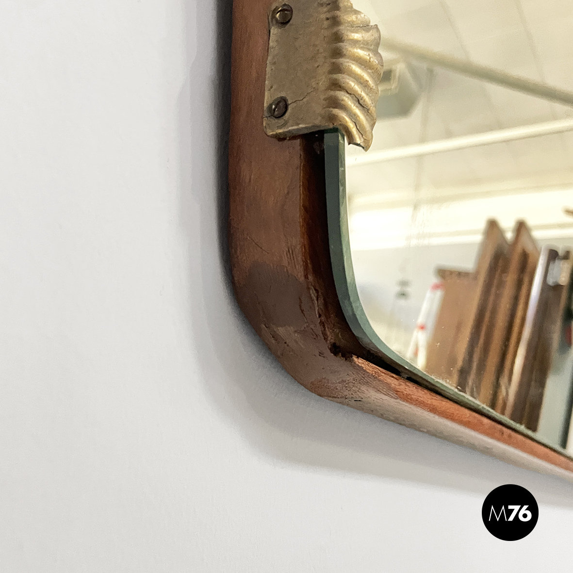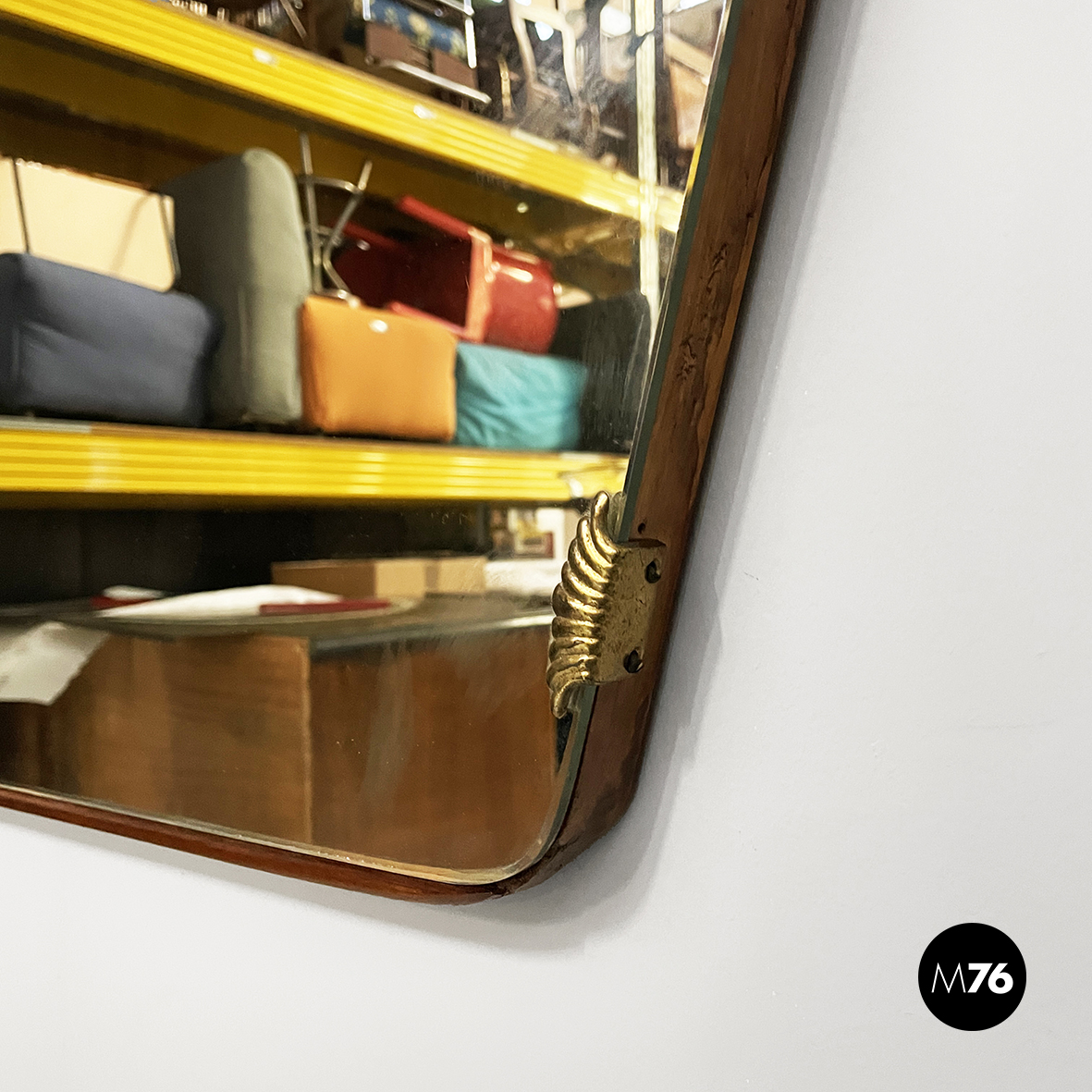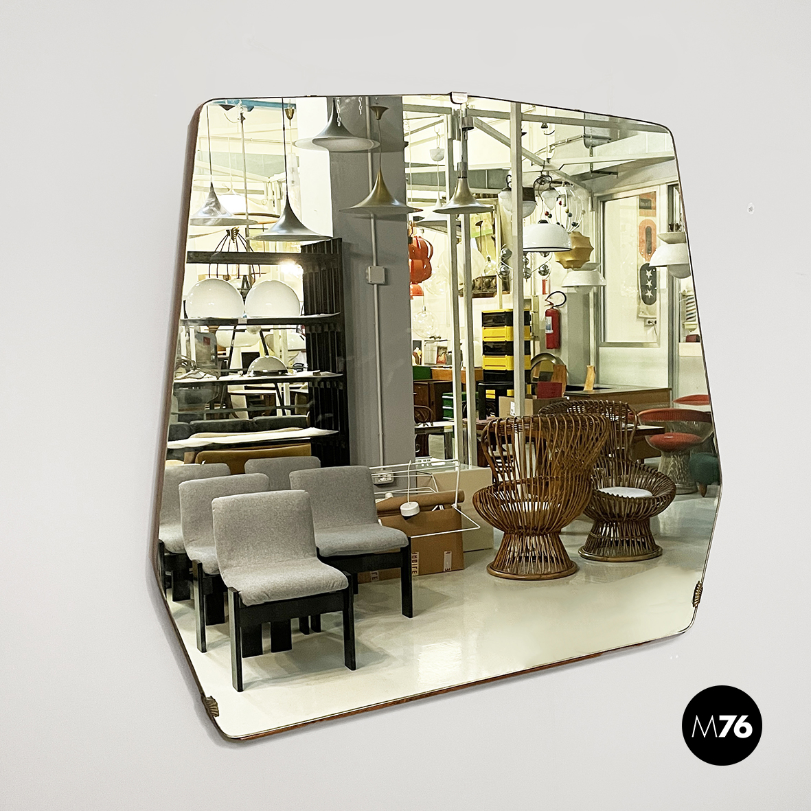 Specchio da parete d forma geometrica con struttura in legno. Sui lati sono presenti 3 ganci: uno metallico nella parte superiore e due sui lati in ottone con forme che ricordano quelle di una conchiglia.