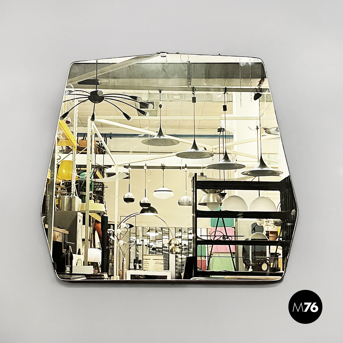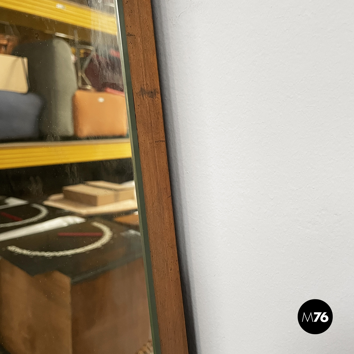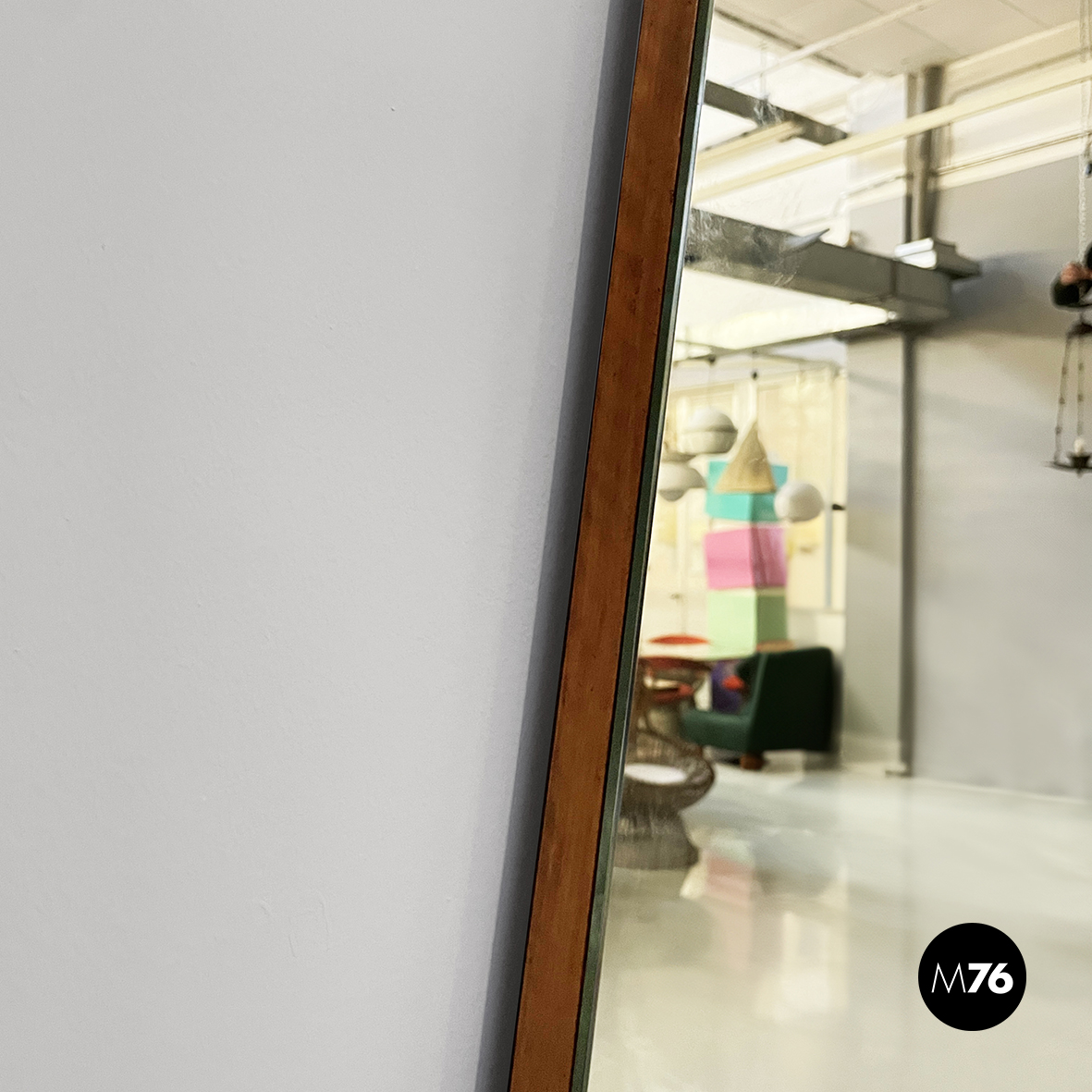 Specchio da parete d forma geometrica con struttura in legno. Sui lati sono presenti 3 ganci: uno metallico nella parte superiore e due sui lati in ottone con forme che ricordano quelle di una conchiglia.