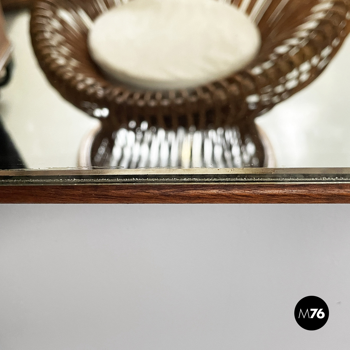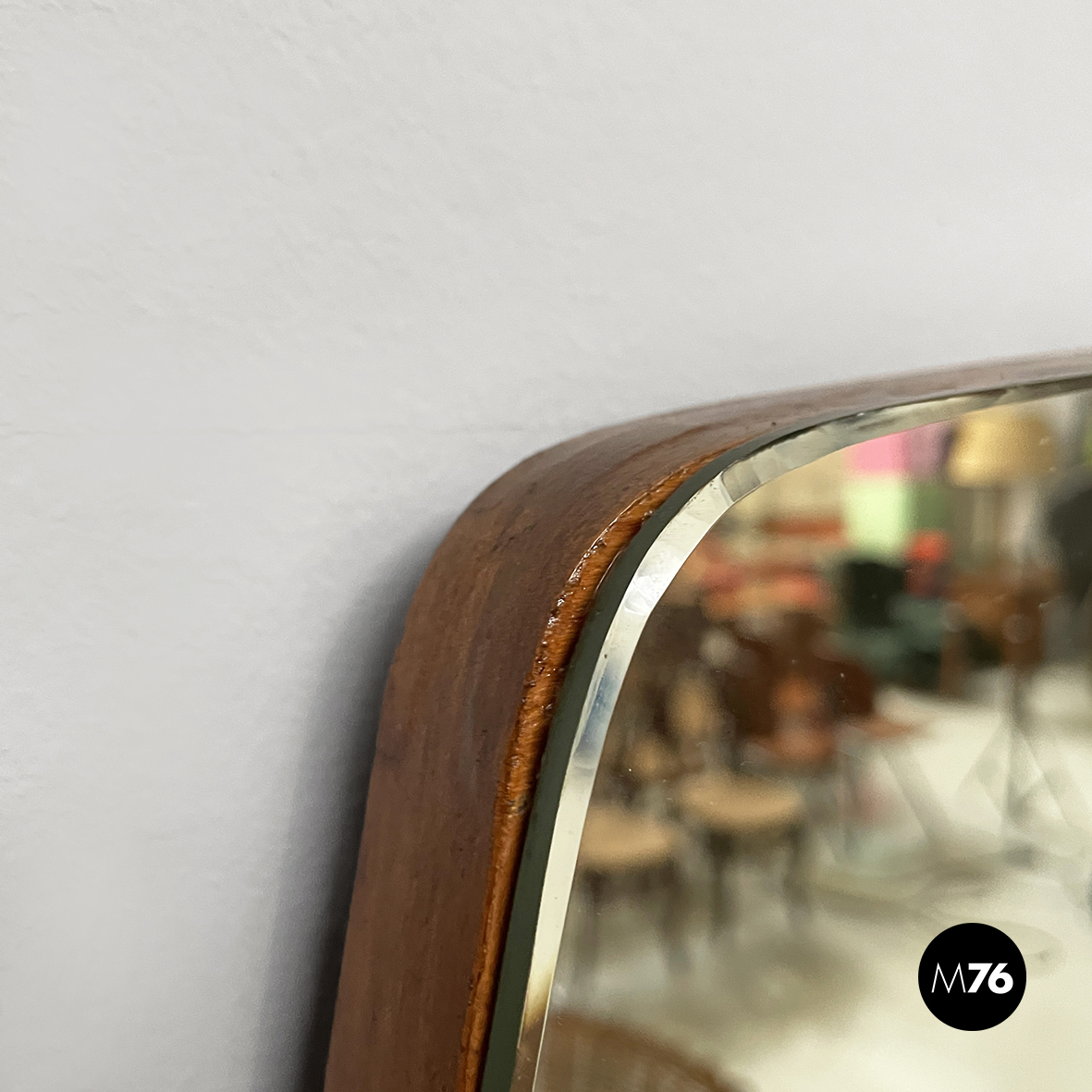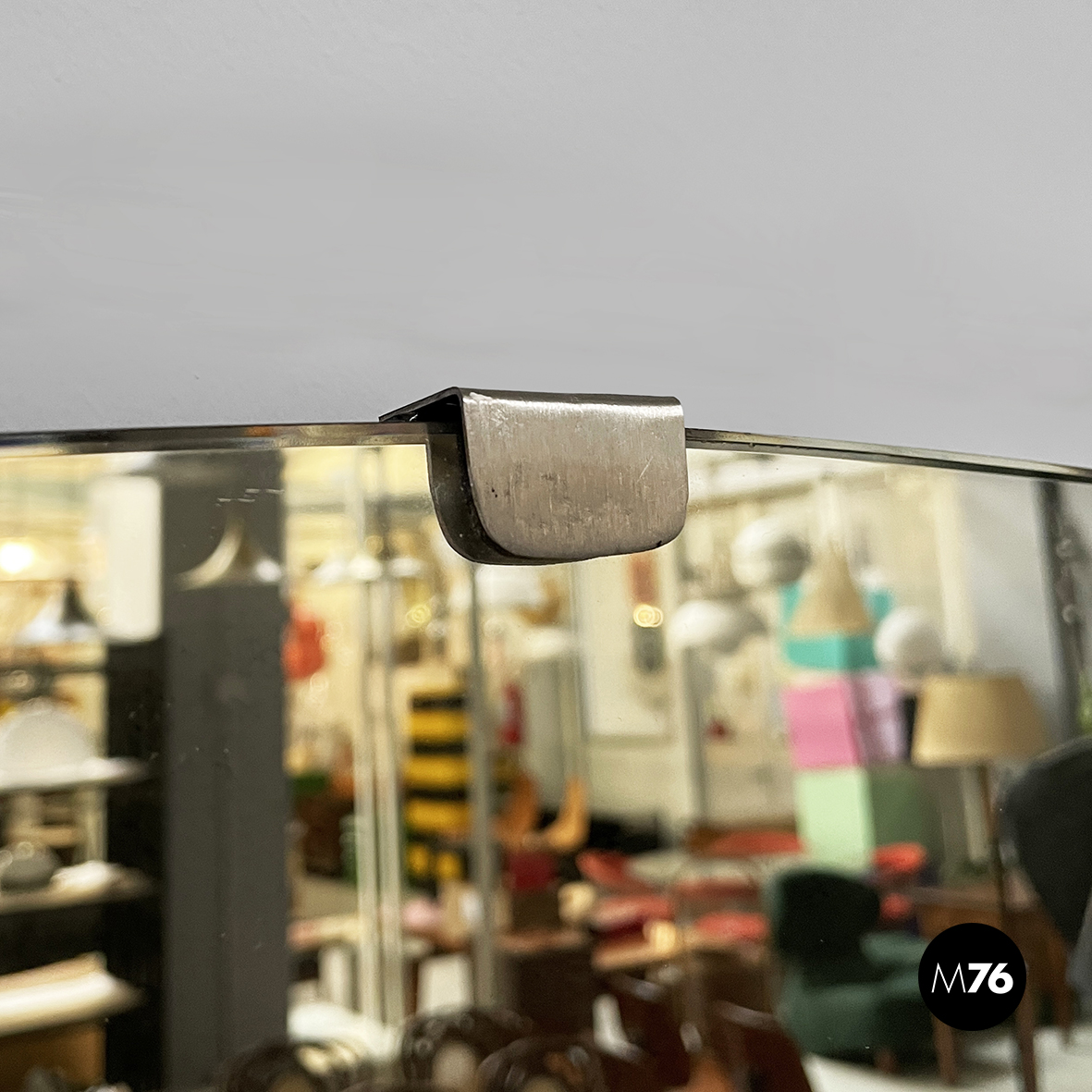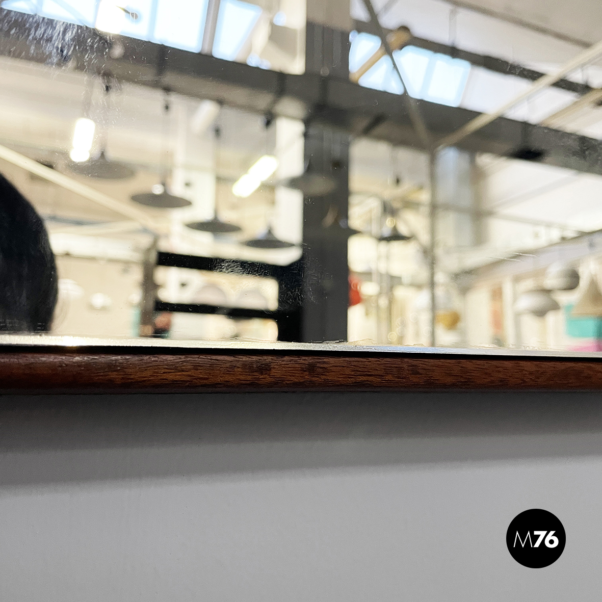 Specchio da parete d forma geometrica con struttura in legno. Sui lati sono presenti 3 ganci: uno metallico nella parte superiore e due sui lati in ottone con forme che ricordano quelle di una conchiglia.