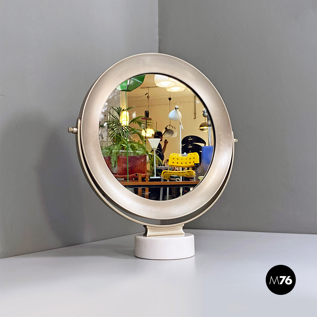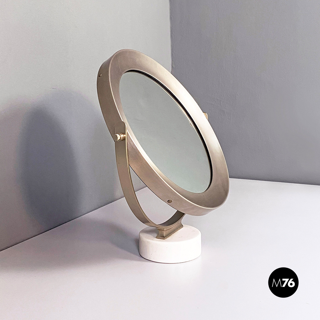 Specchio da tavolo modello Narciso, con base cilindrica in marmo bianco di Carrara e struttura di sostegno allo specchio basculante in acciaio satinato, così come la cornice.