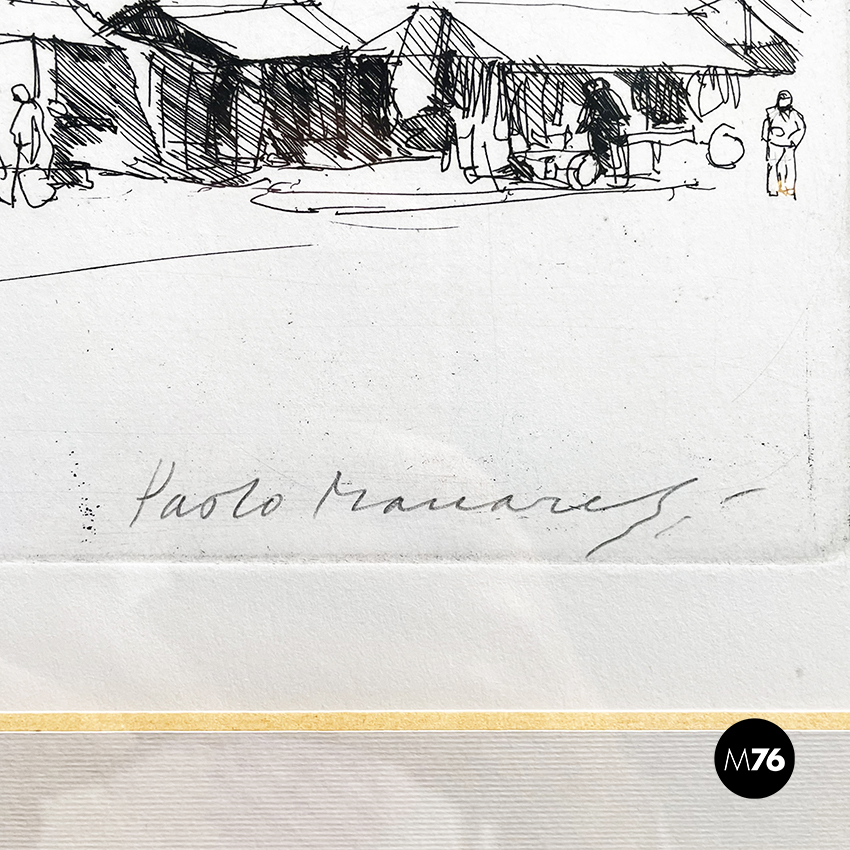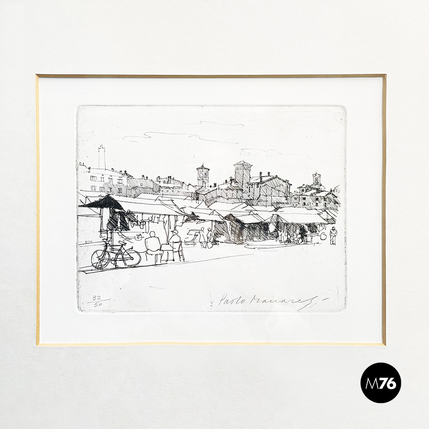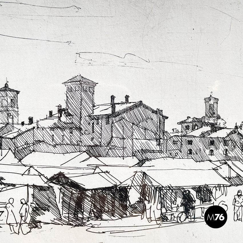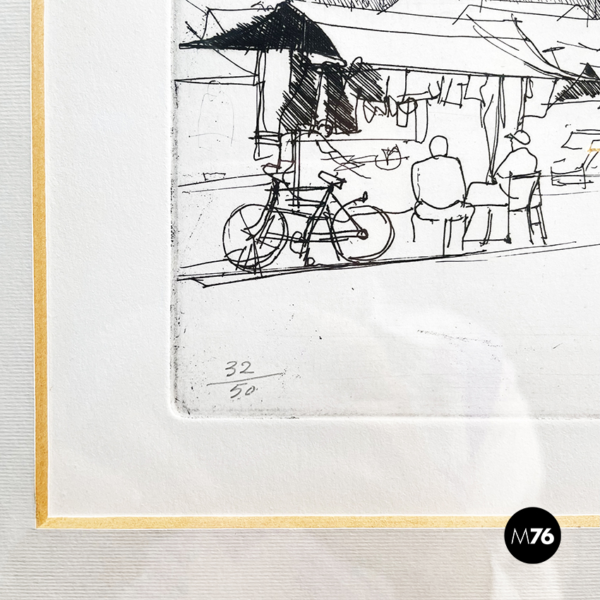 Stampa realizzata con la tecnica di incisione su carta, rappresentante uno schizzo del mercato di Bologna. In passepartout bianco e cornice in legno.