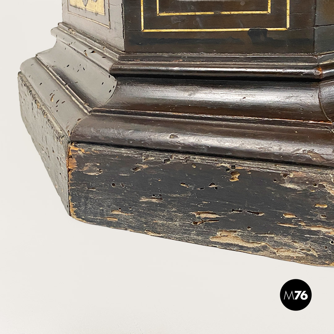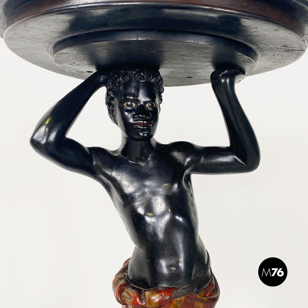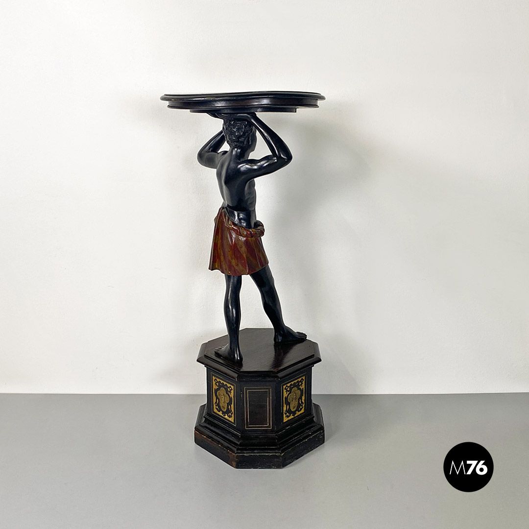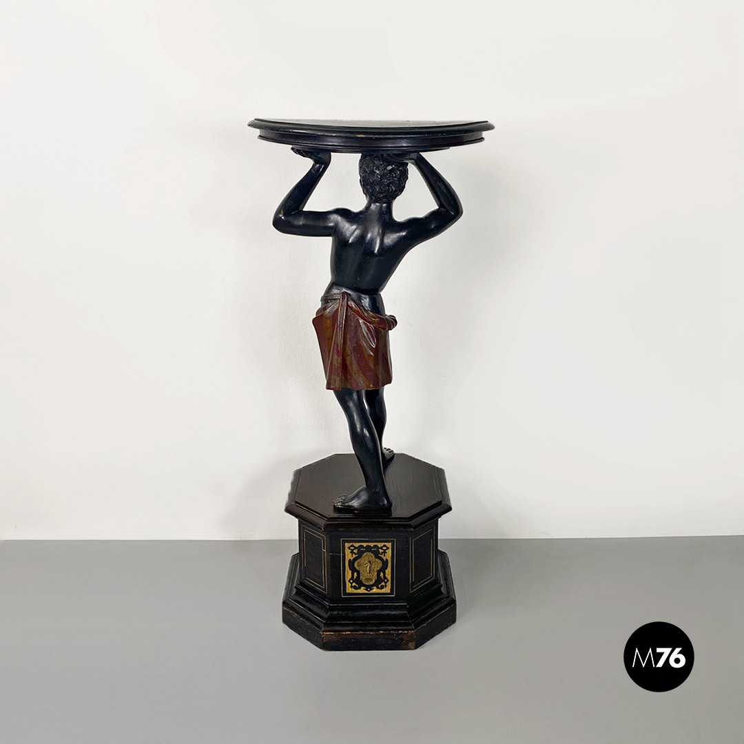 Statua del Moro, utilizzabile come colonna o piedistallo grazie al suo vassoio. Interamente realizzata in legno ebanizzato di colore naturale con gonnellino a righe sui toni del giallo e del rosso e decoro sulla base di forma ottagonale.