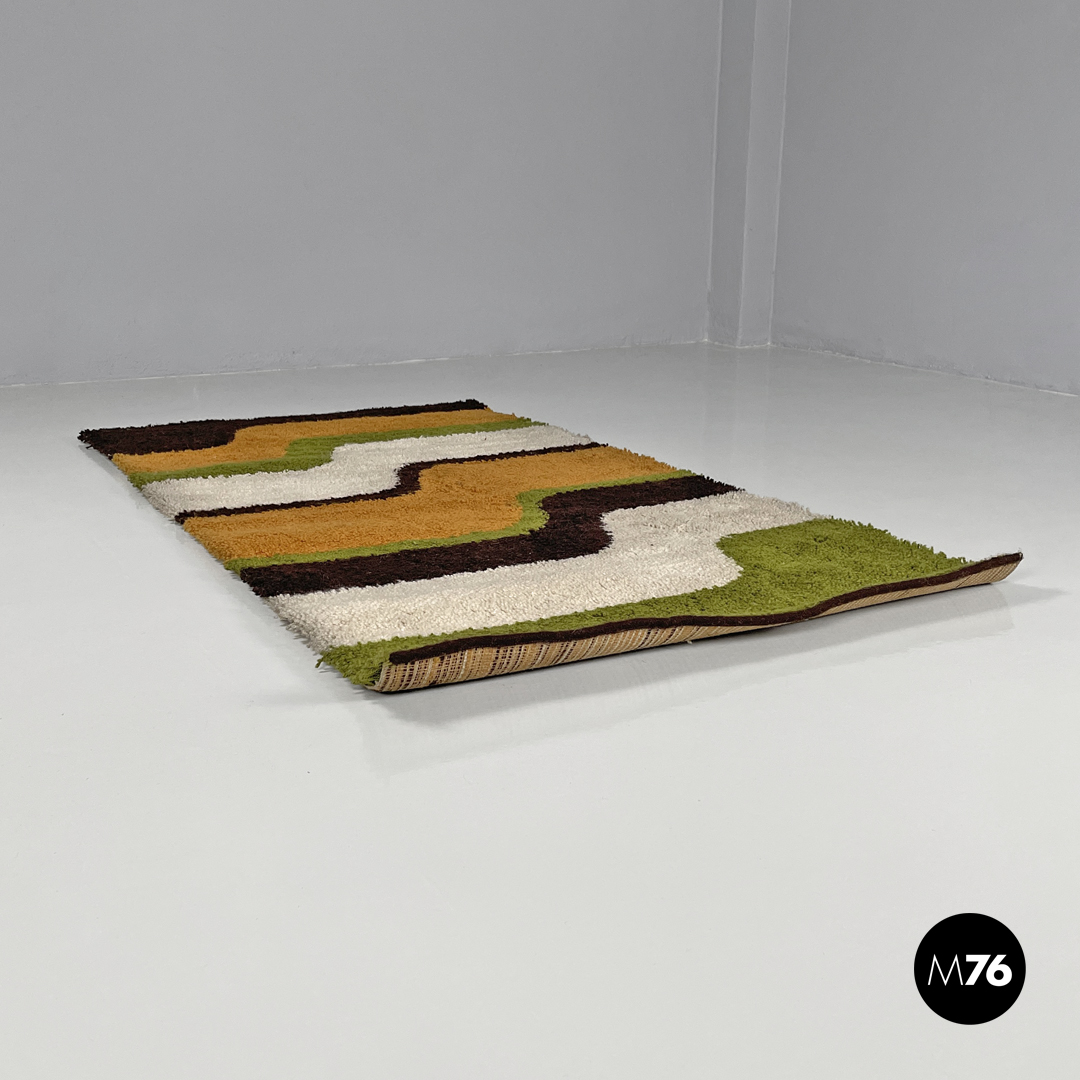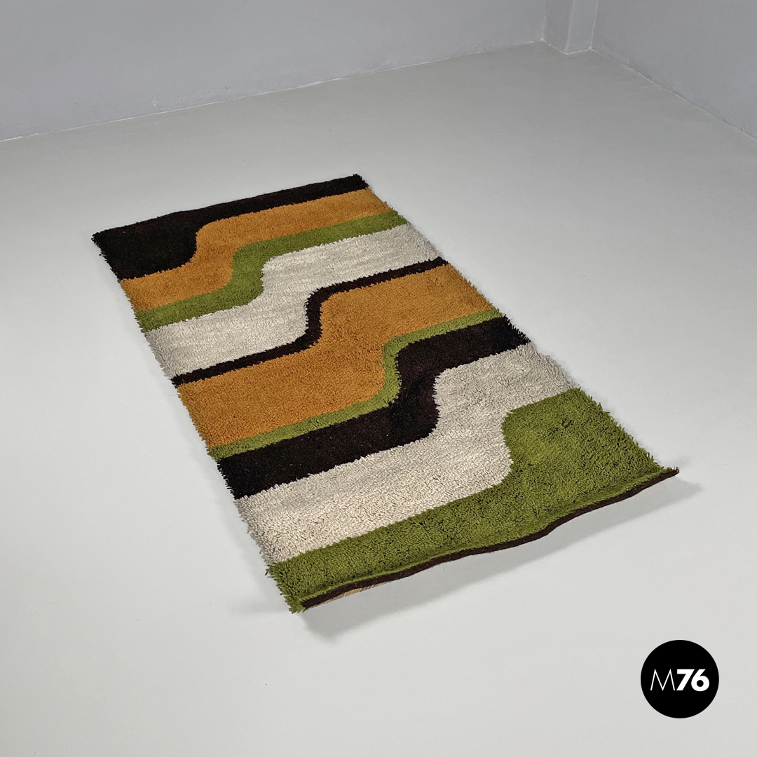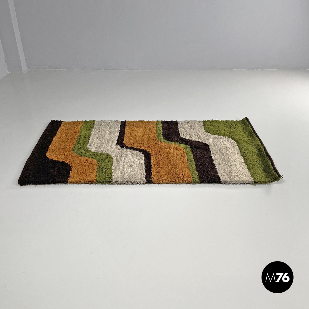 Tappeto rettangolare decorato con fasce ondulate dai colori marrone, arancione, beige e verde.