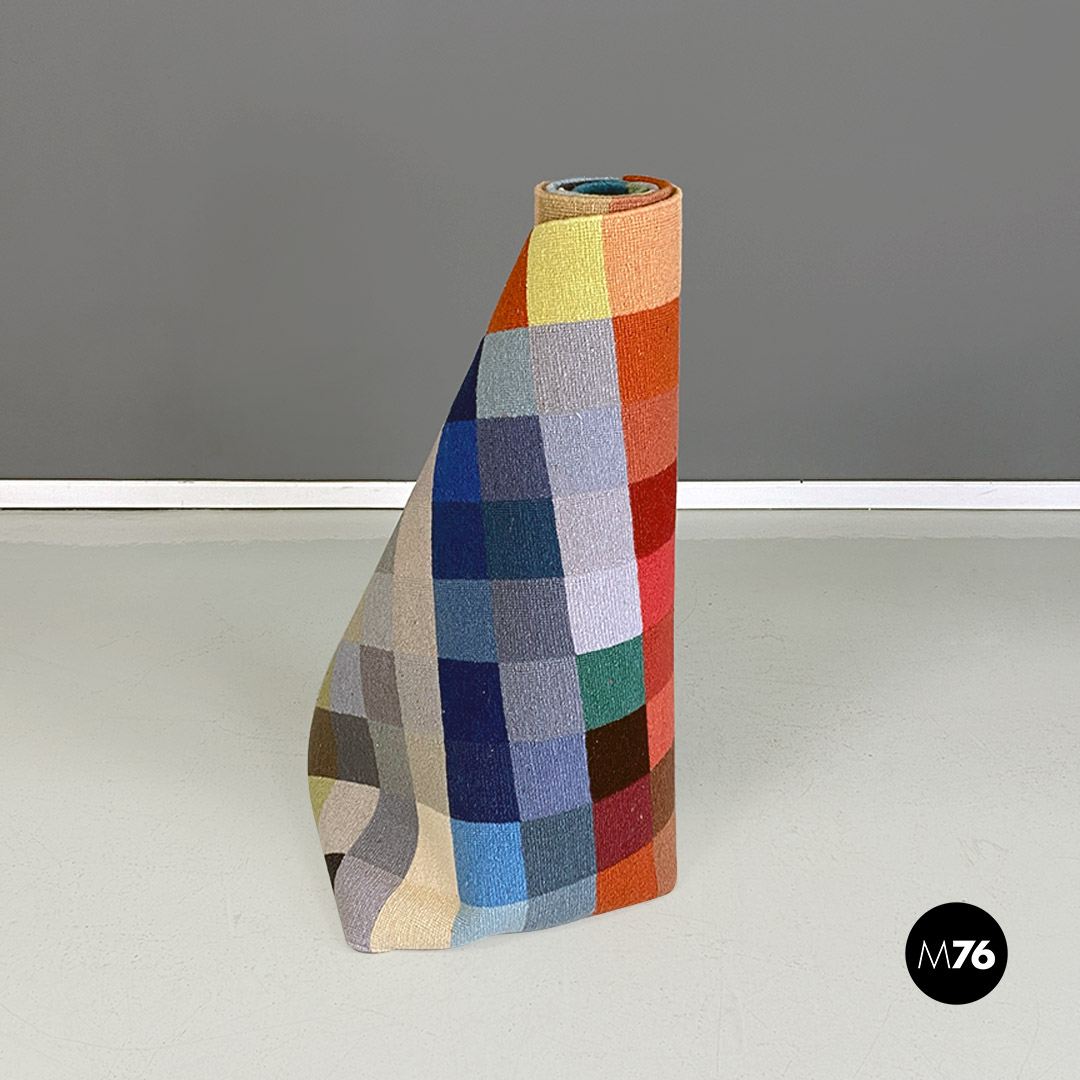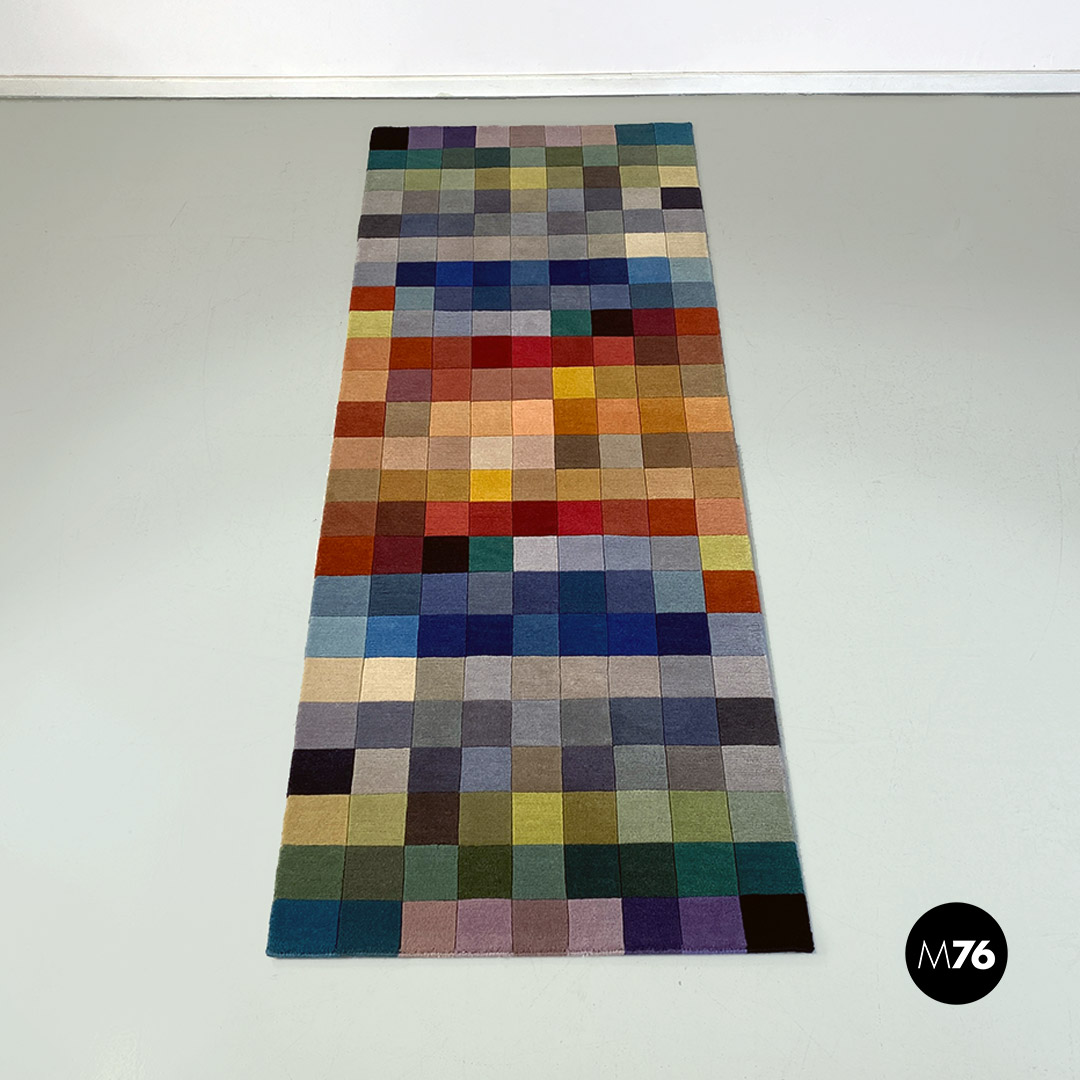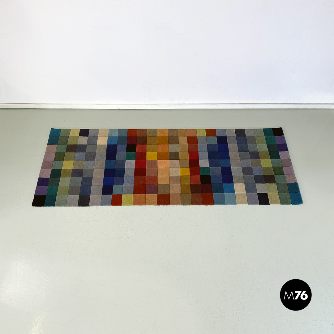 Tappeto di forma rettangolare con motivo a quadri. Tappeto dalla forma stretta e lunga, con motivo quadrettato multicolore e pelo corto. Lavorazione fatta con patchwork.