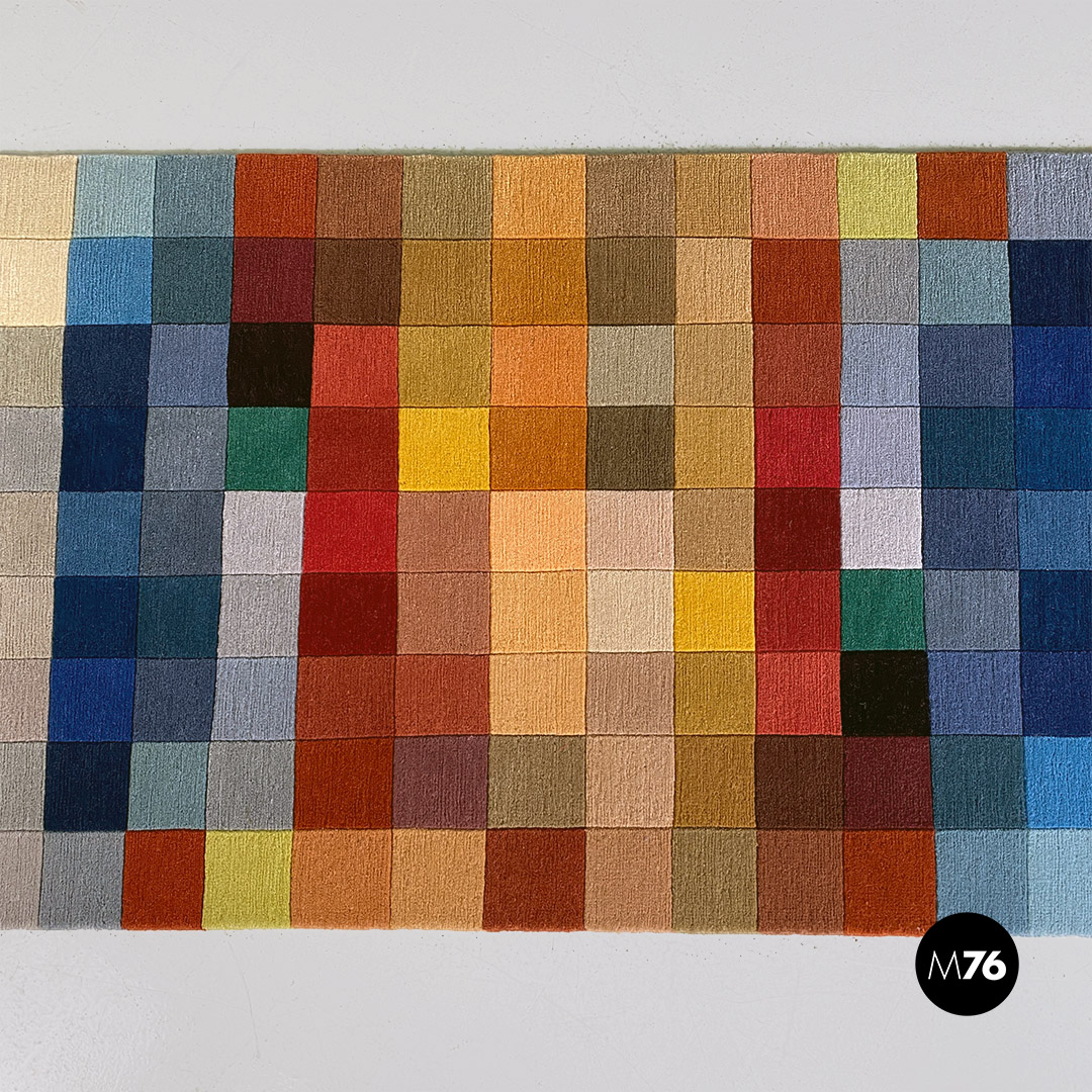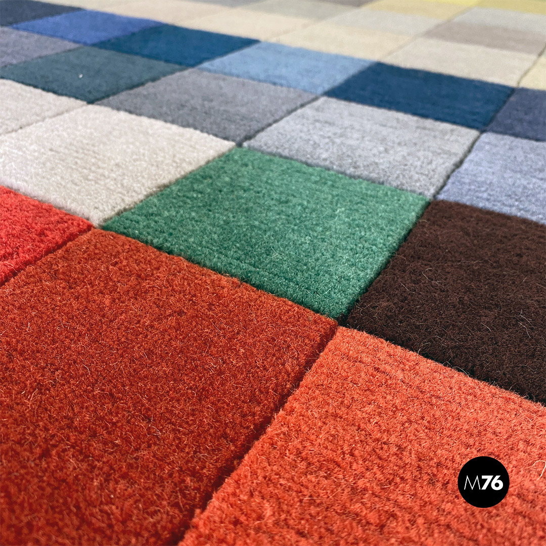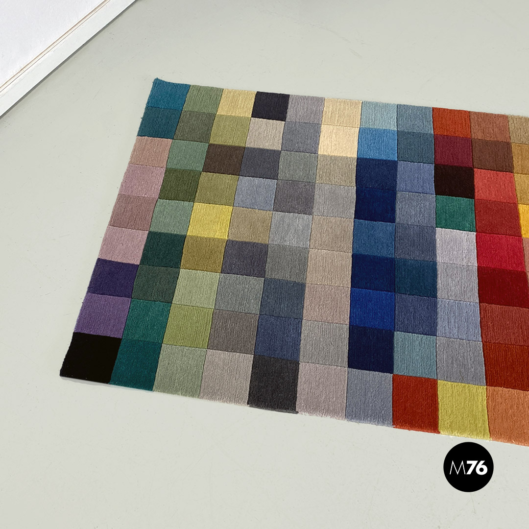 Tappeto di forma rettangolare con motivo a quadri. Tappeto dalla forma stretta e lunga, con motivo quadrettato multicolore e pelo corto. Lavorazione fatta con patchwork.