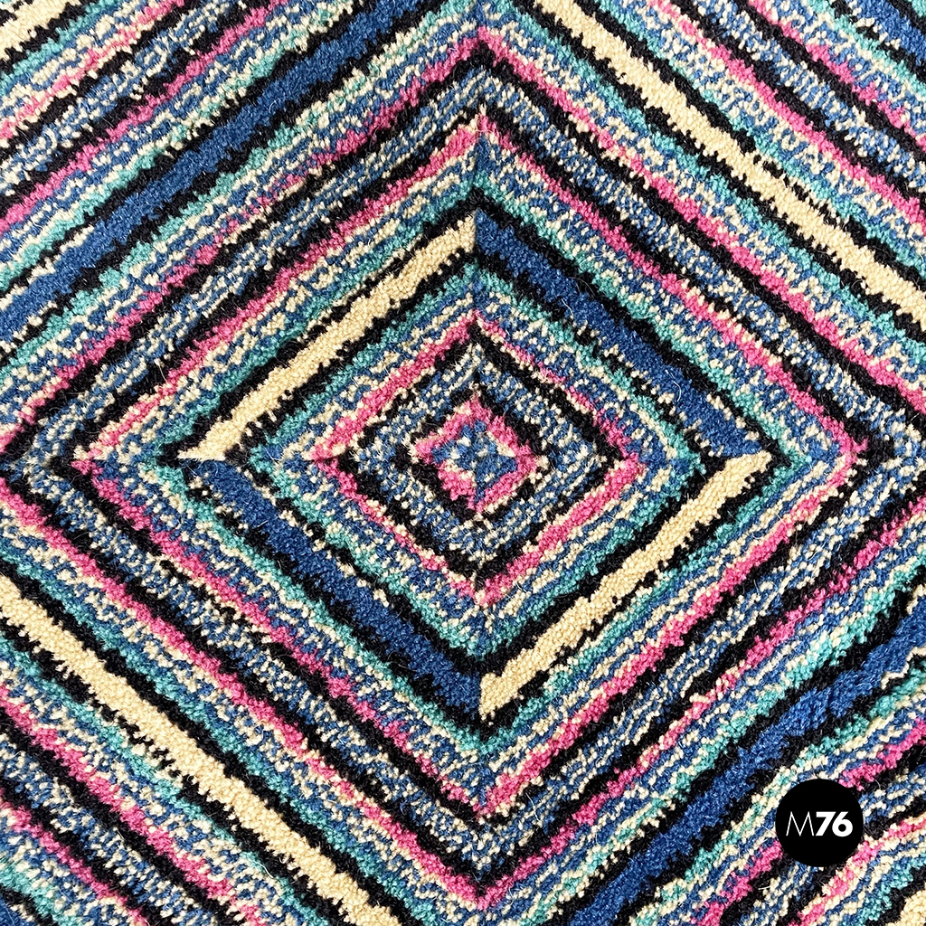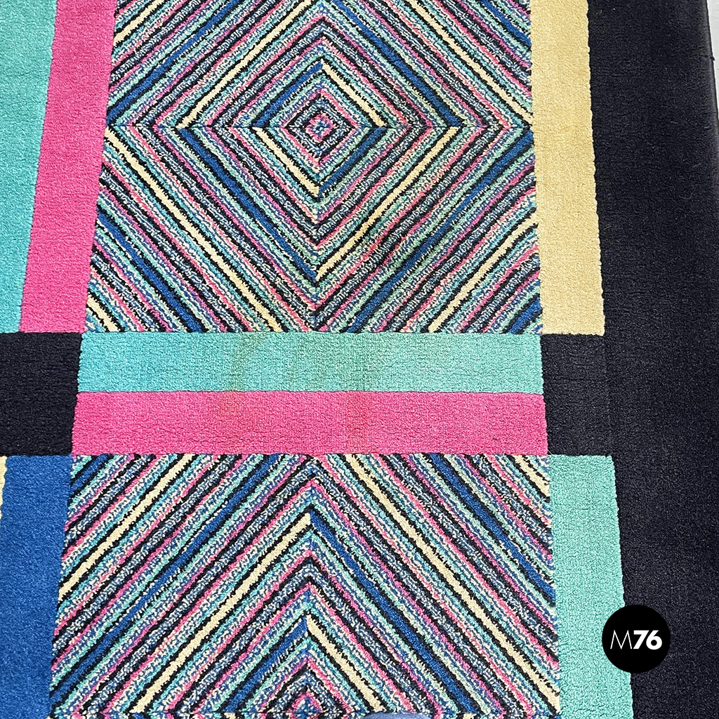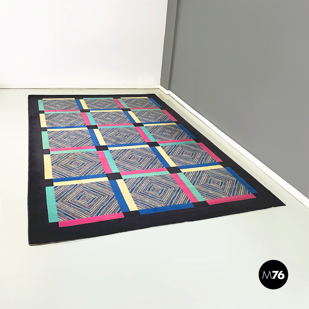 Tappeto rettangolare in tessuto di pura lana vergine. I profili del tappeto sono in nero. Gli interni sono caratterizzati da una serie di quadrati composti da righe di grosso spessore e da rombi composti da righe sottili di diversi colori: giallo, rosa, nero, blu e verde.