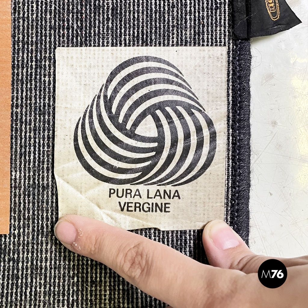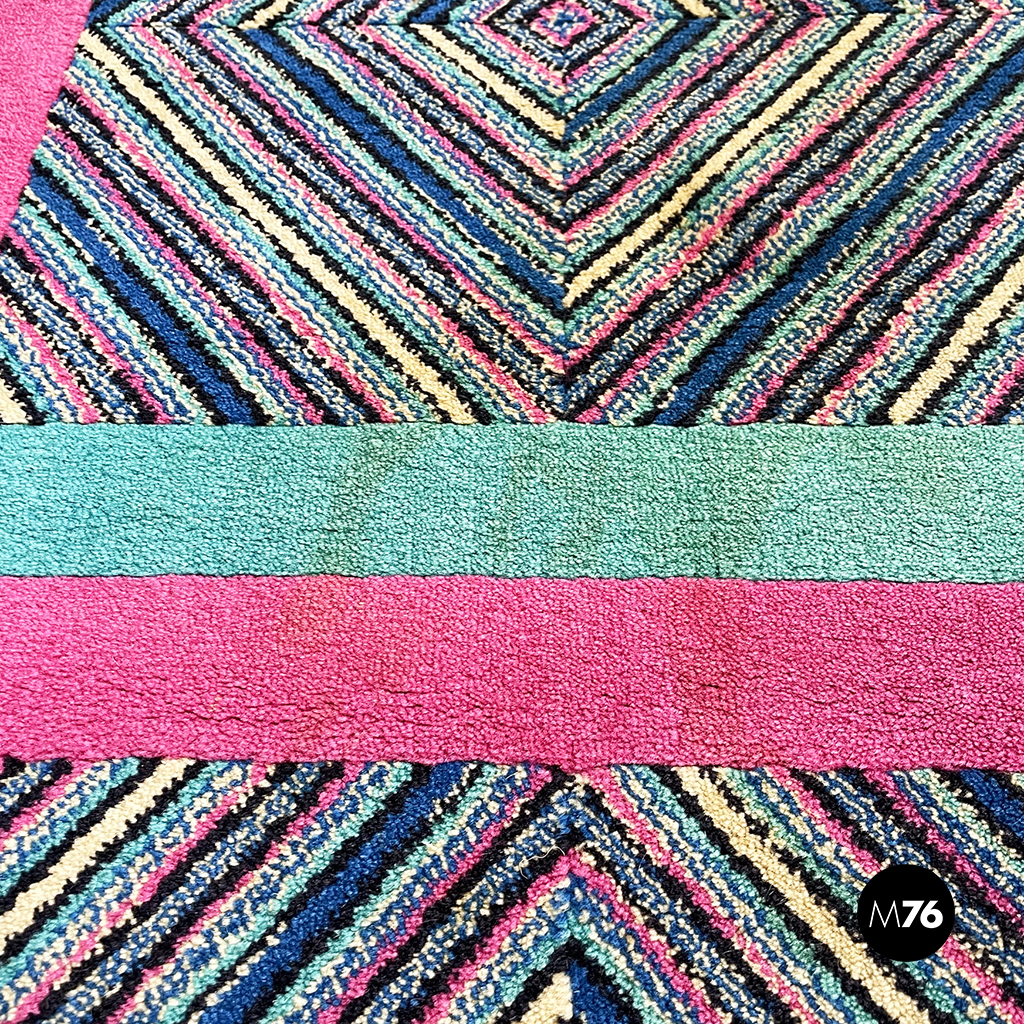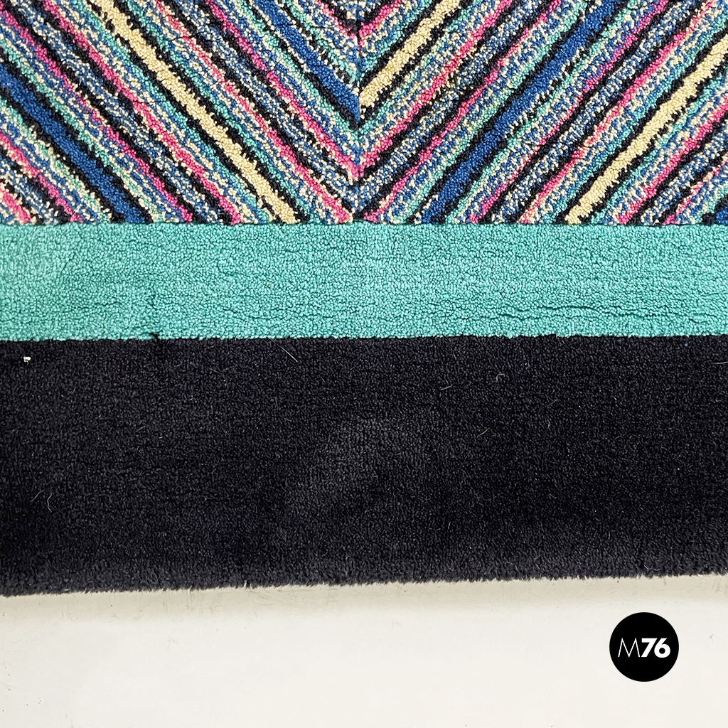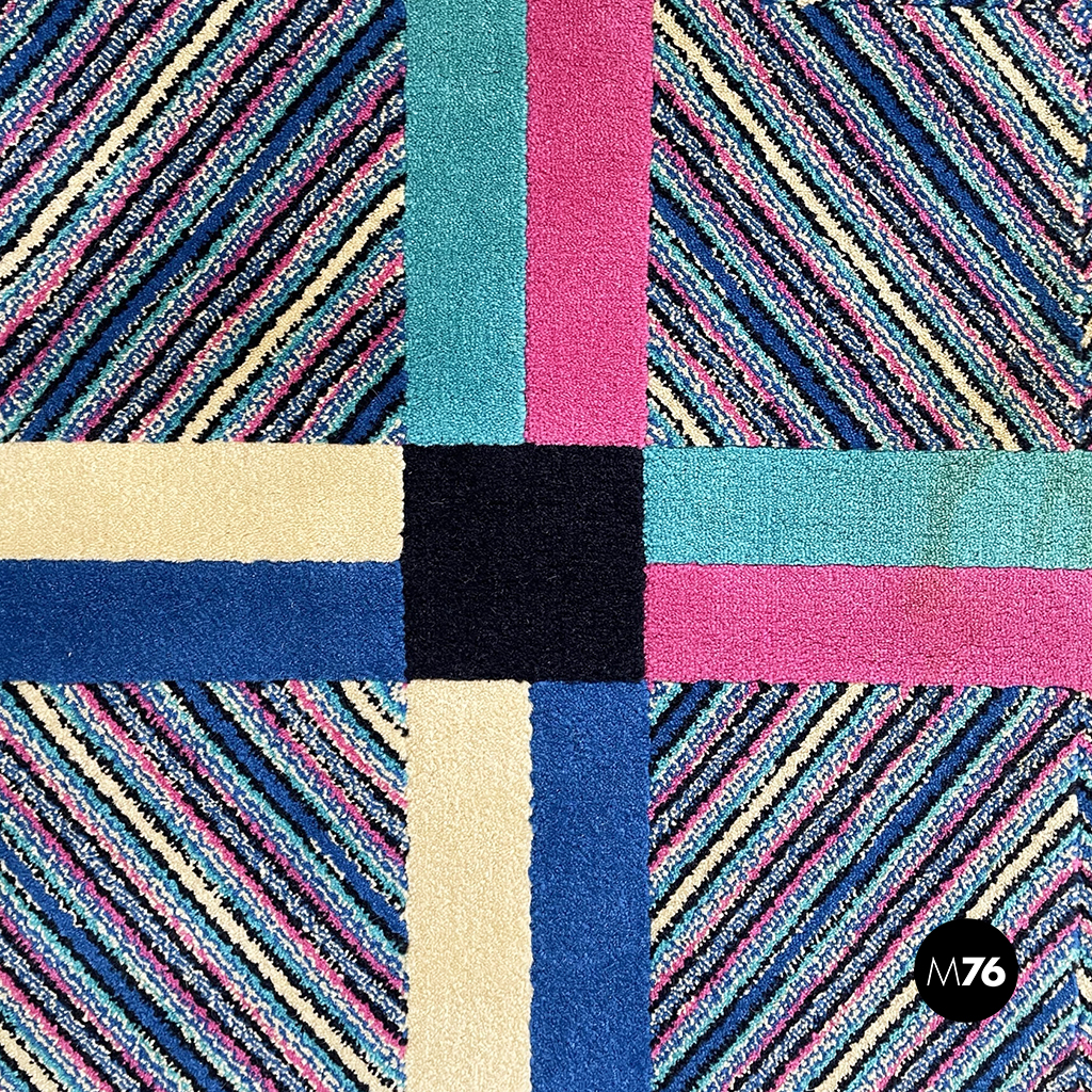 Tappeto rettangolare in tessuto di pura lana vergine. I profili del tappeto sono in nero. Gli interni sono caratterizzati da una serie di quadrati composti da righe di grosso spessore e da rombi composti da righe sottili di diversi colori: giallo, rosa, nero, blu e verde.
