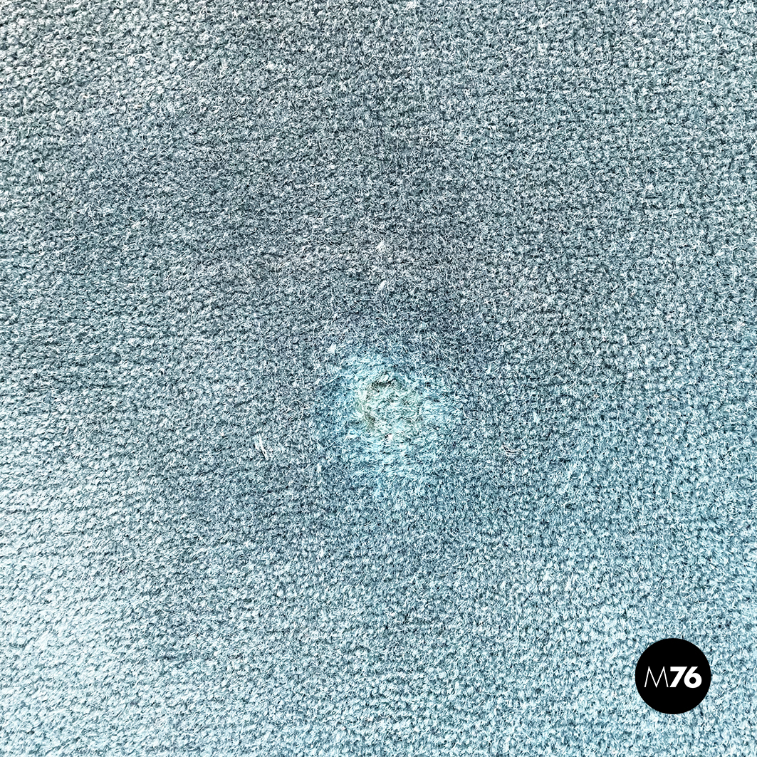 Tappeto tondo di grandi dimensioni a pelo corto. Il tappeto presenta al suo interno i colori azzurro chiaro e verde scuro, con alcuni accenni di giallo e rosso. I disegni riprendono forme geometriche: è presente un rombo centrale, diversi piccoli triangoli e delle linee che seguono la forma circolare del tappeto e la forma del rombo.
