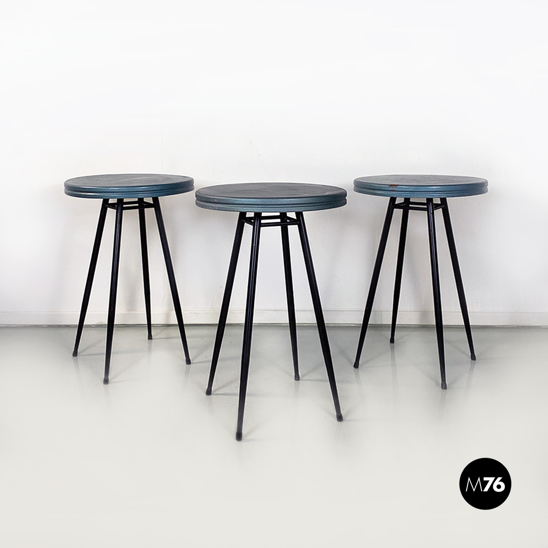 Set di tre tavoli da bar con piano in metallo verniciato blu di forma tonda e zampe in metallo nero.