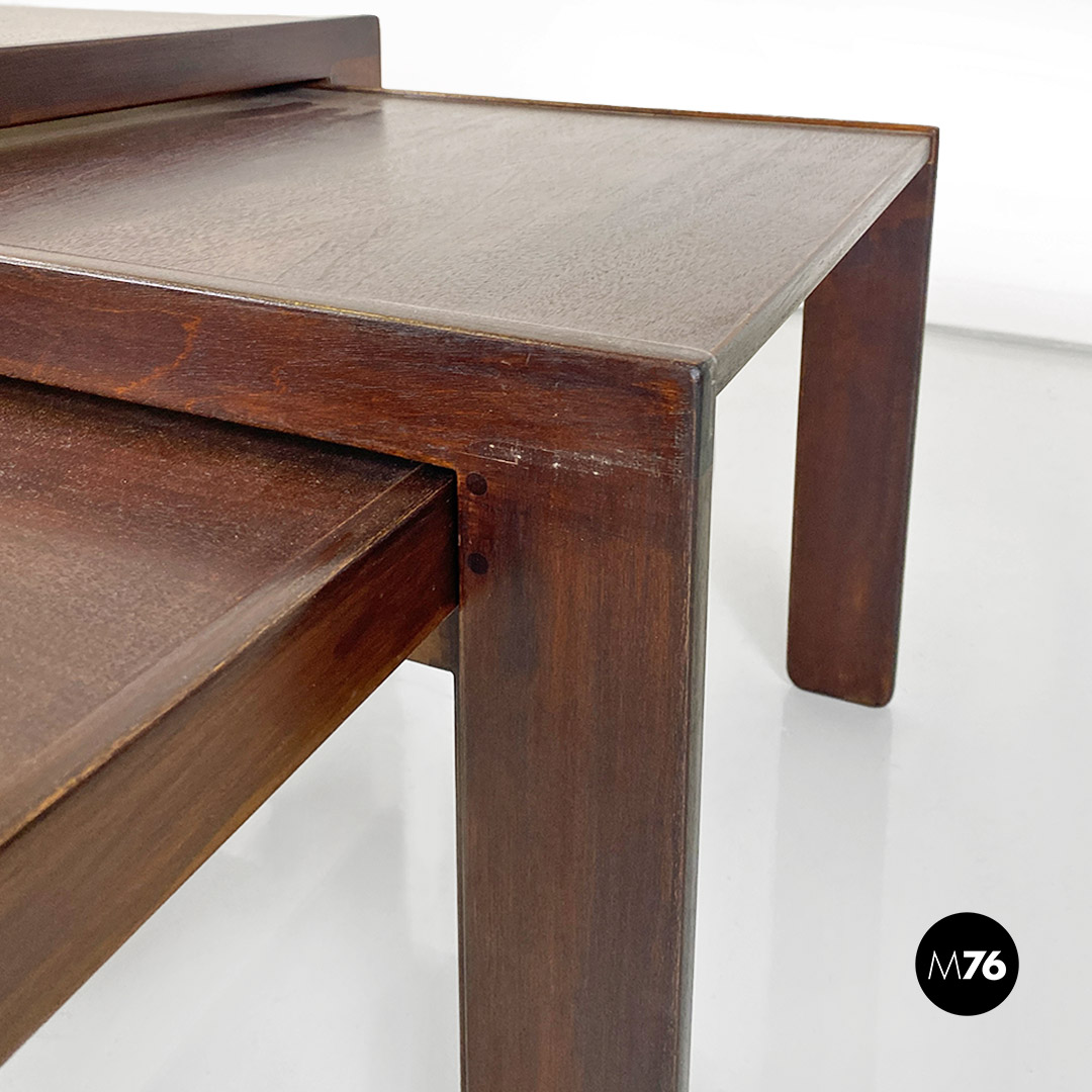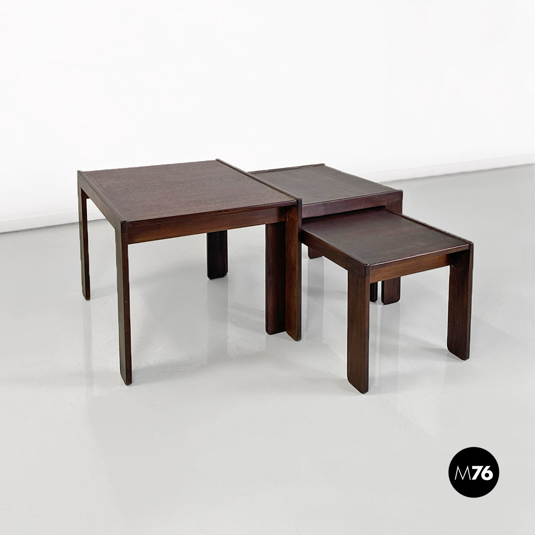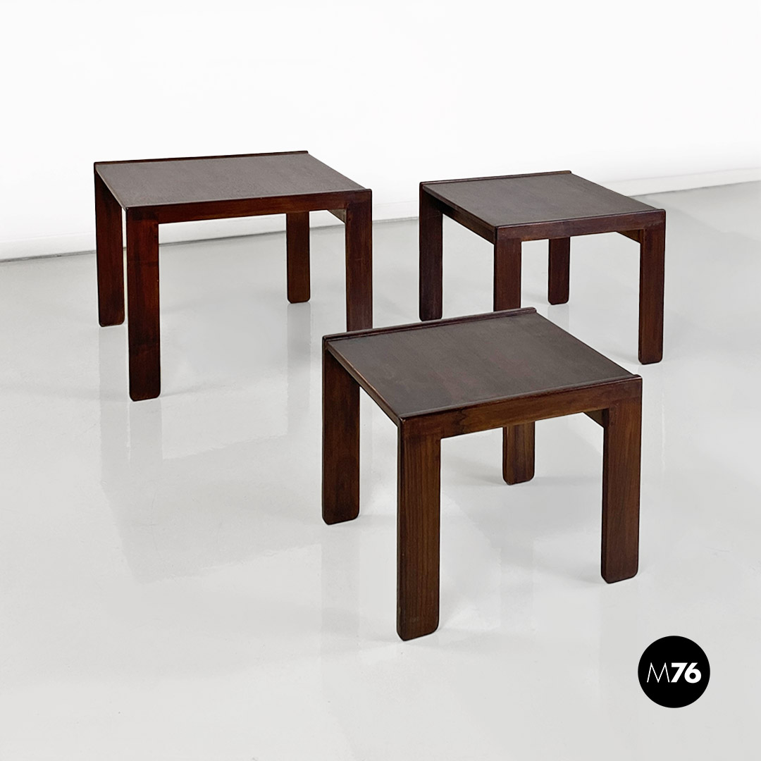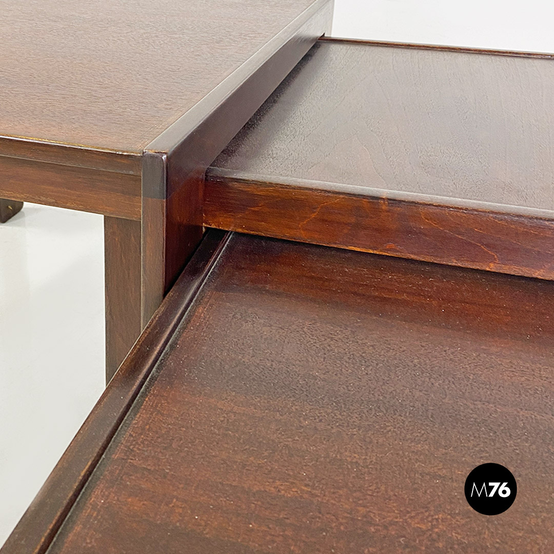 Tris di tavoli da caffè modello 777 con struttura in legno massello scuro. Il tavolo di media e quello di piccola dimensione hanno la possibilità di stare uno dentro l’altro e all’interno del più grande creando un incastro tra i tre.