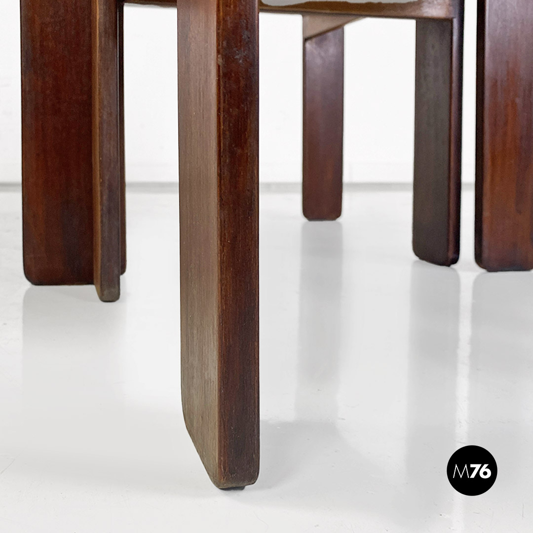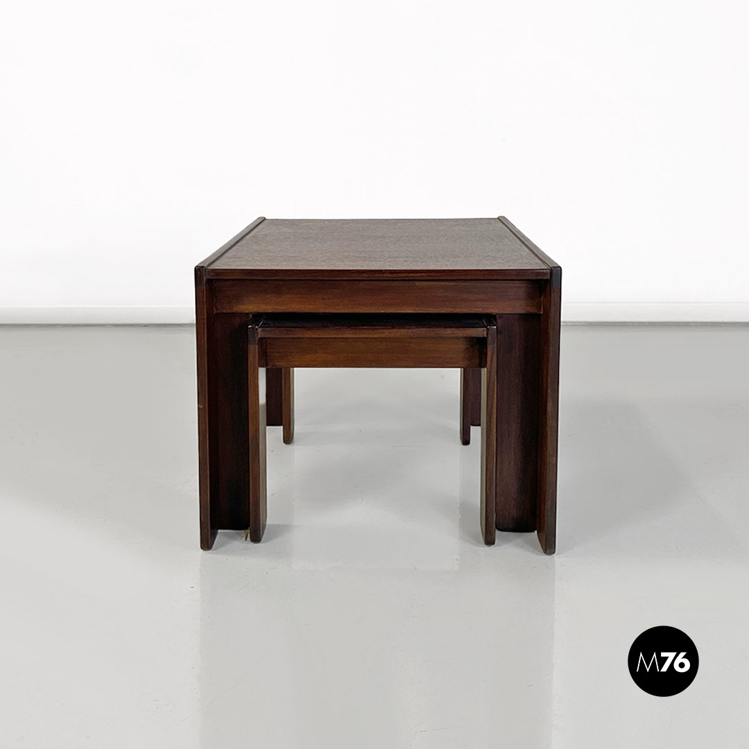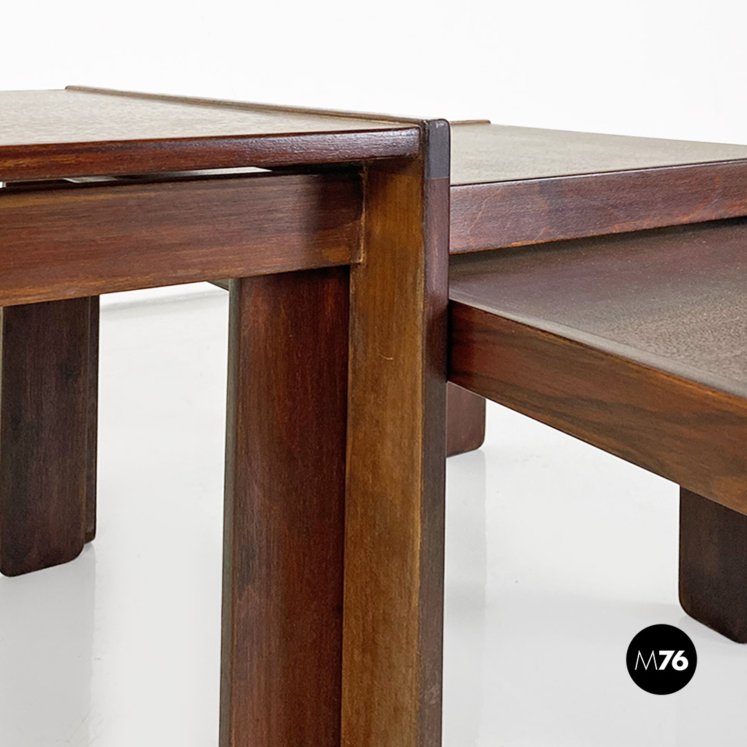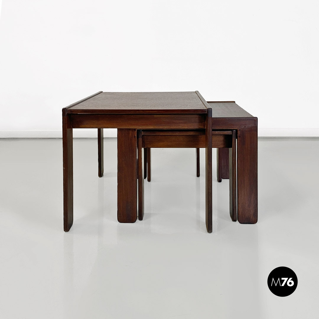 Tris di tavoli da caffè modello 777 con struttura in legno massello scuro. Il tavolo di media e quello di piccola dimensione hanno la possibilità di stare uno dentro l’altro e all’interno del più grande creando un incastro tra i tre.