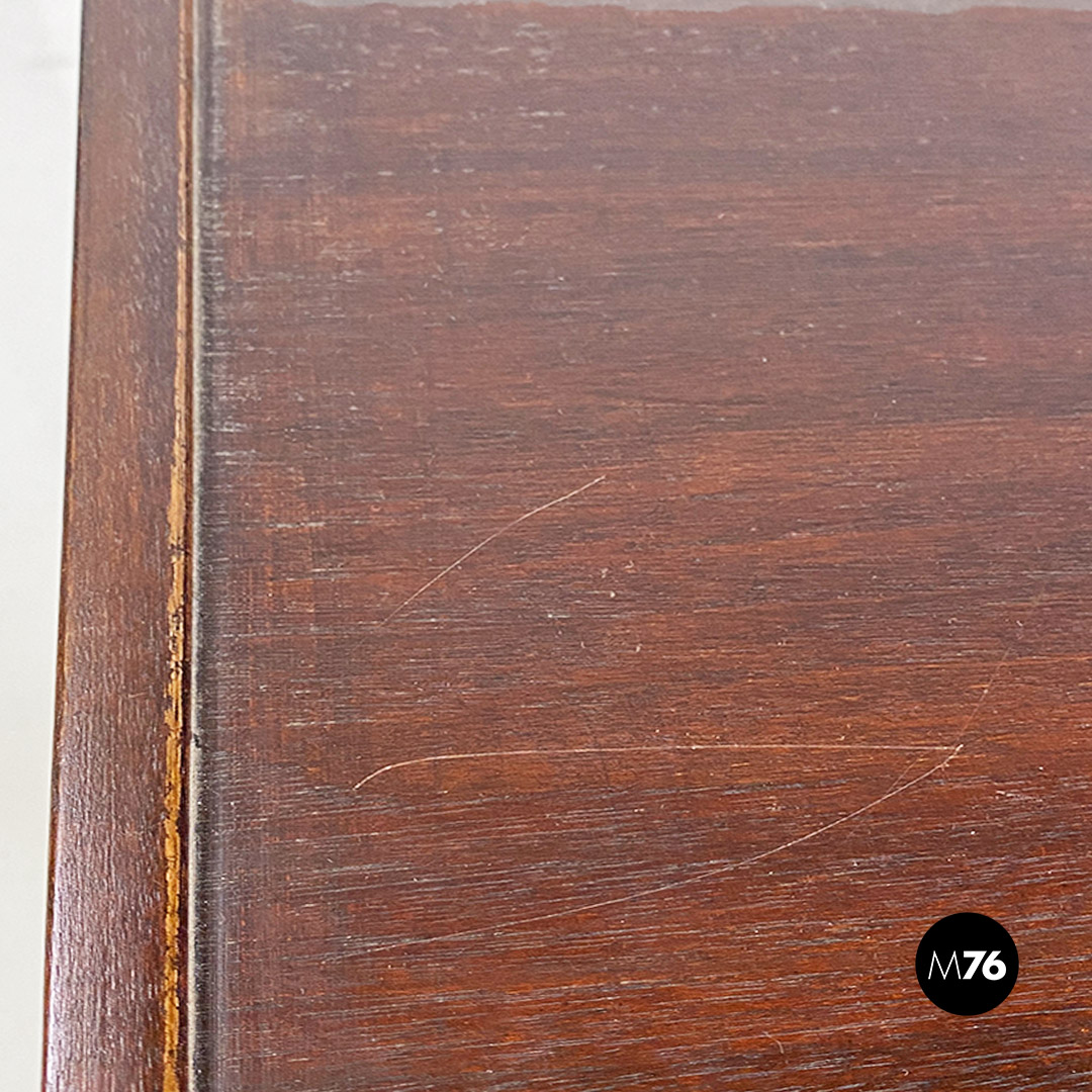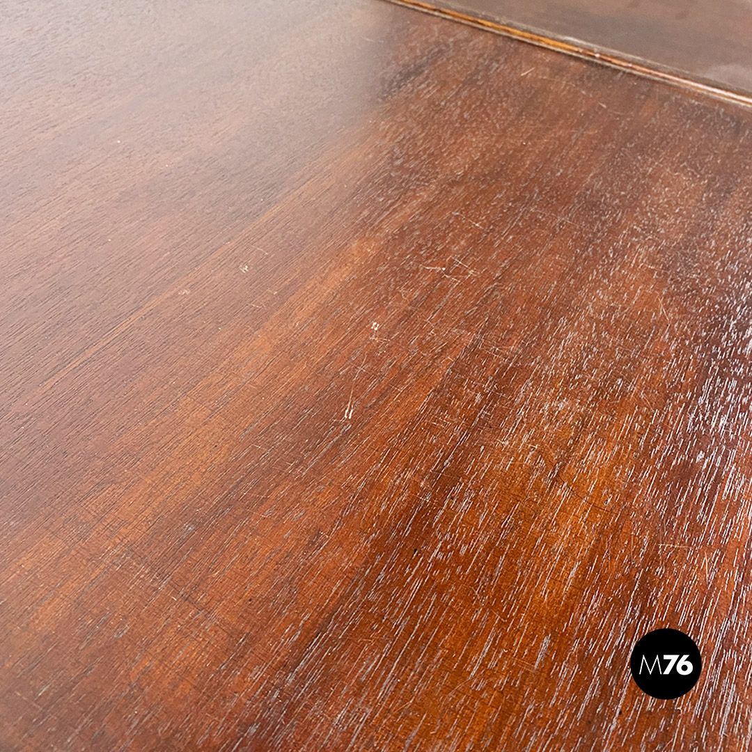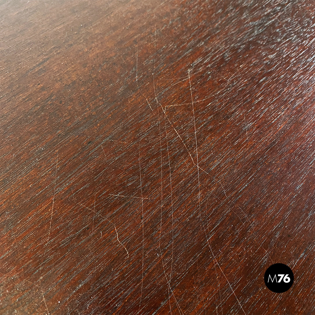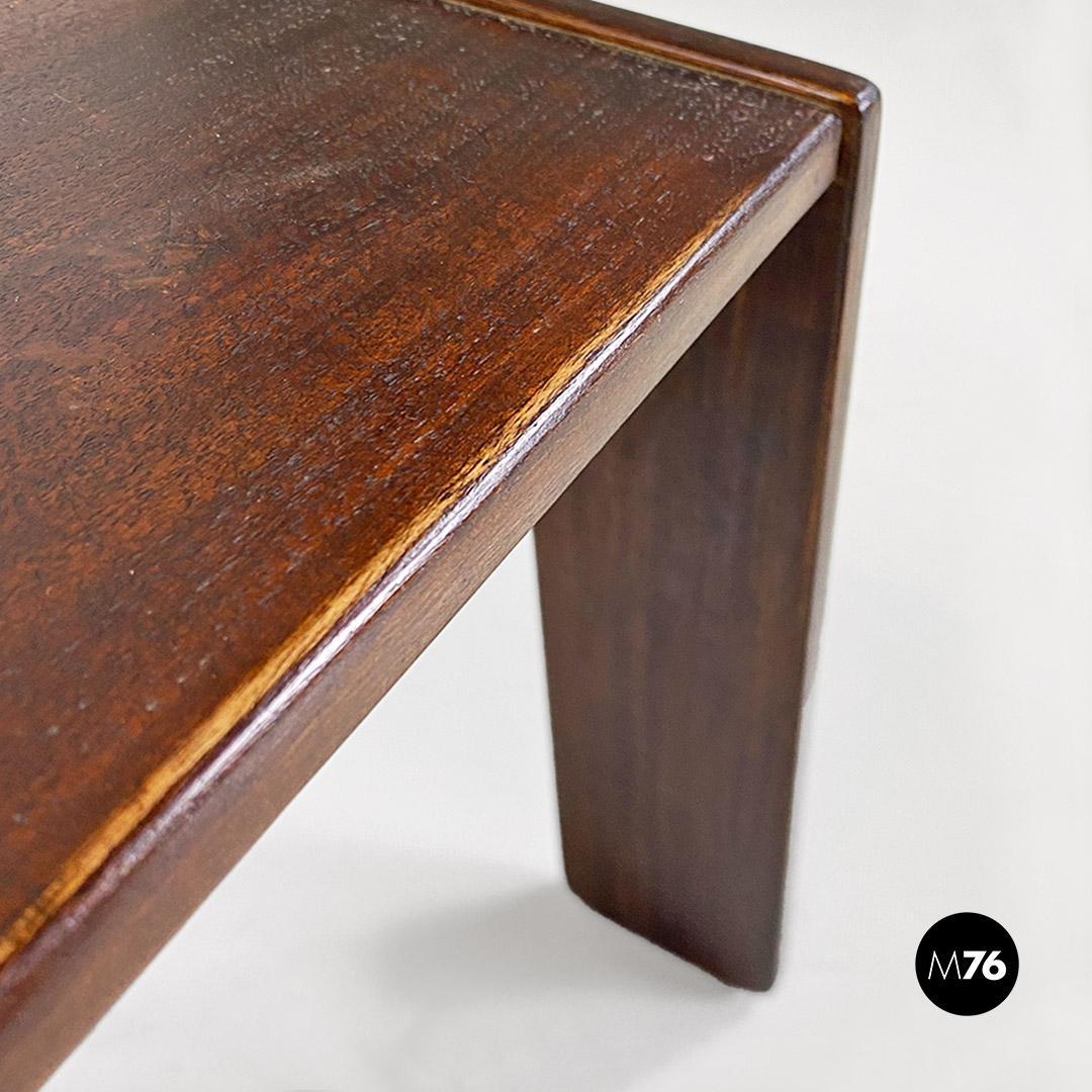 Tris di tavoli da caffè modello 777 con struttura in legno massello scuro. Il tavolo di media e quello di piccola dimensione hanno la possibilità di stare uno dentro l’altro e all’interno del più grande creando un incastro tra i tre.