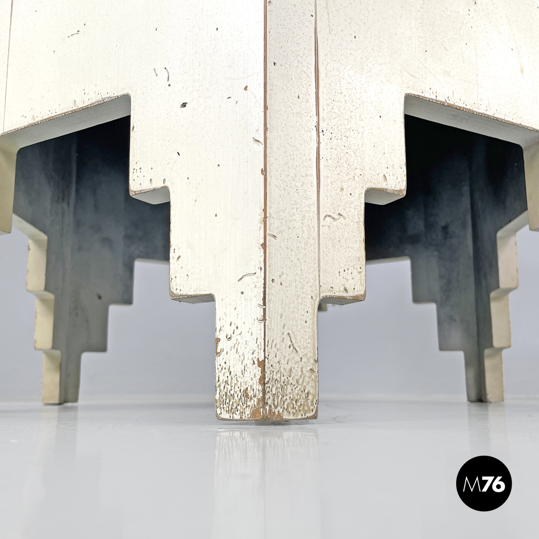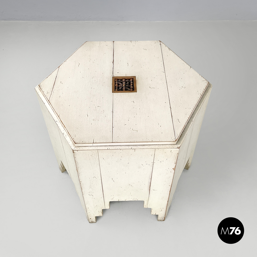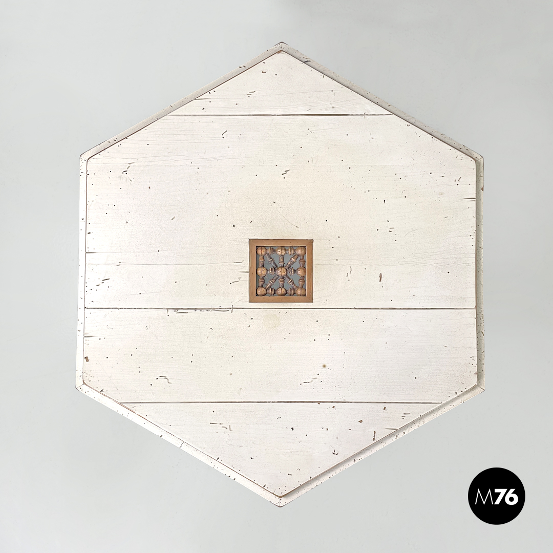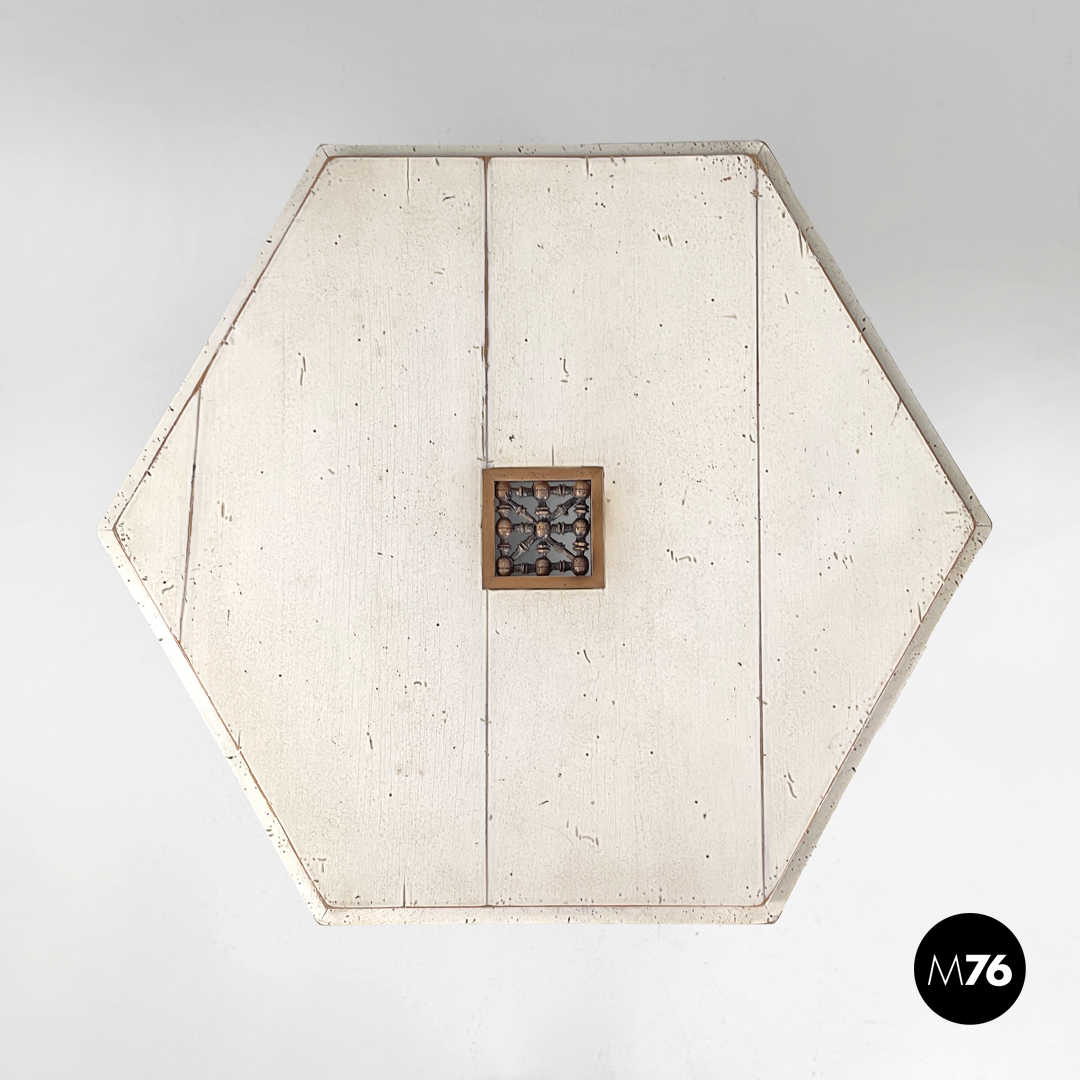 Coppia di tavoli da caffè esagonali in legno dipinti di bianco. Sul piano si trova un foro con una decorazione in legno lavorata. Le sei gambe presentano linee geometriche decorative che creano degli “scalini” che vanno a stringersi verso l’appoggio a terra. Utilizzabile anche come comodini.