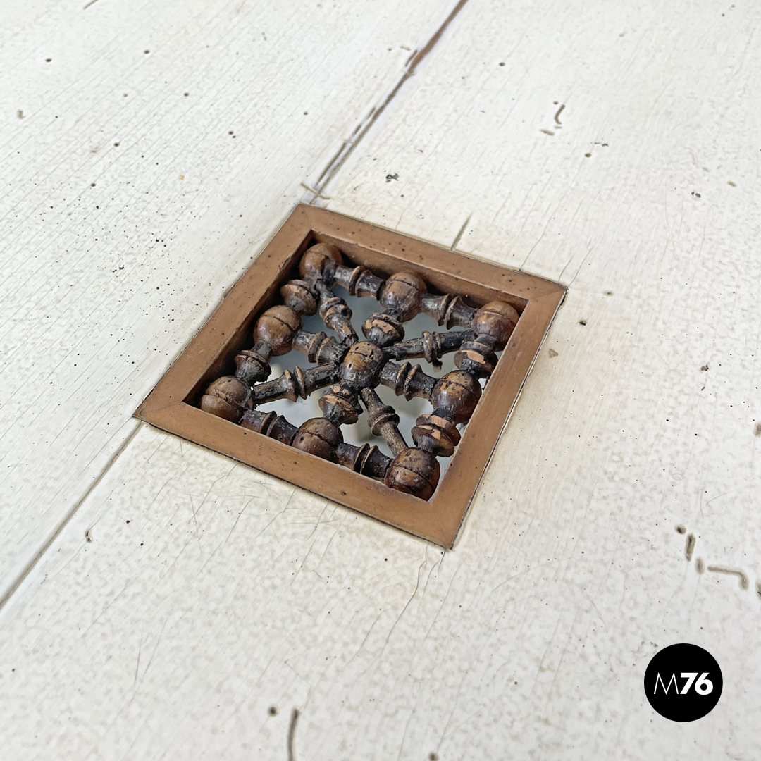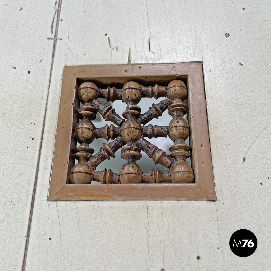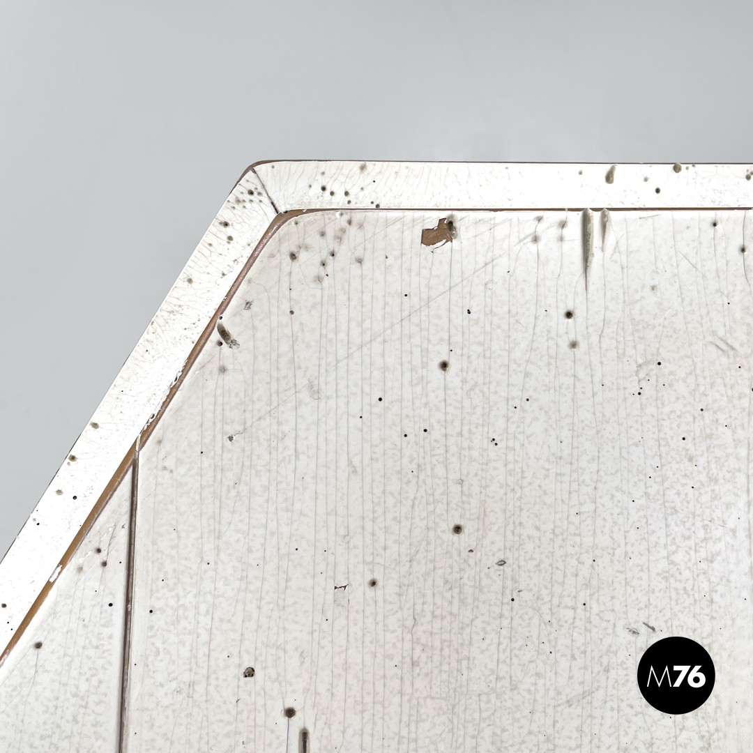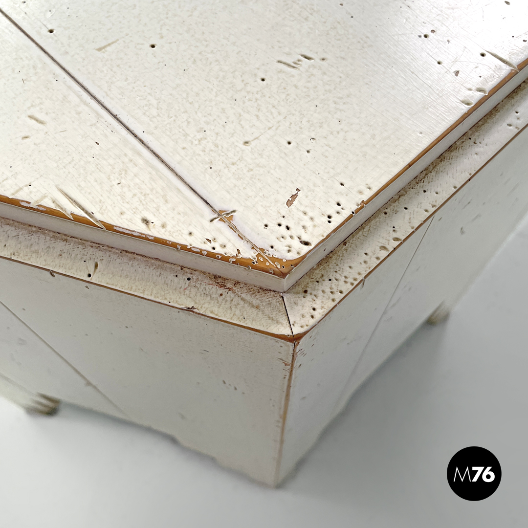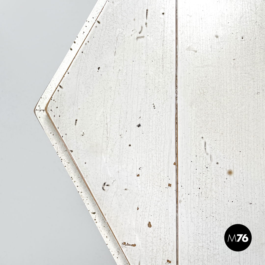 Coppia di tavoli da caffè esagonali in legno dipinti di bianco. Sul piano si trova un foro con una decorazione in legno lavorata. Le sei gambe presentano linee geometriche decorative che creano degli “scalini” che vanno a stringersi verso l’appoggio a terra. Utilizzabile anche come comodini.