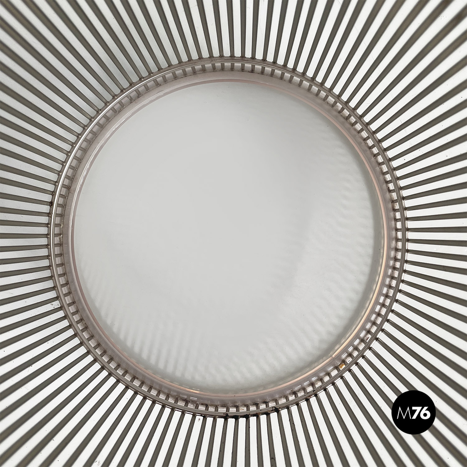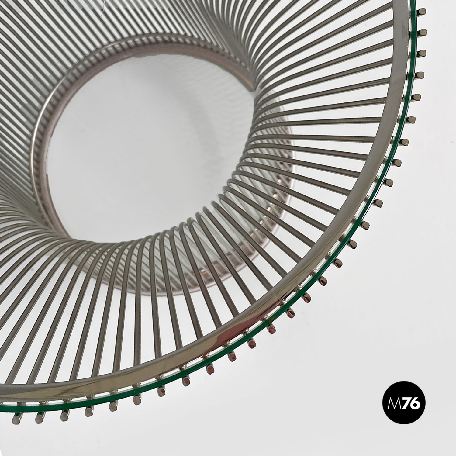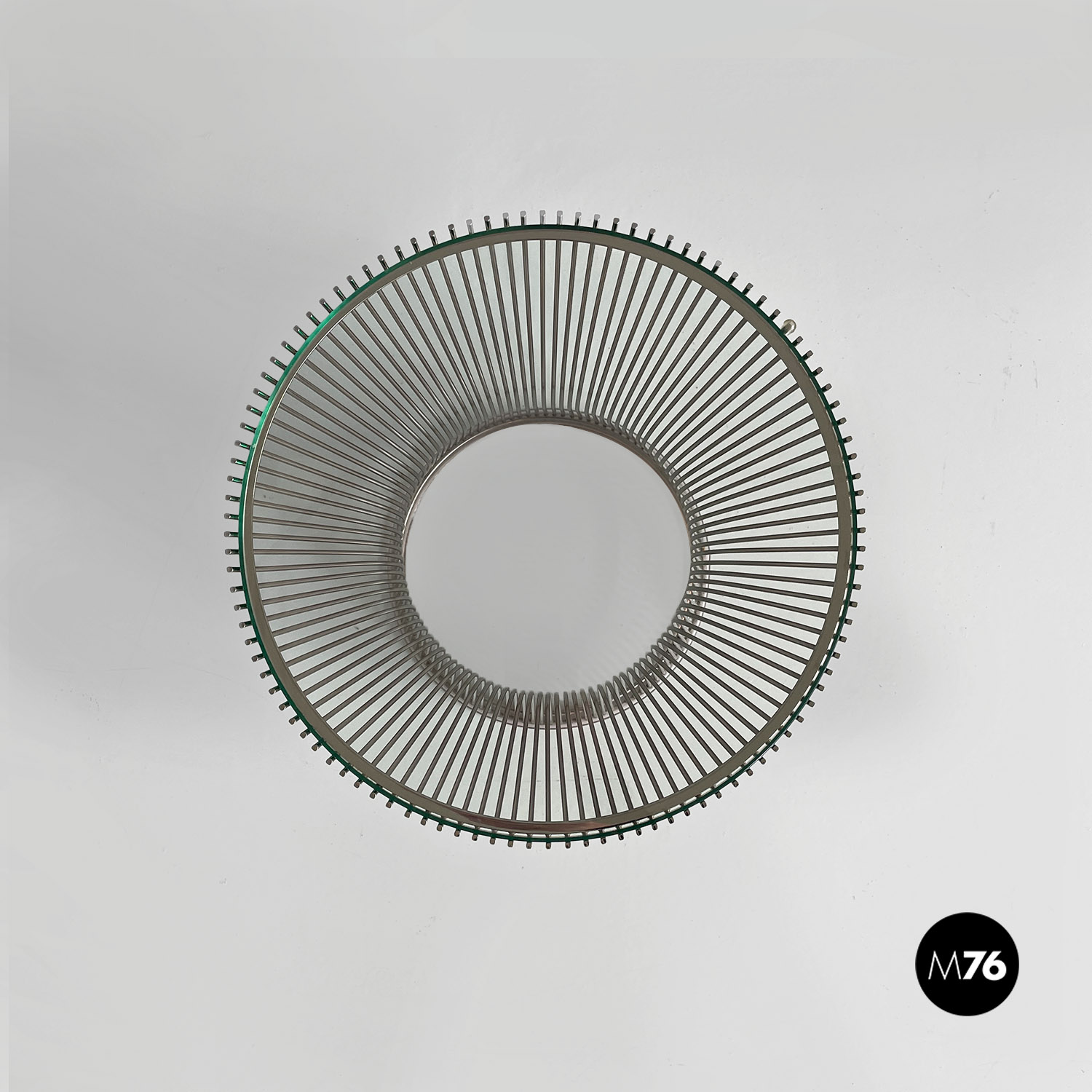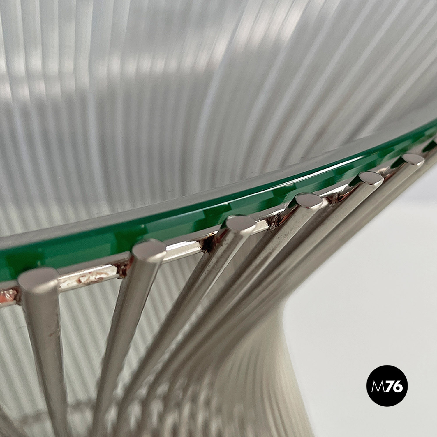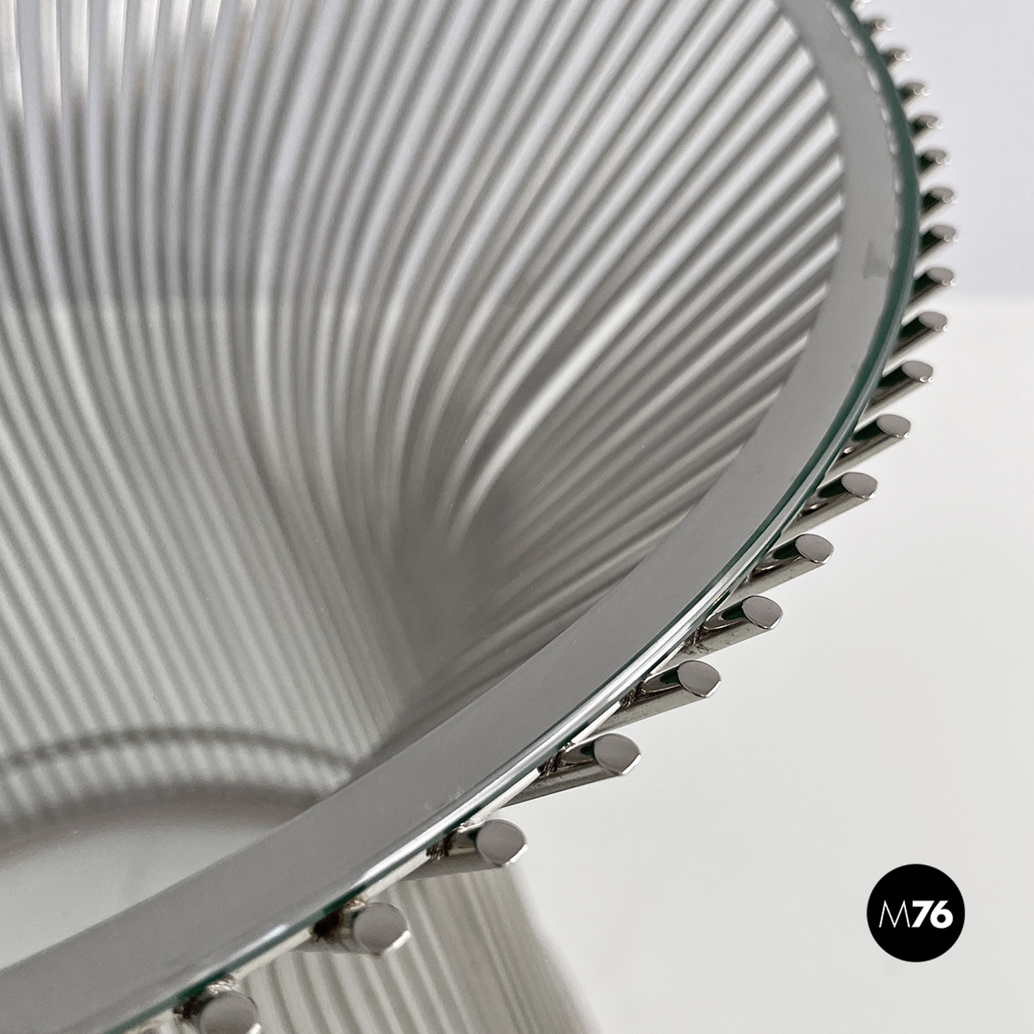 Coppia di tavolini tondi, con struttura composta da barre sottili di metallo cromato, saldate a un tondino di metallo orizzontale posto nella parte inferiore e uno nella parte superiore, che fungono sia da struttura portante che da ornamento. La base è sempre in metallo cromato e il piano è tondo e in cristallo trasparente.