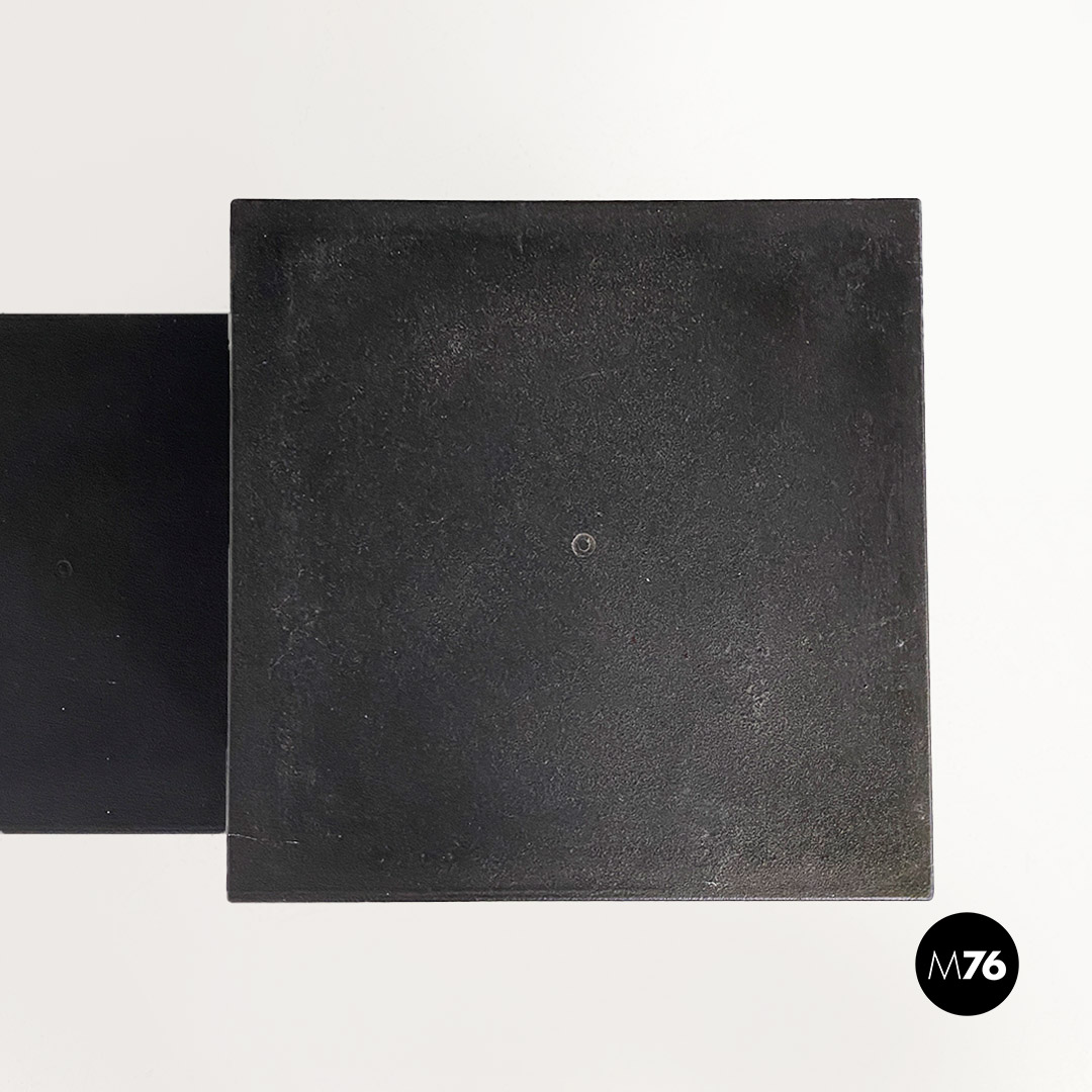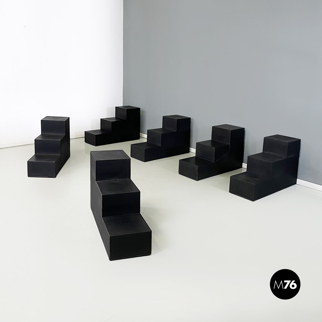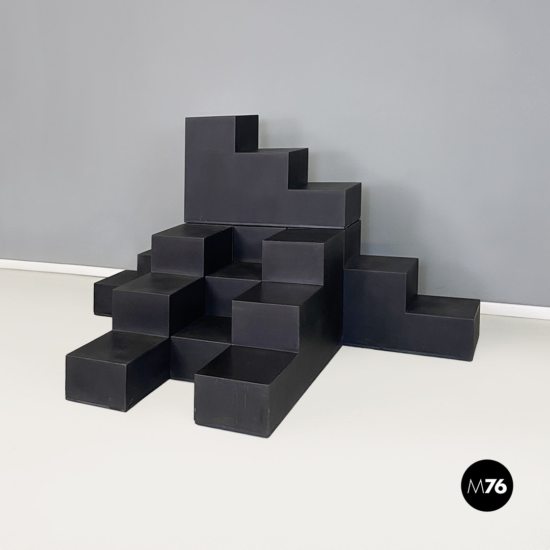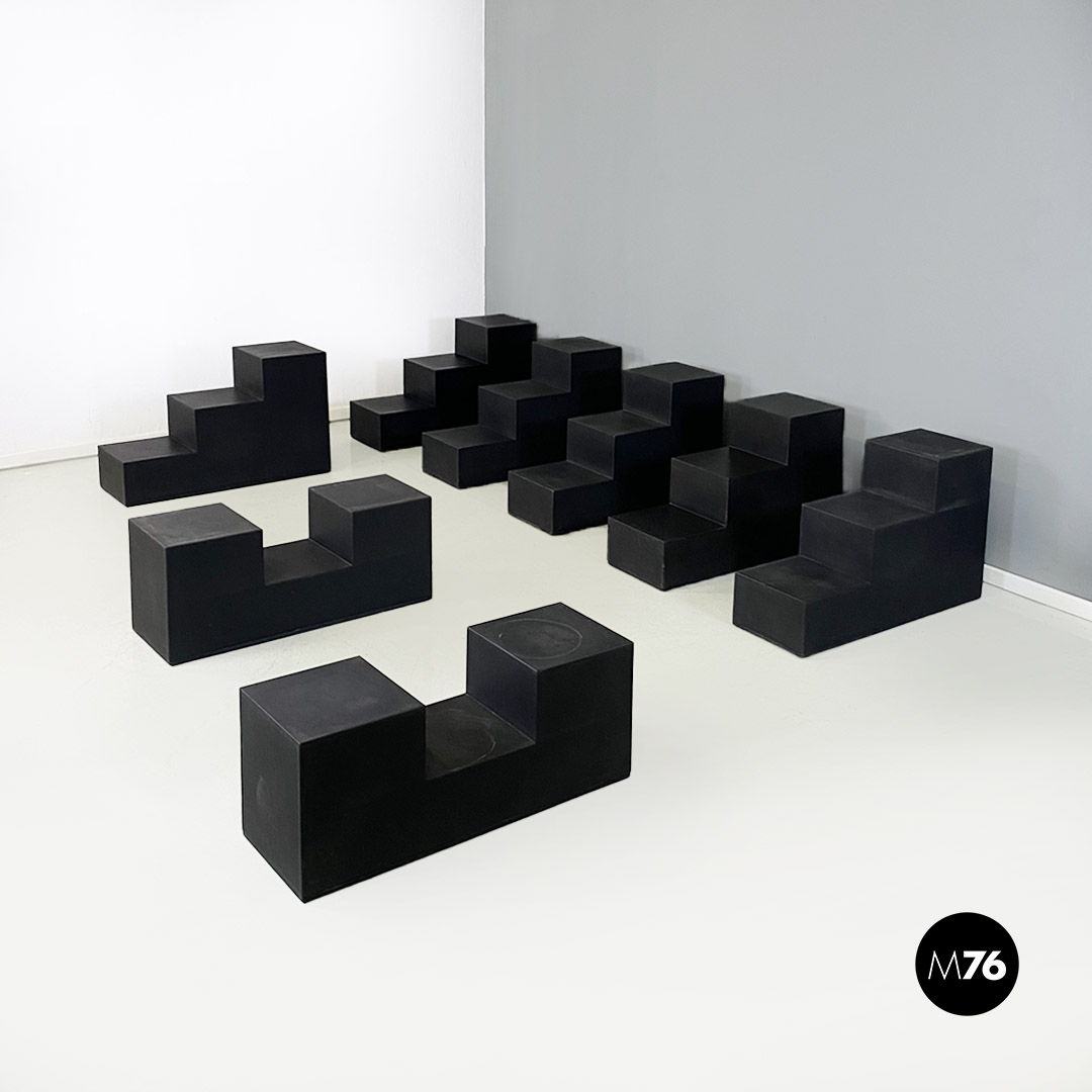 Set di sette tavoli da caffè modulari Gli Scacchi duraplum nero, con strutture geometriche a base rettangolare.