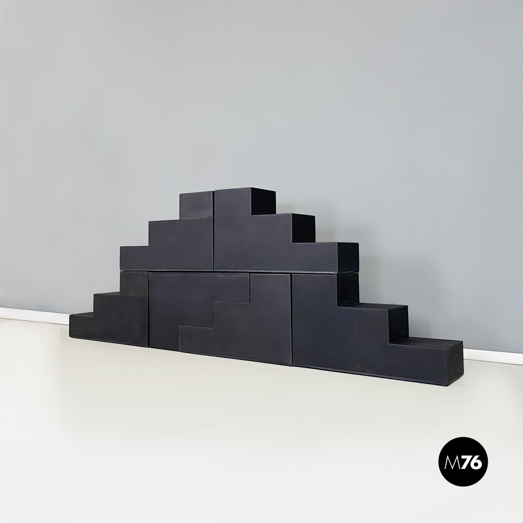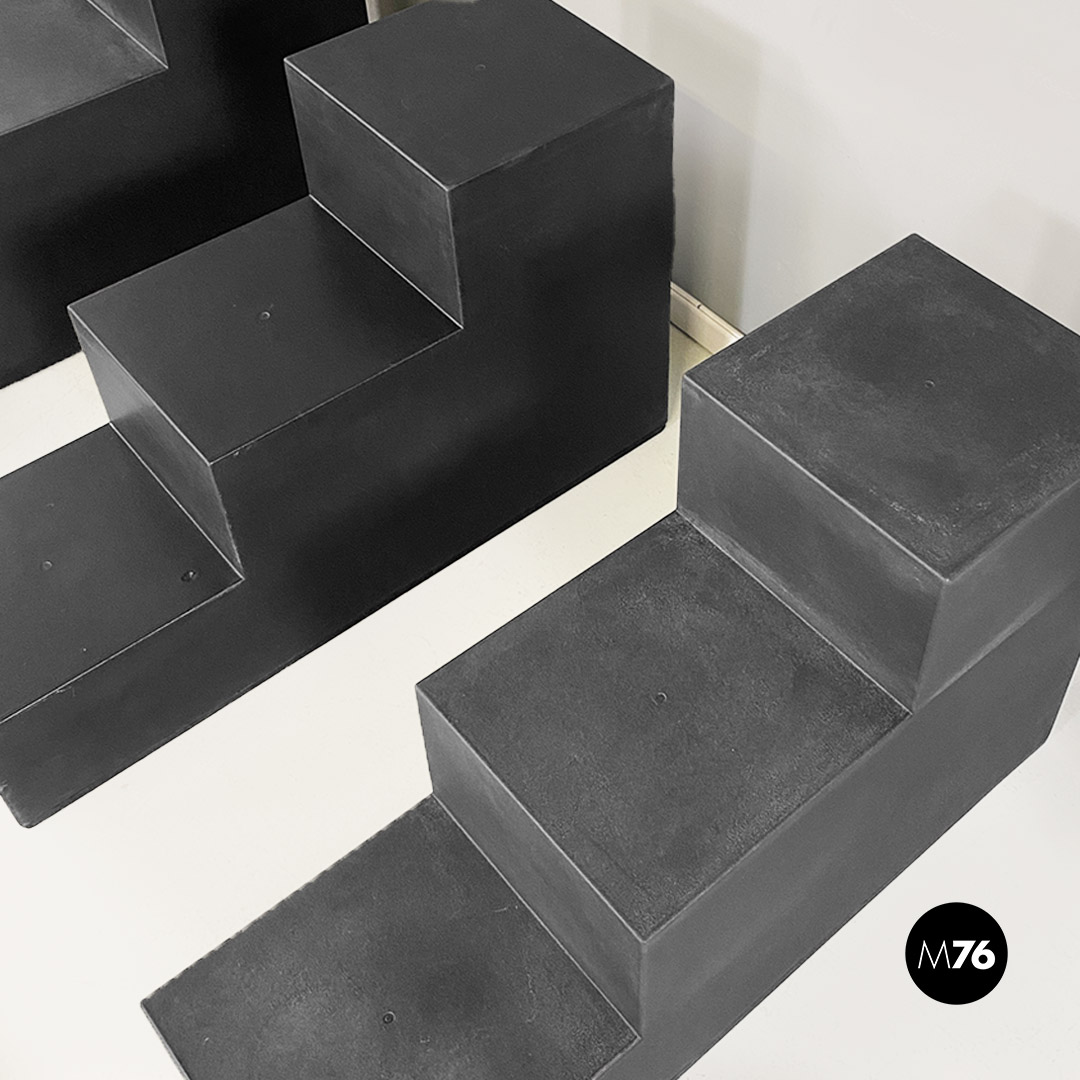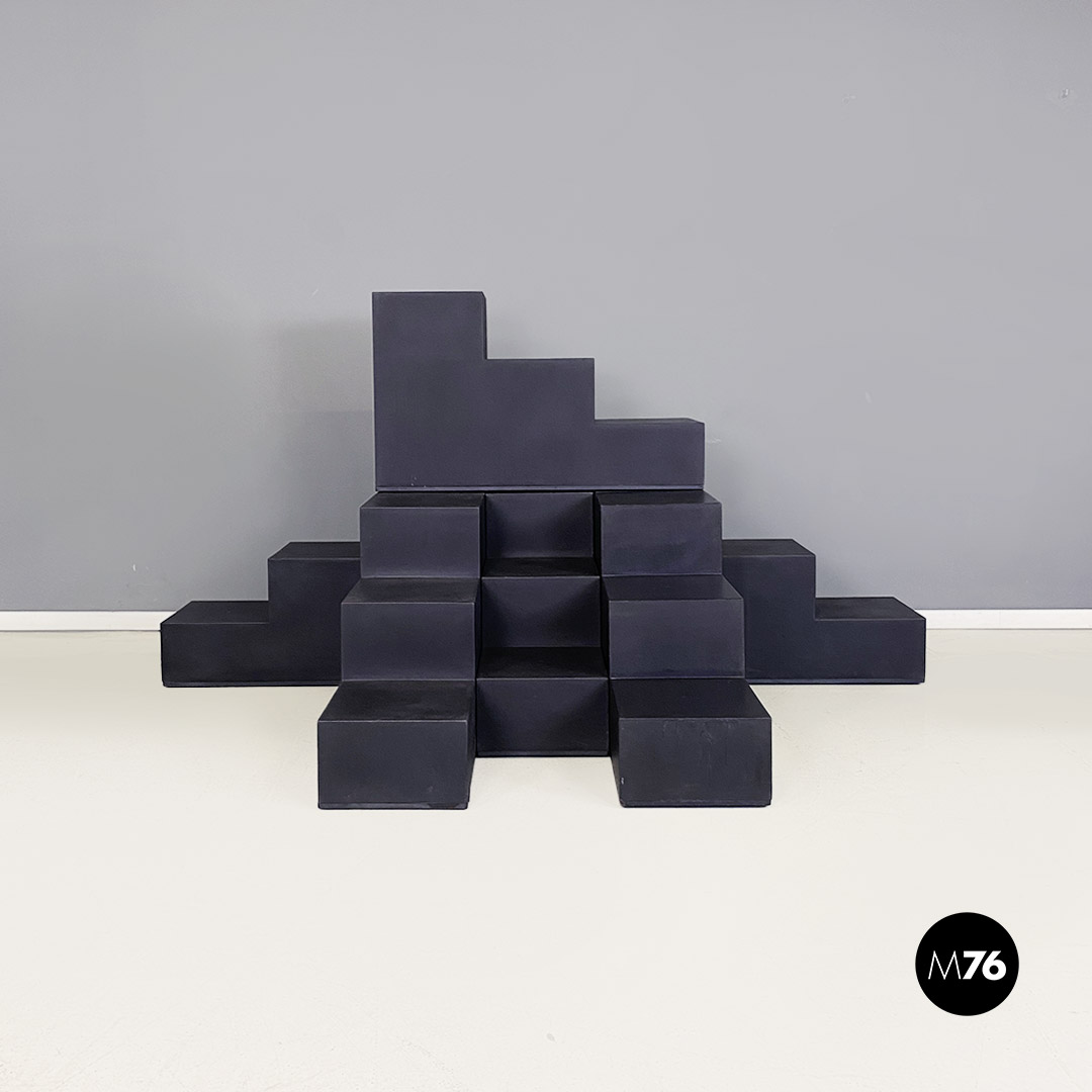 Set di sette tavoli da caffè modulari Gli Scacchi duraplum nero, con strutture geometriche a base rettangolare.