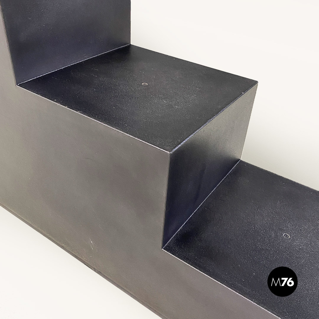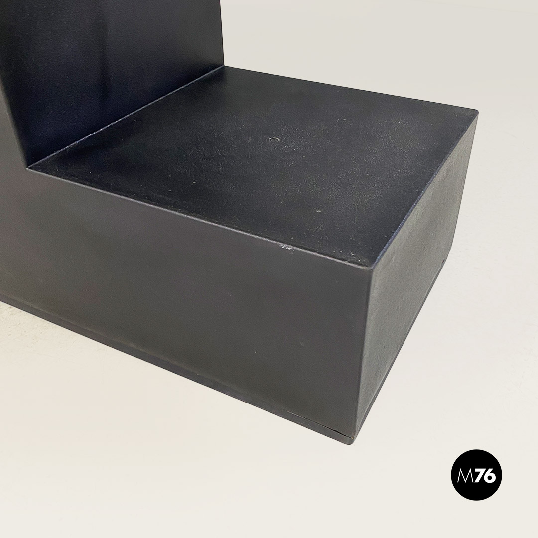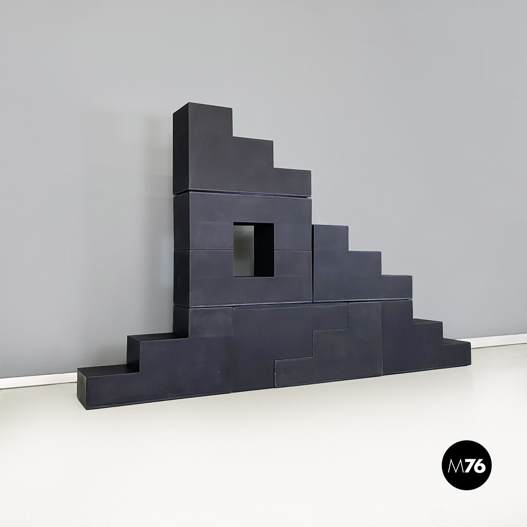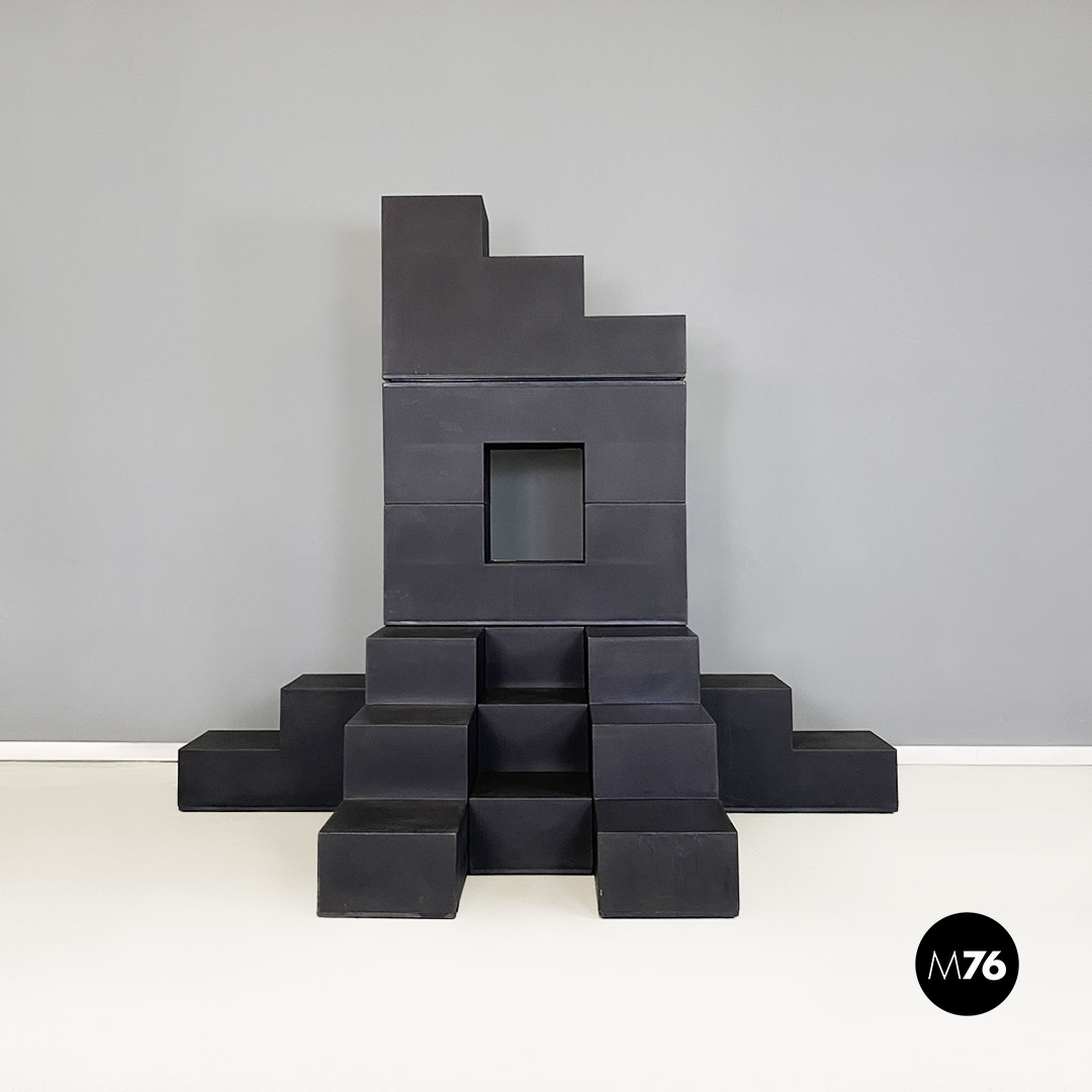Set di sette tavoli da caffè modulari Gli Scacchi duraplum nero, con strutture geometriche a base rettangolare.