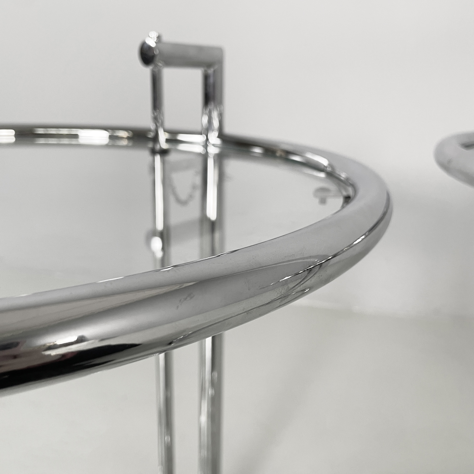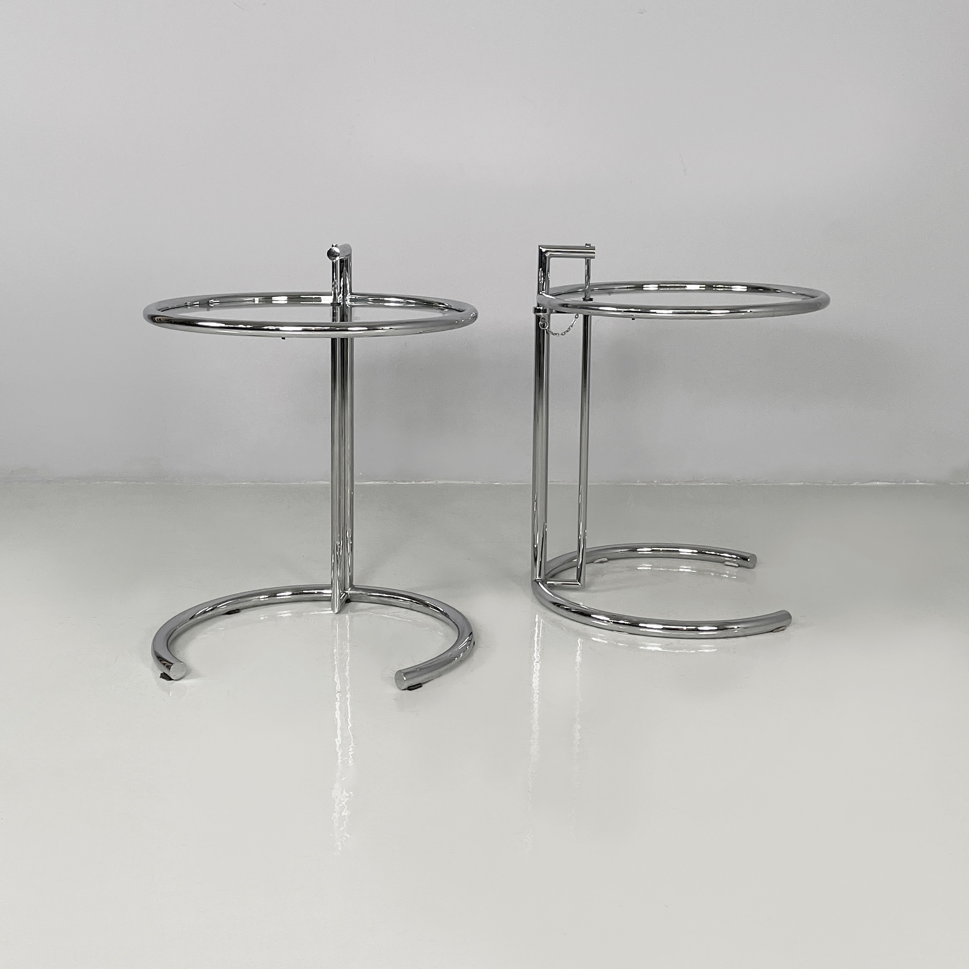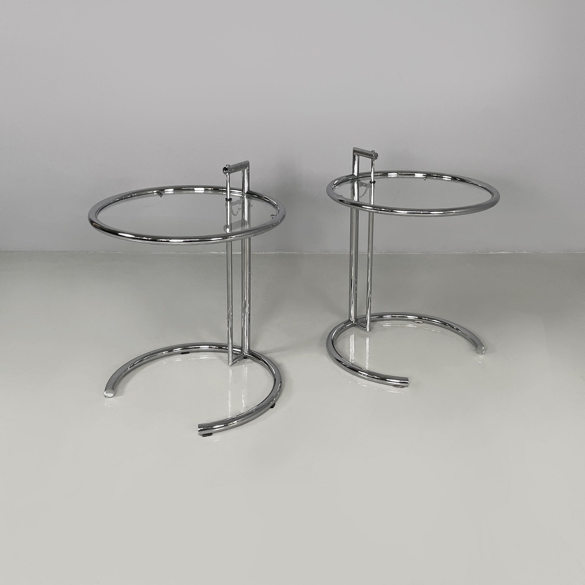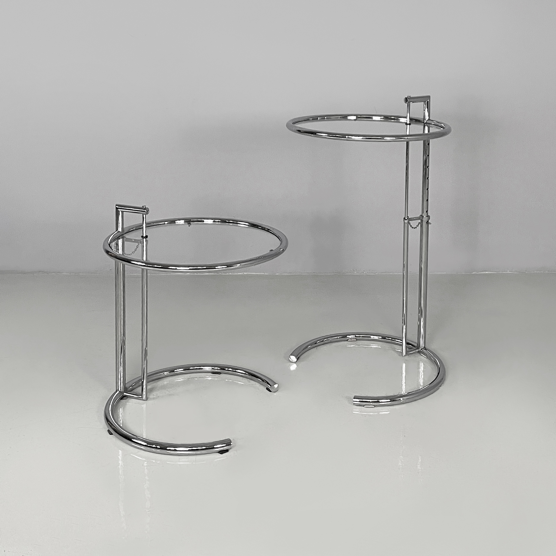 Coppia di tavoli da caffè con piano tondo in vetro. Il piano può essere regolato in altezza grazie alla struttura in tubolare di acciaio estraibile.